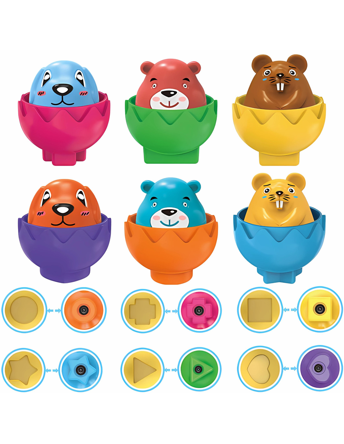 - - 6 colorful eggs with cheerful animals inside