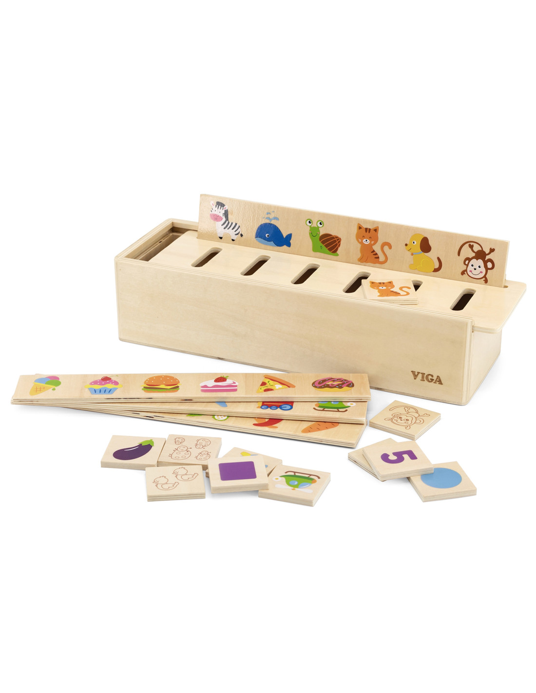 The Wooden Educational Sorter from the renowned VIGA brand is the perfect toy for children just starting to explore the world. This attractive, high-quality wooden box features six compartments on a removable lid, into which you can place wooden blocks with the appropriate category. The set includes four long boards and 48 wooden blocks with categories for vegetables, fruits, transportation, shapes, animals, and numbers. Place one of the boards on the lid and then find the matching picture to place it in the appropriate compartment. This game will help your child learn basic everyday materials and categorize them.