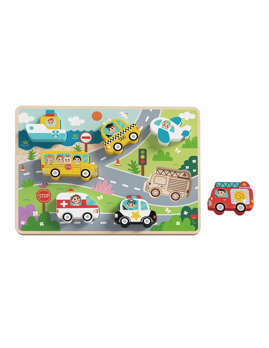- - the set includes: a board with recesses and 7 elements representing different vehicles on the road or in the sky,