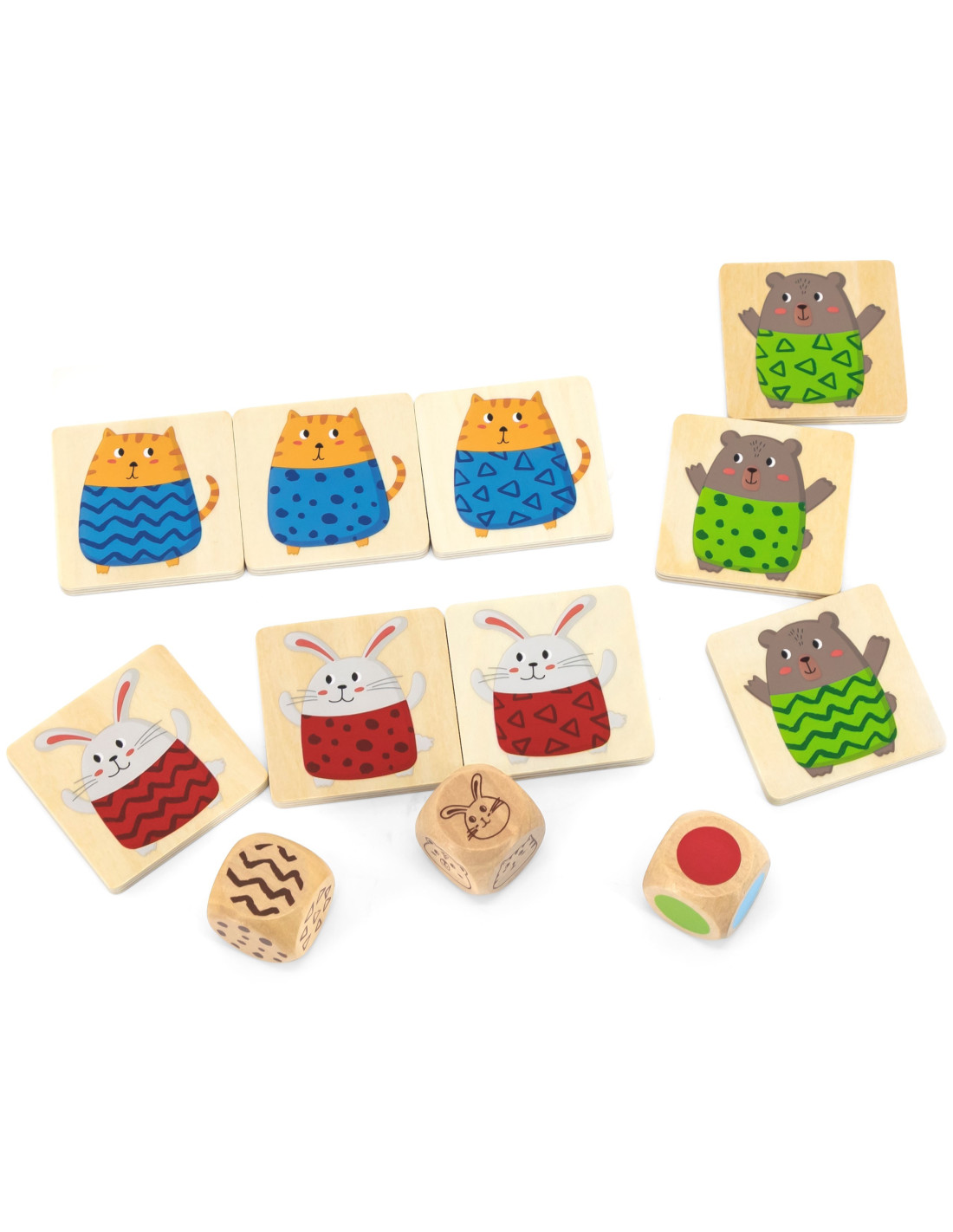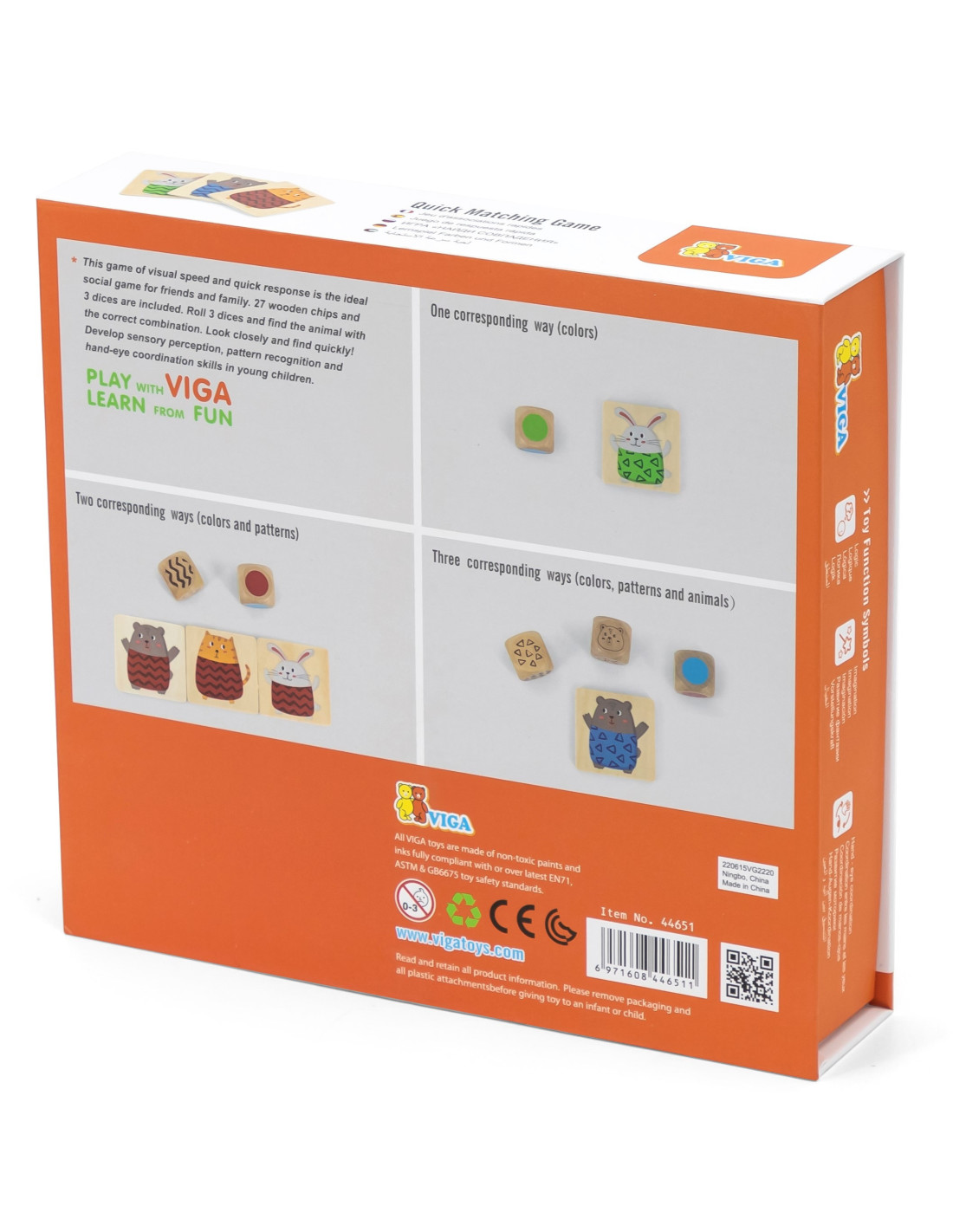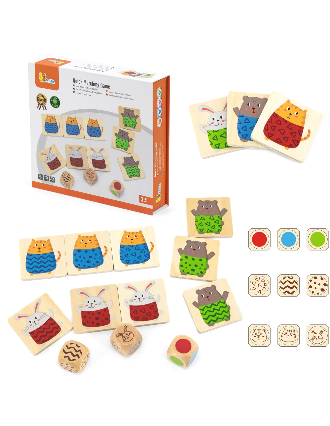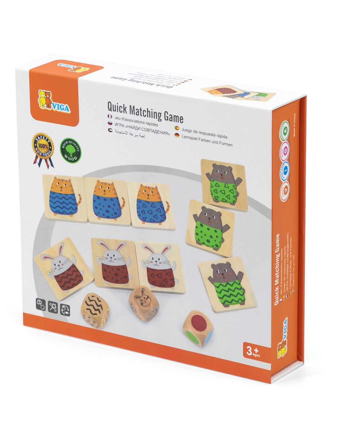 The wooden quick guessing game by VIGA is the perfect party game for friends and family. Your child's task is to roll a selected number of dice (from 1 to 3) and find the correct animal with the matching pattern on its shirt and in the correct color. The entire thing is made of wood and painted with non-toxic paints.