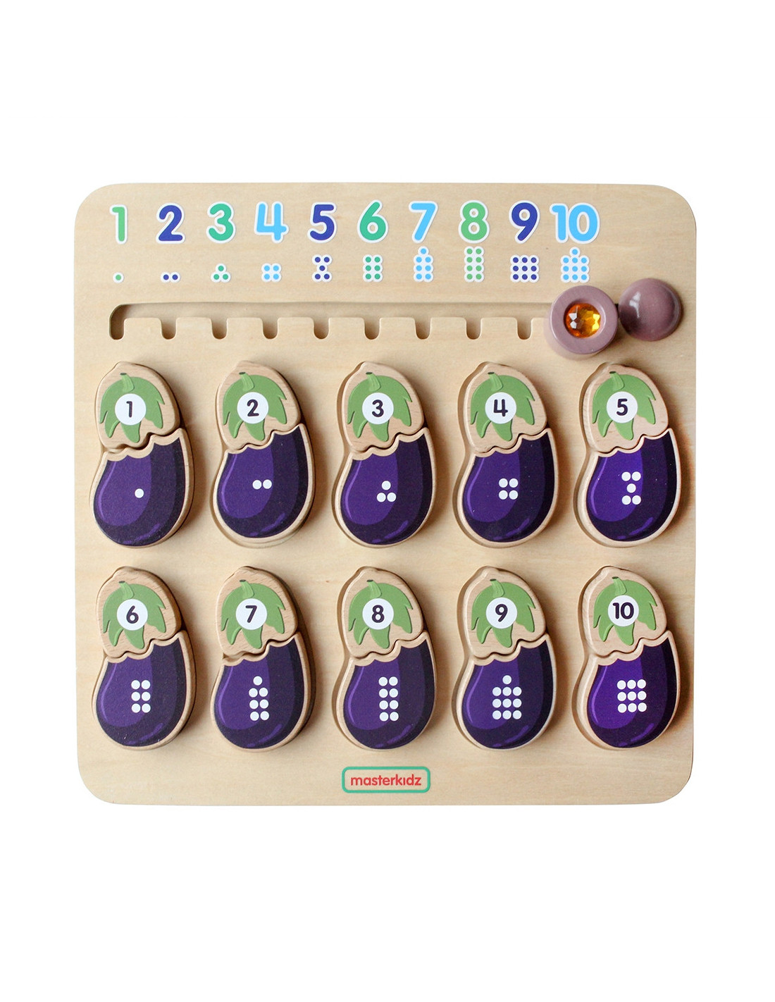 A wooden board for learning numbers and colors from the MASTERKIDZ brand. Designed to help children develop their sensory skills , children must match the correct eggplant pieces . One piece represents a number, and the other represents the corresponding number of dots. At the top, there's a slider with matching numbers and dots in the correct order. When assembled, it also develops fine motor skills .