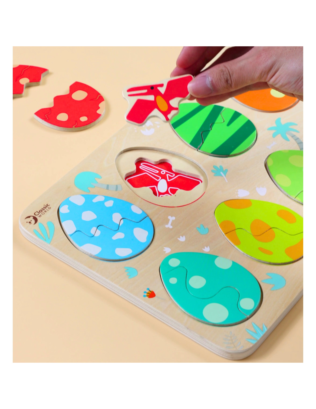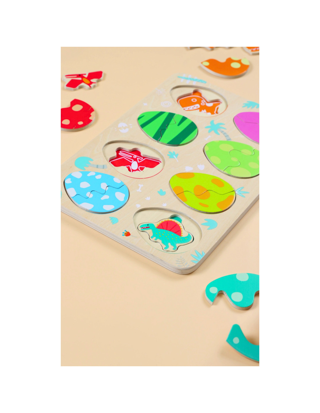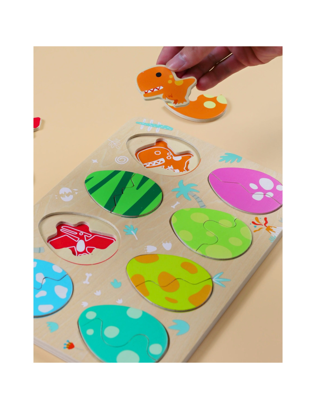 The three-layer design allows children to match the eggs to the dinosaurs hidden beneath them, while the bottom layer reveals simple drawings that help them match the dinosaurs to their corresponding locations. This toy promotes learning about shapes and colors, logical thinking, and creativity in a fun way.