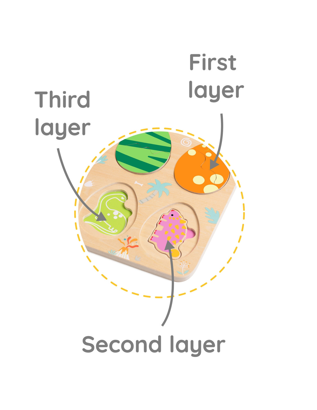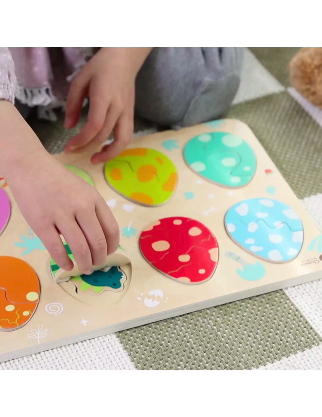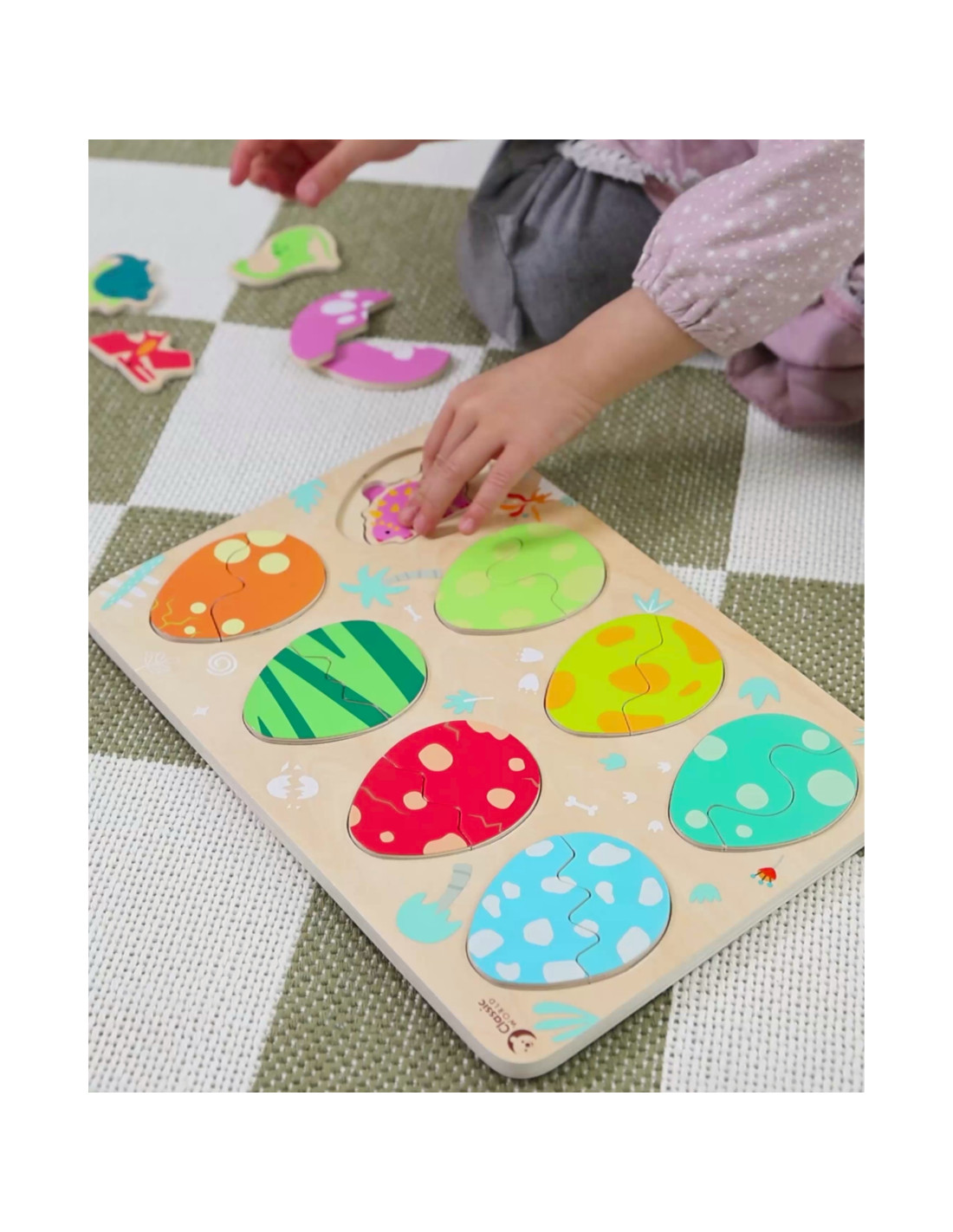The three-layer design allows children to match the eggs to the dinosaurs hidden beneath them, while the bottom layer reveals simple drawings that help them match the dinosaurs to their corresponding locations. This toy promotes learning about shapes and colors, logical thinking, and creativity in a fun way.