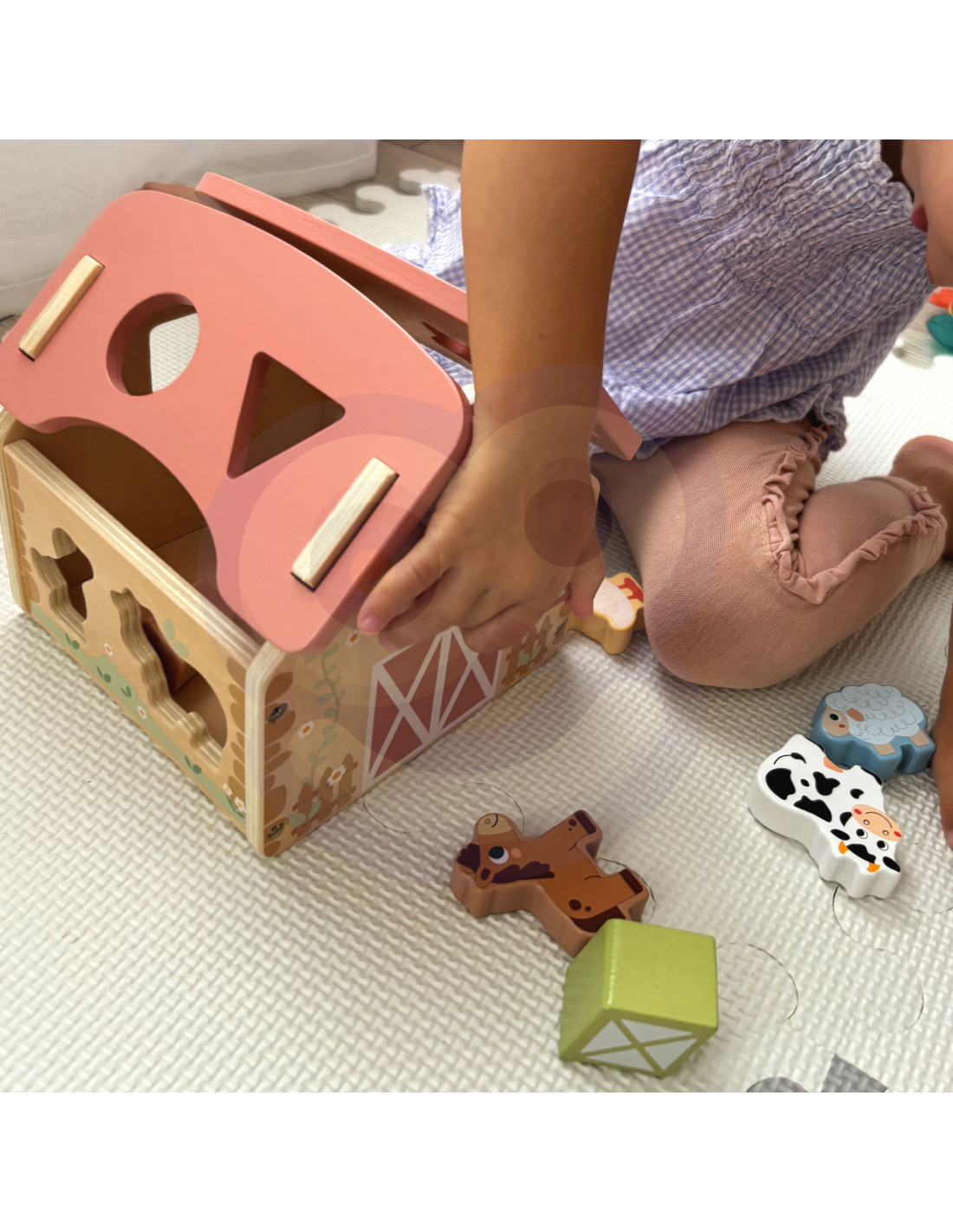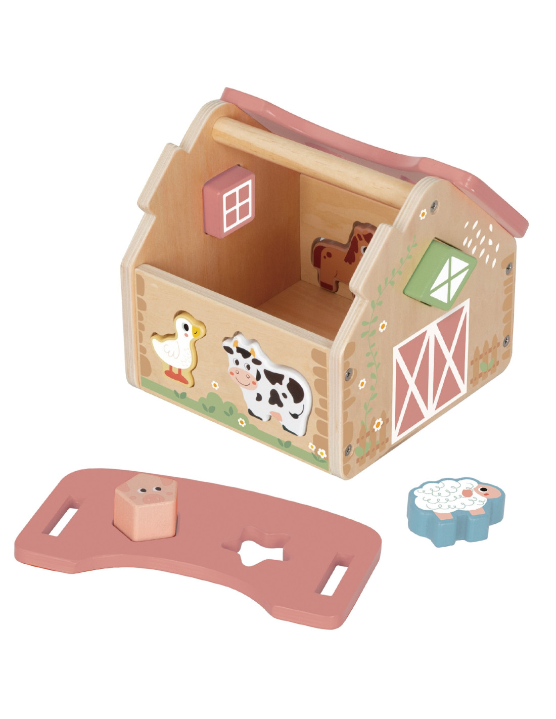 The Pastel Farm Sorter from WOOPIE GREEN is the perfect educational toy for toddlers aged 18 months and up. Its country-style setting encourages creative play, teaching them to recognize shapes, colors, and animals. It combines learning with fun, developing imagination, logical thinking, and manual dexterity. The game involves matching wooden animals and blocks to the corresponding holes in the barn walls. Toddlers develop hand-eye coordination, patience, and concentration. Learning by doing is the best way to ensure lasting learning. The removable roof facilitates access to the interior, and a convenient handle allows for easy transport on trips or to visit grandparents.