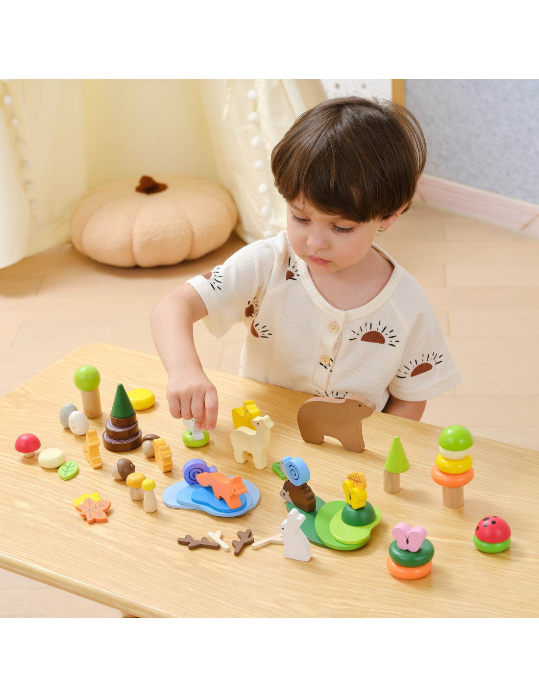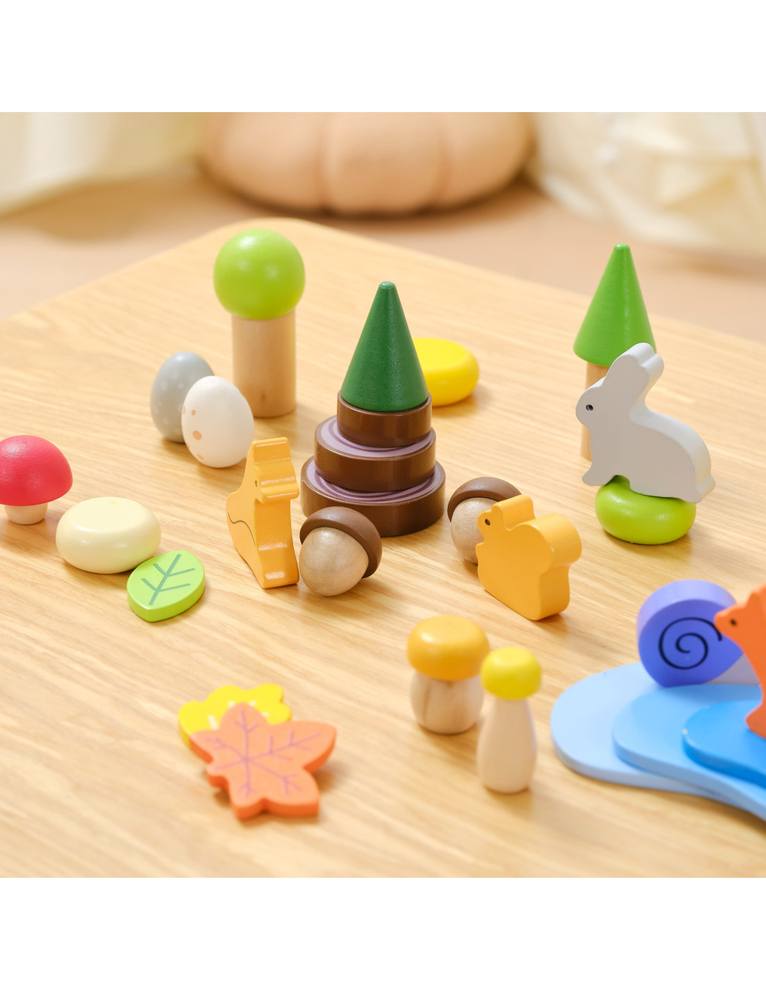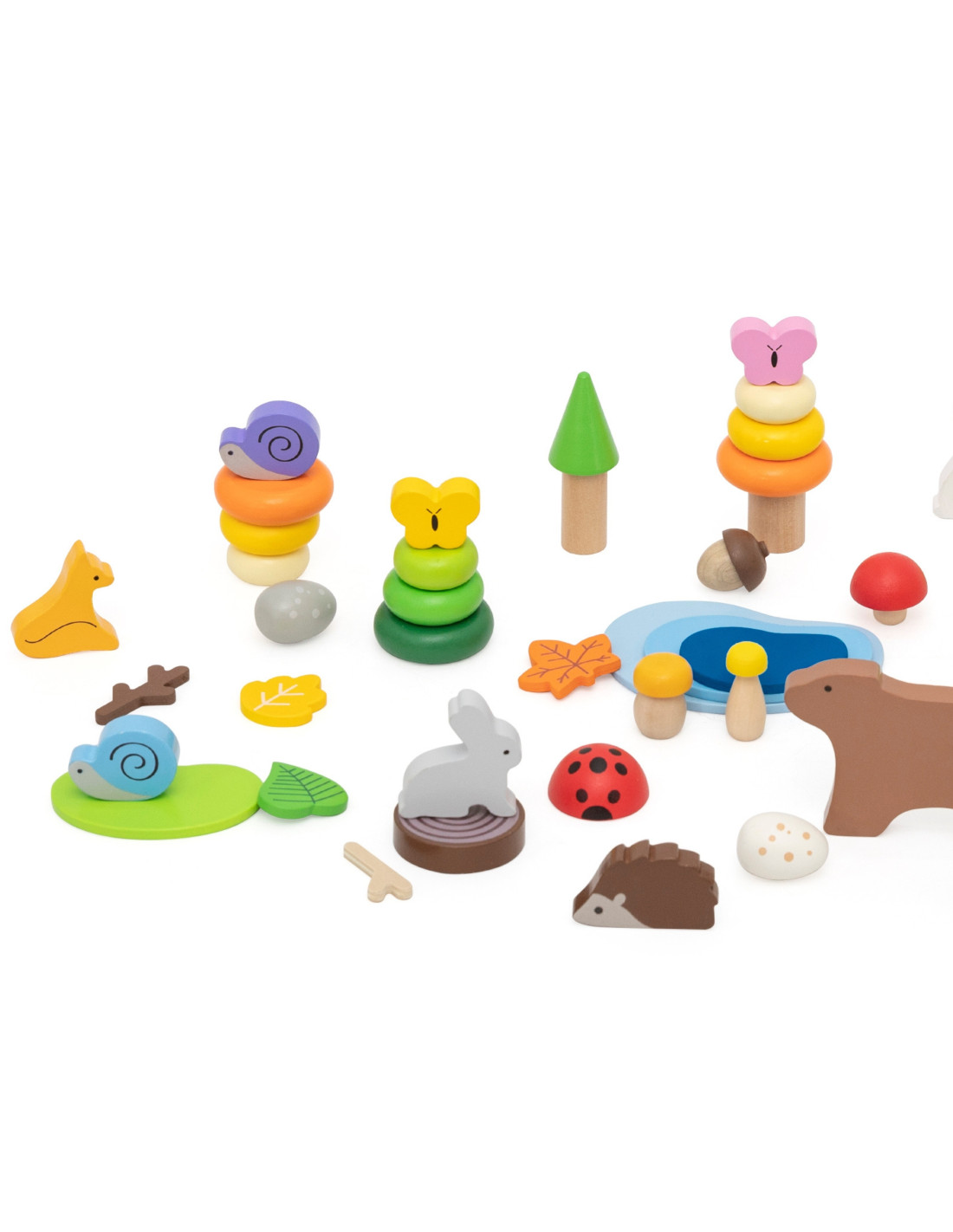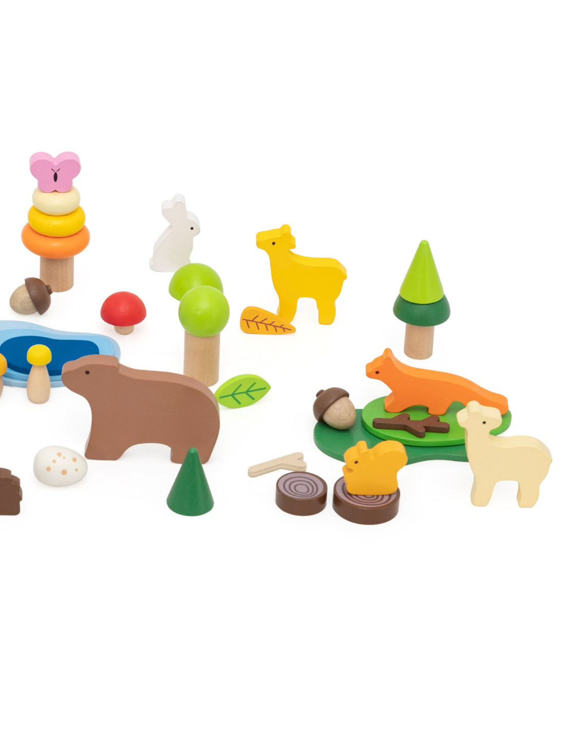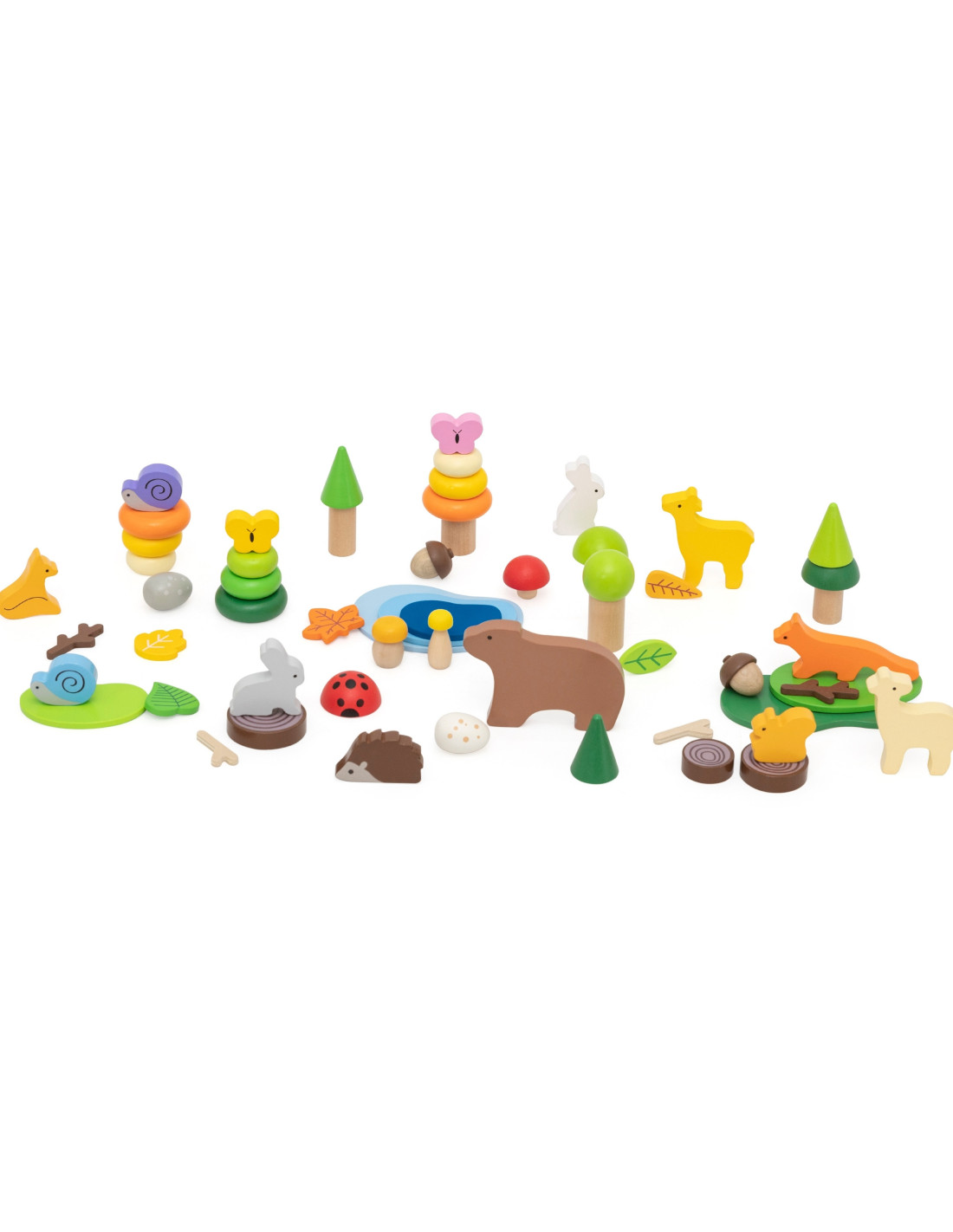 - - Forest theme : animal figurines (bear, deer, fox, hare, snail, butterfly, ladybug) and nature elements (trees, lake, mushrooms, leaves)