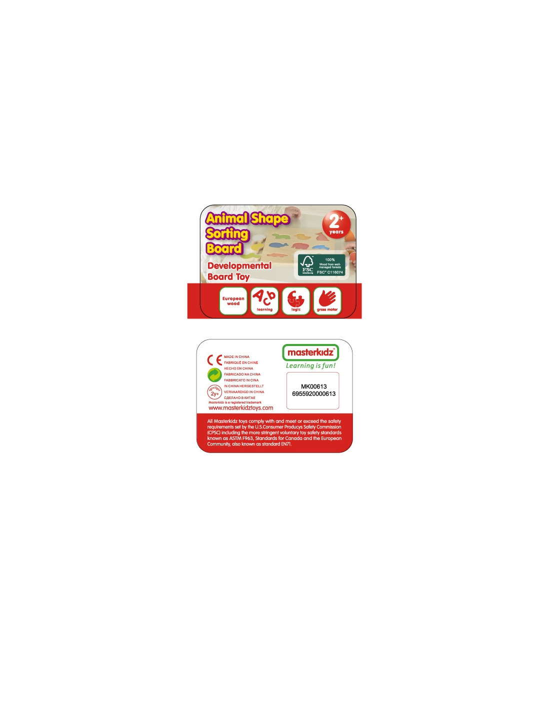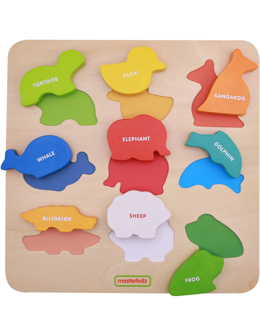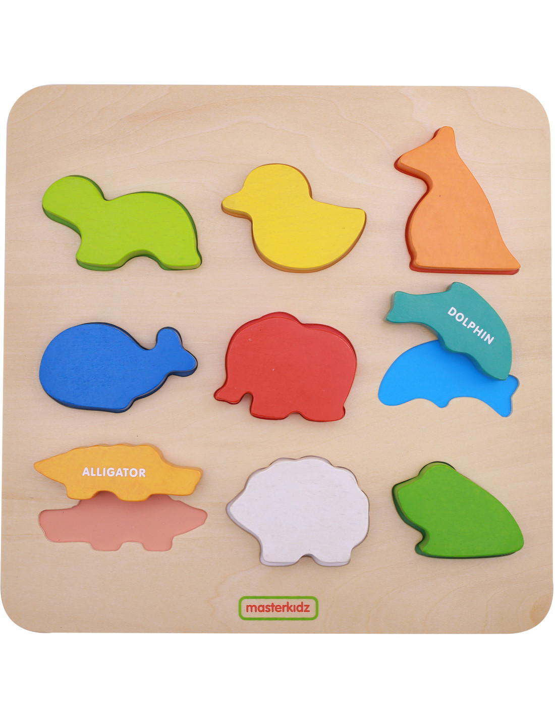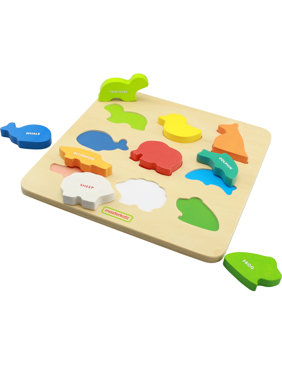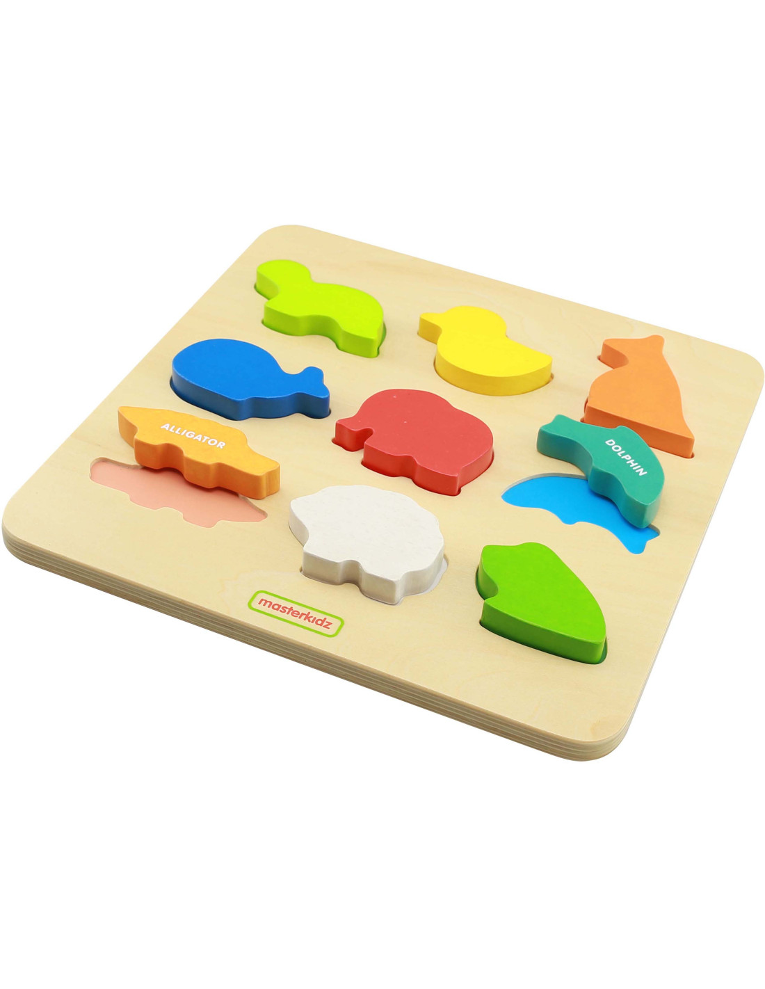 The Colorful Animals Shape Sorter by Masterkidz is a great wooden toy for children with many uses. This toy is perfect for more than just entertaining your child. Thanks to the wooden blocks shaped like colorful animals, your little one can learn their names in English. Another purpose of the toy is to develop logical thinking skills. Children must match the creatures to the corresponding holes in the wooden board, which requires concentration and analysis of the shapes. Once they find the correct shape, the child must then place it in the correct hole, requiring eye-hand coordination.