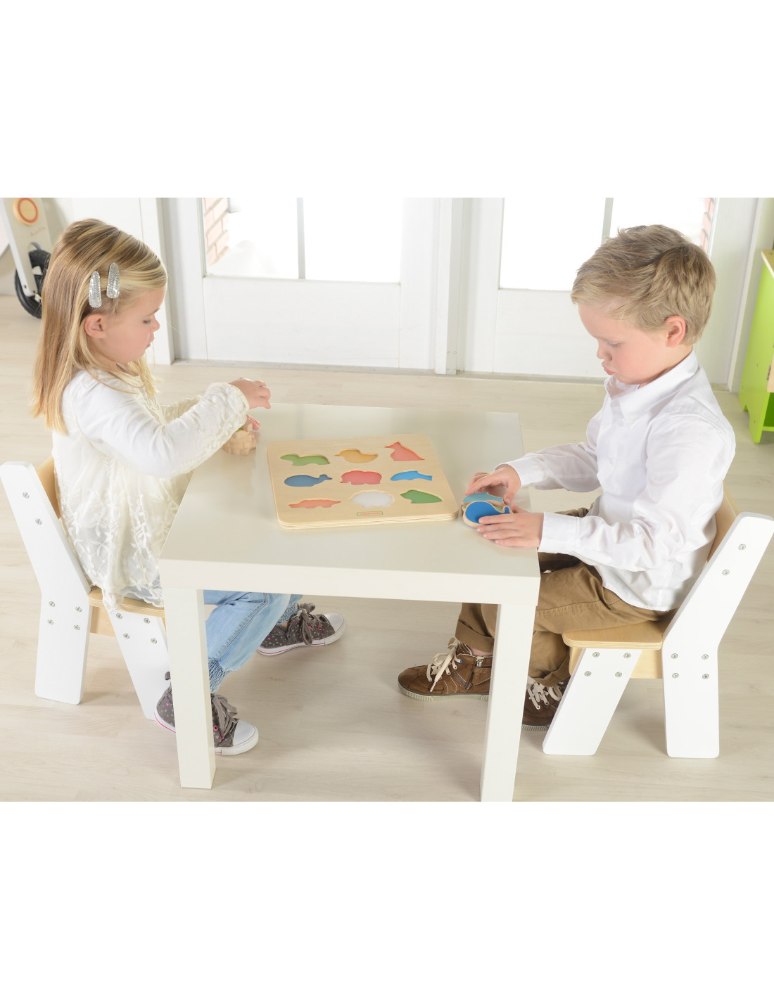 - - There are grooves on the board into which you need to match the appropriate wooden blocks - animals.