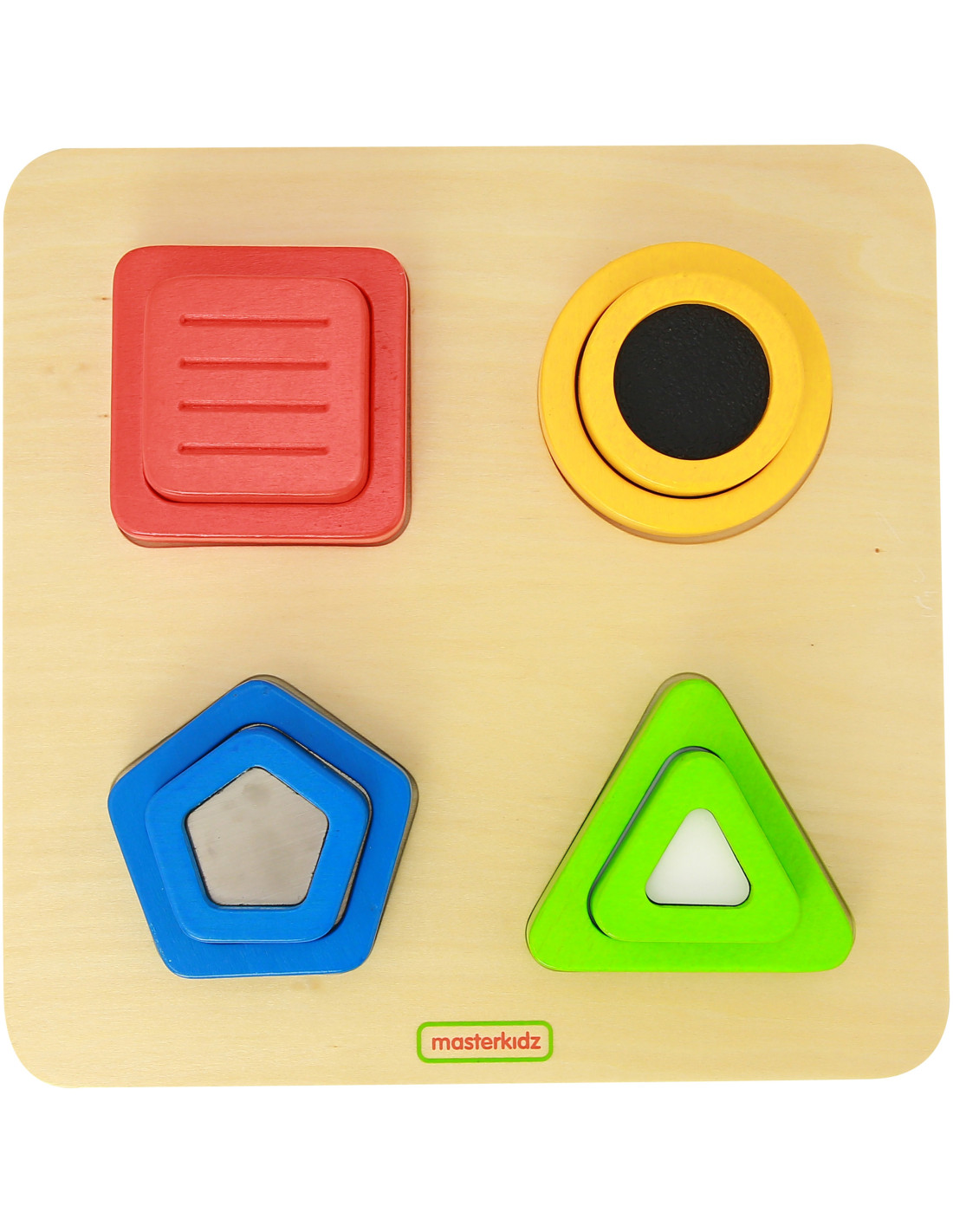 A fantastic interactive wooden toy from Masterkidz that will help develop your child's sense of touch . This wooden sorter combines several important functions. Children can combine shapes, colors, and even the surface textures of the blocks. The set includes four pairs of matching wooden blocks, which are placed first on a wooden board and then in pairs inside each other.