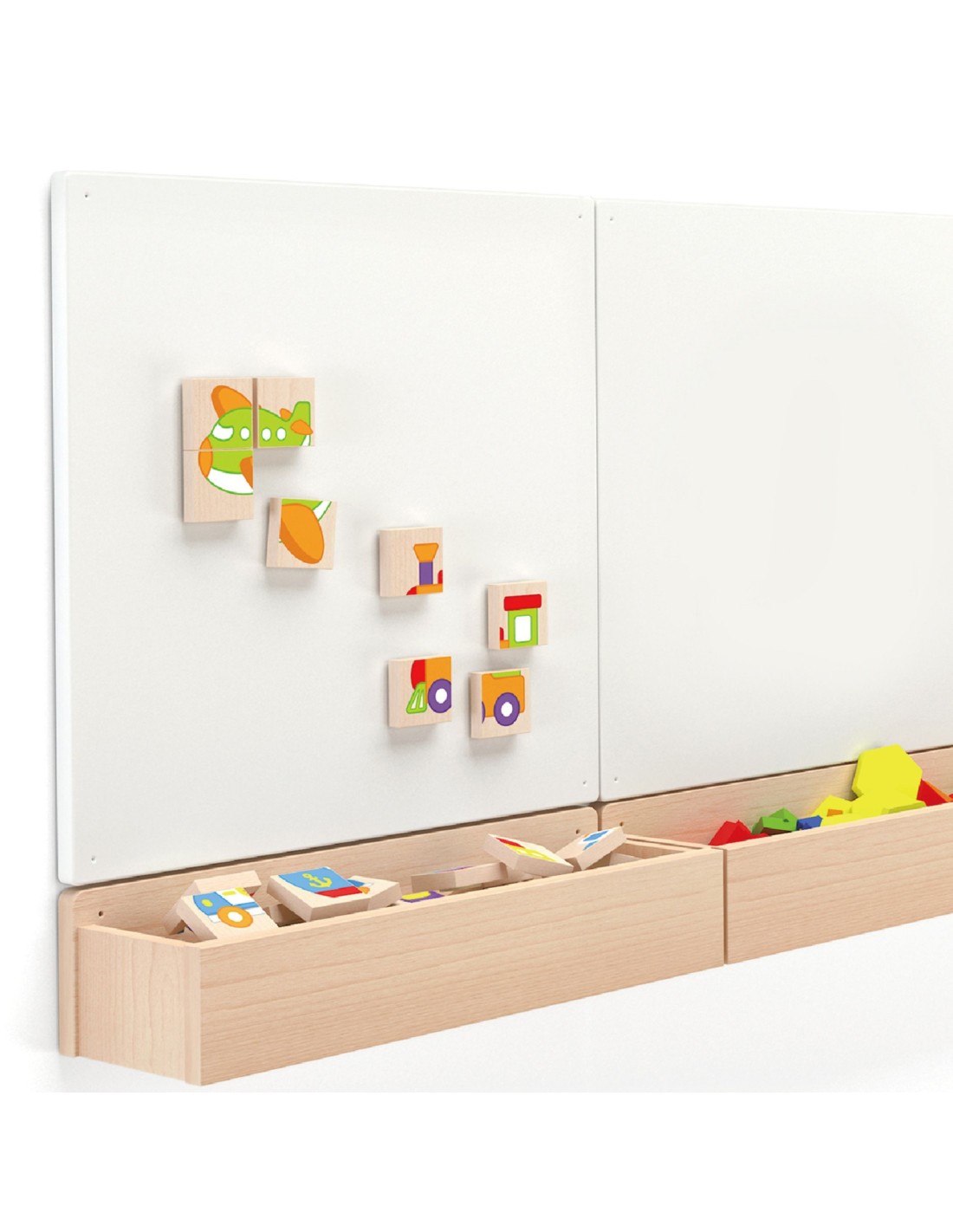 Each image consists of four blocks that, when connected, form a whole. They can be attached to a board to create a picture or inspire drawings of similar vehicles. The blocks are made of wood and painted with non-toxic paints, making them completely safe for children.