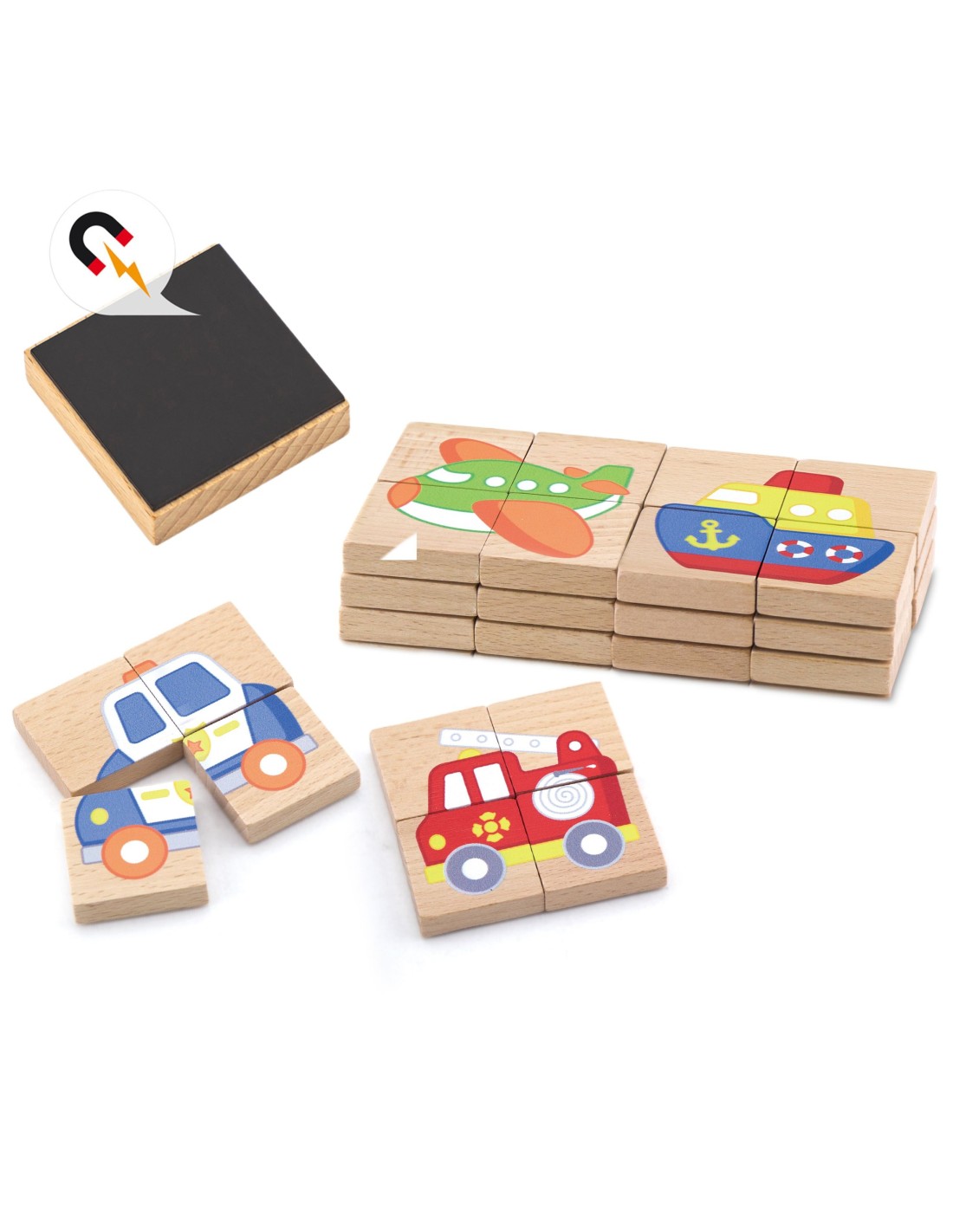 This magnetic puzzle is a great toy that will help your child develop logical thinking and learn new ways of getting around. It allows you to assemble up to eight different images representing different vehicles.