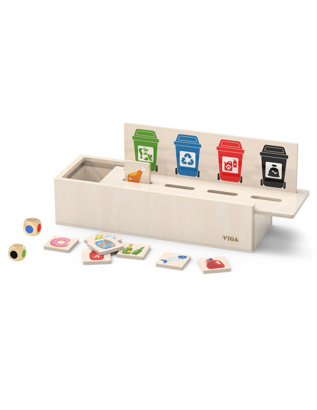 - - each tile has a picture of waste on one side and a smiley face in the color of the waste bin on the other,