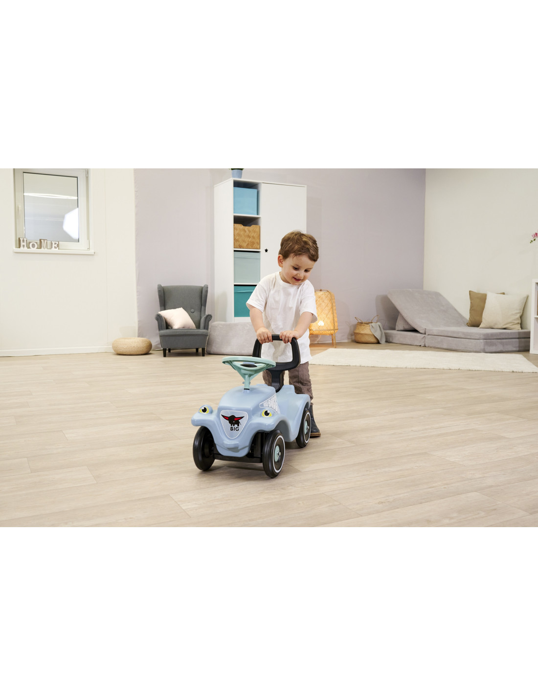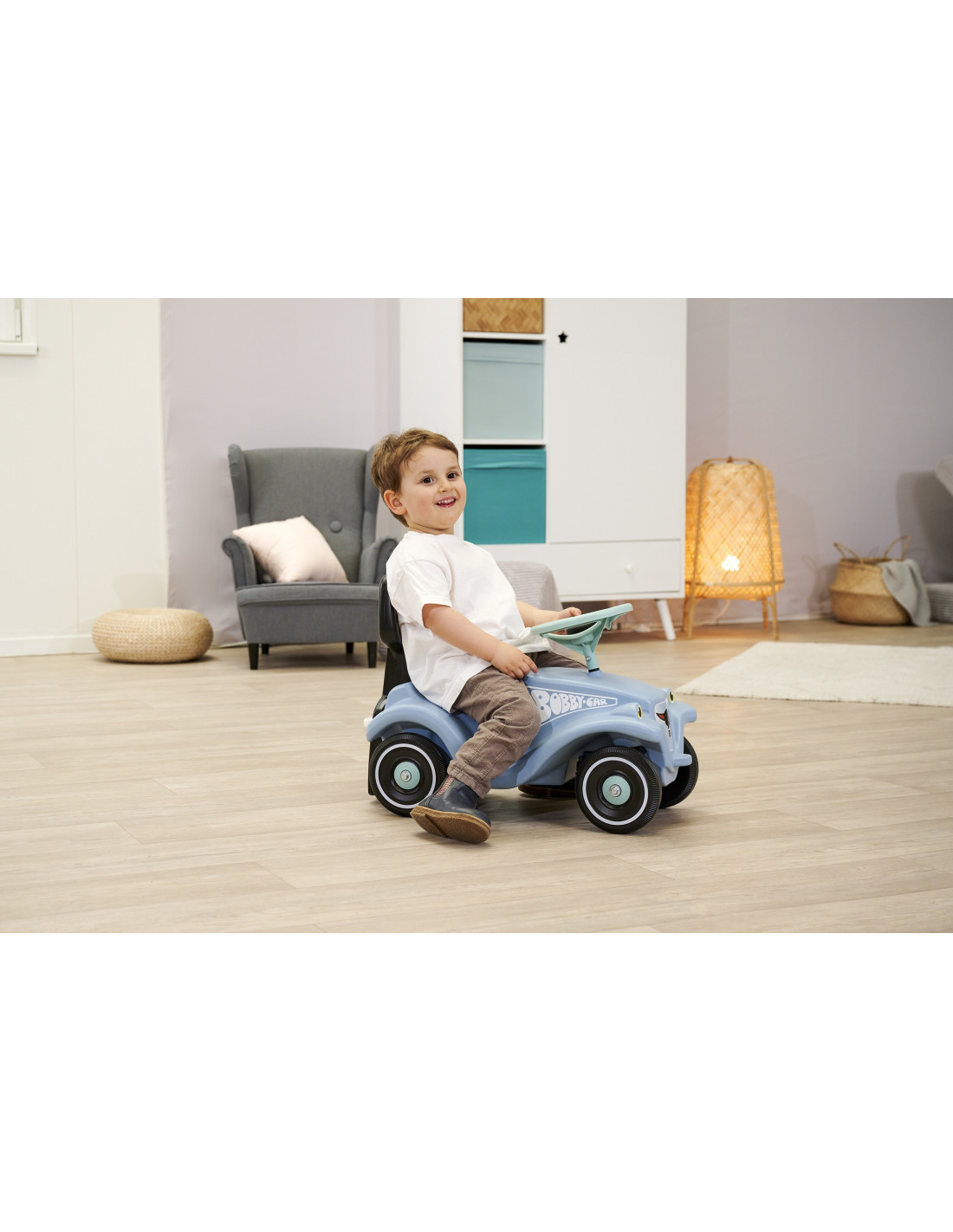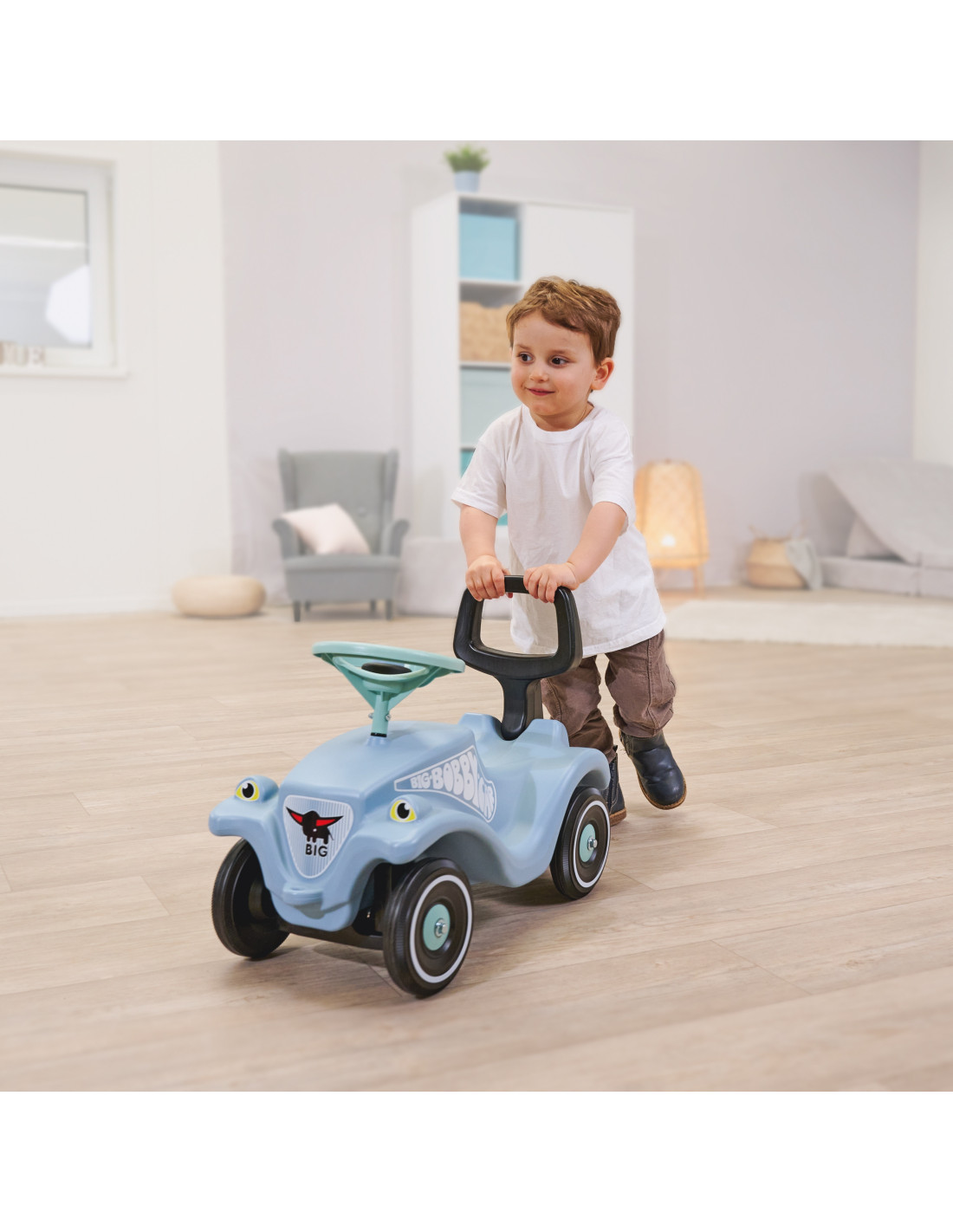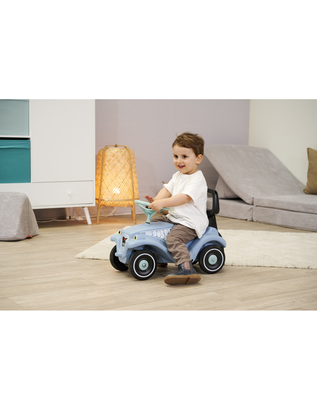 BIG Bobby Car Classic Blue Ride-On. Perfect for the youngest drivers! The BIG Bobby Car Classic in light blue is a stable and maneuverable ride-on that supports children's motor development. The set includes a practical walker that also serves as a backrest, ensuring comfort and safety for little ones during their first attempts at walking and riding. With its pastel green details and sturdy construction, this model will delight both girls and boys.
