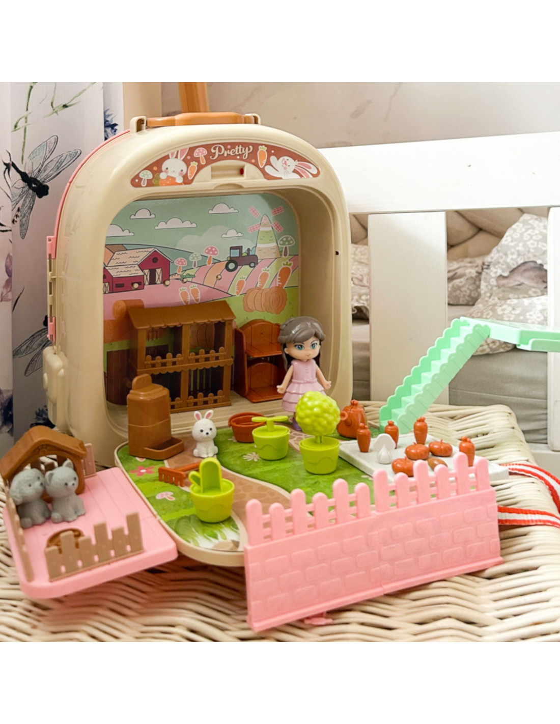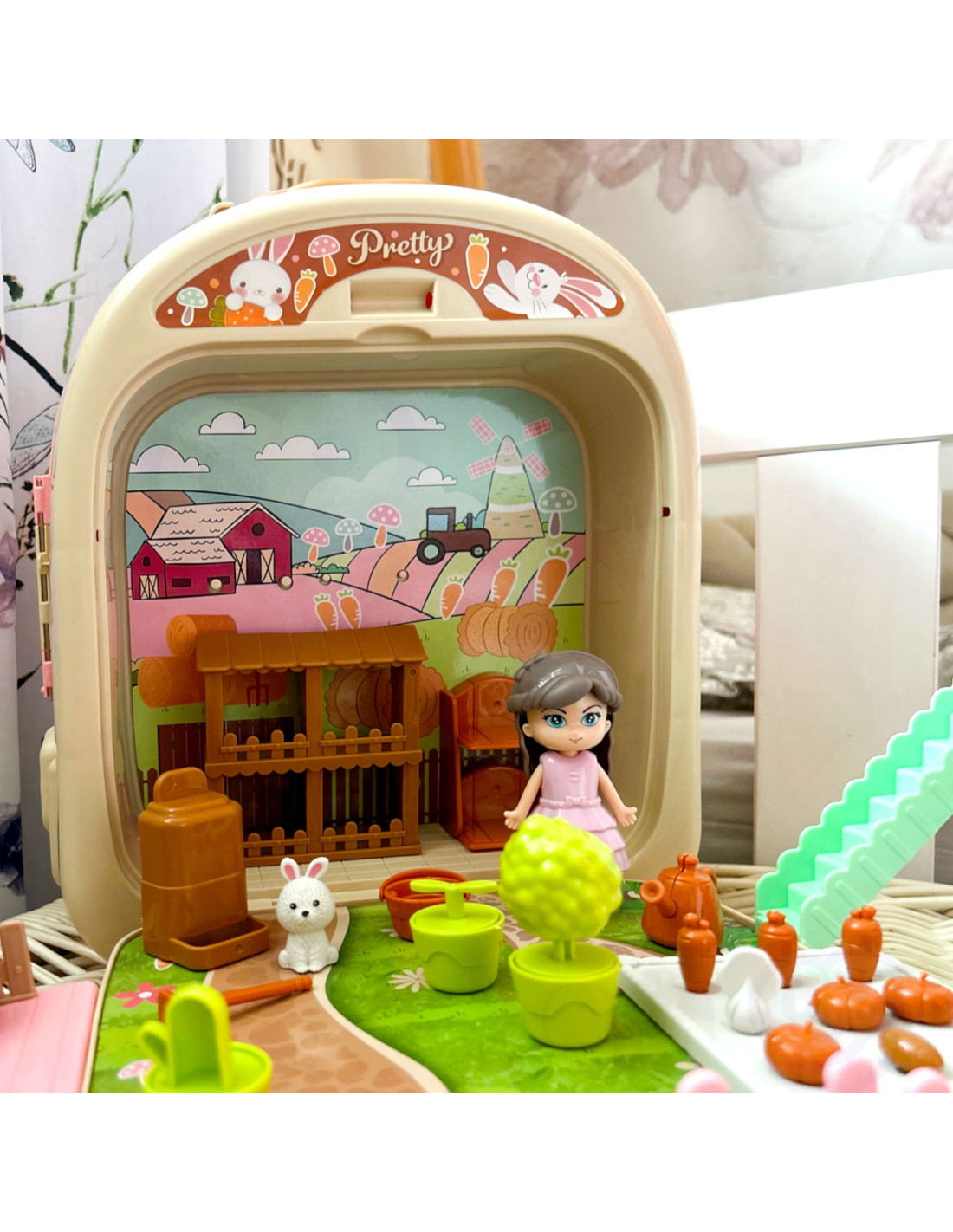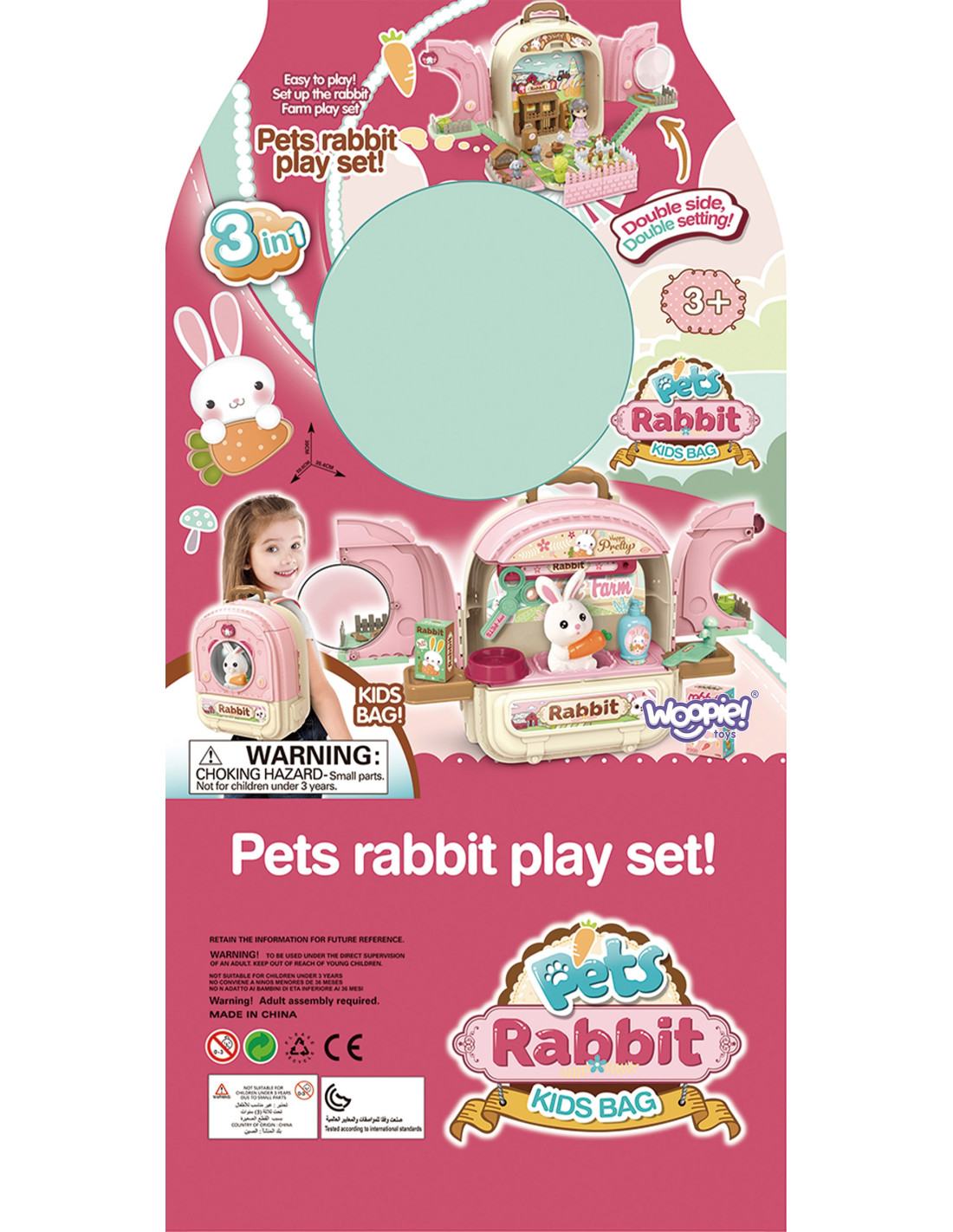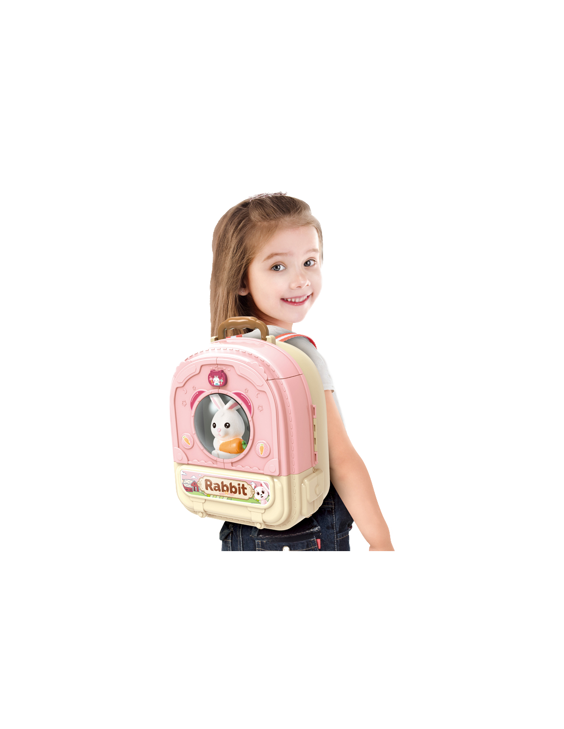 The Woopie 3-in-1 Bunny Backpack offers a world of exploration and creativity, making it the perfect companion for young explorers. Take your Bunny on a farm adventure and discover new furry friends. Grow vegetables and discover the joy of caring for and harvesting your own. Give your bunny a refreshing bath and make sure he's clean. Visit the cozy dog house and share some love with your furry companions. Learn the importance of caring for your furry friends with a delicious meal.