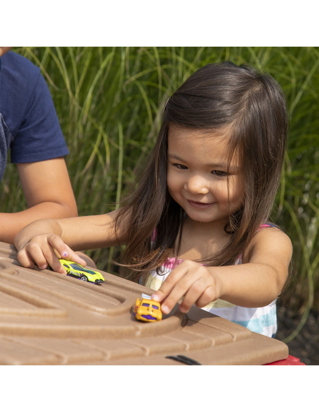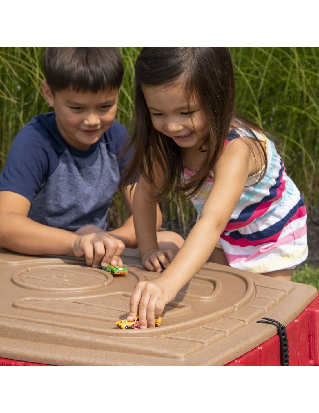- - a track has been carved on the cover, where our child can play with their favorite small vehicles
