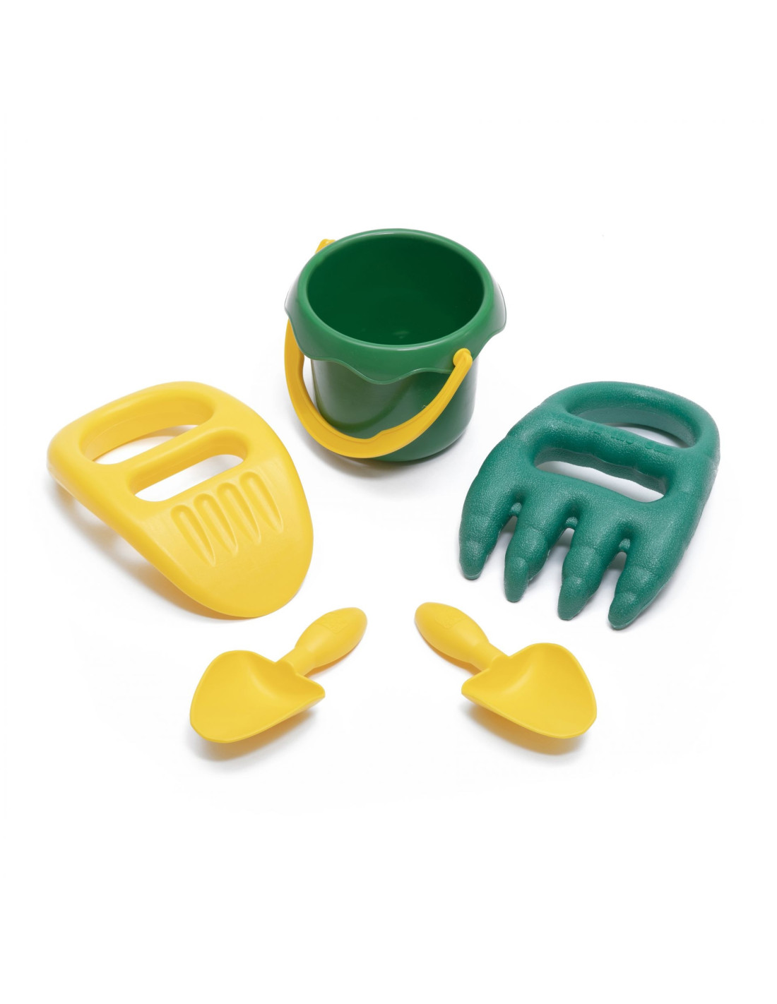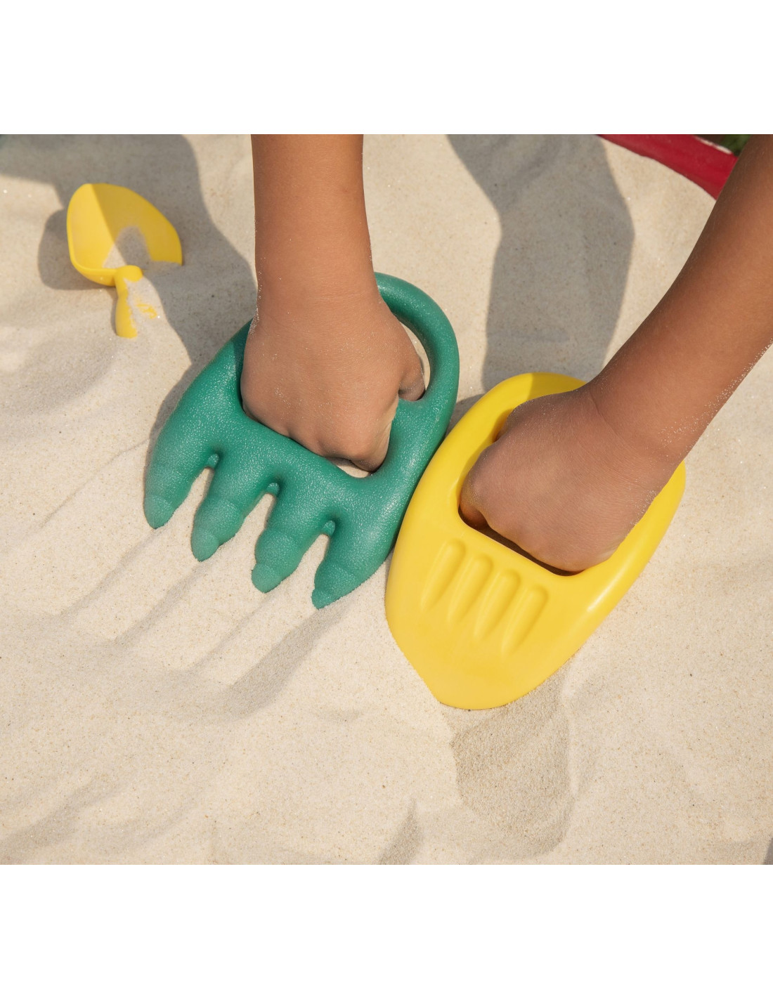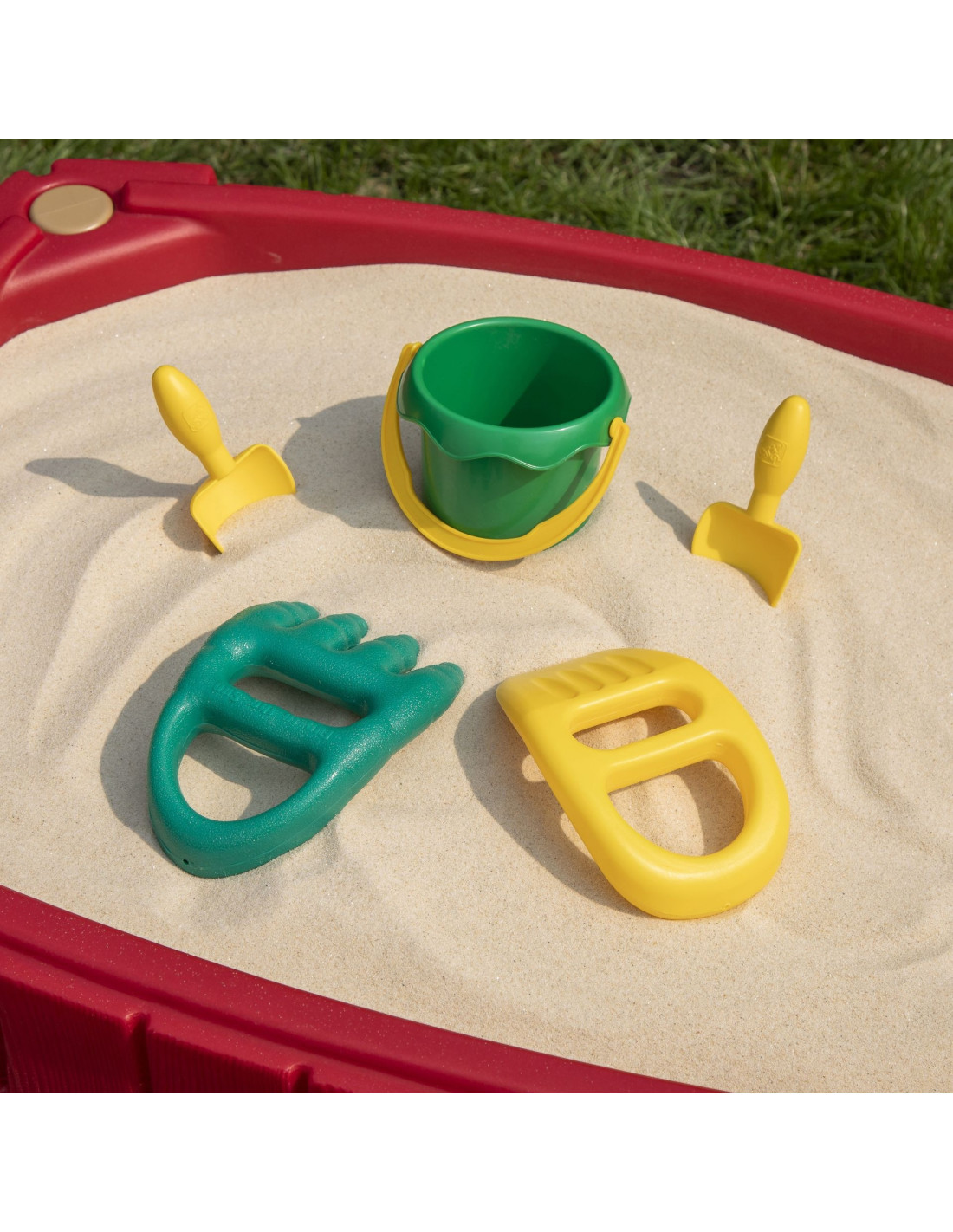 - - the sandbox comes with 2 shovels, 2 pairs of rakes and a bucket