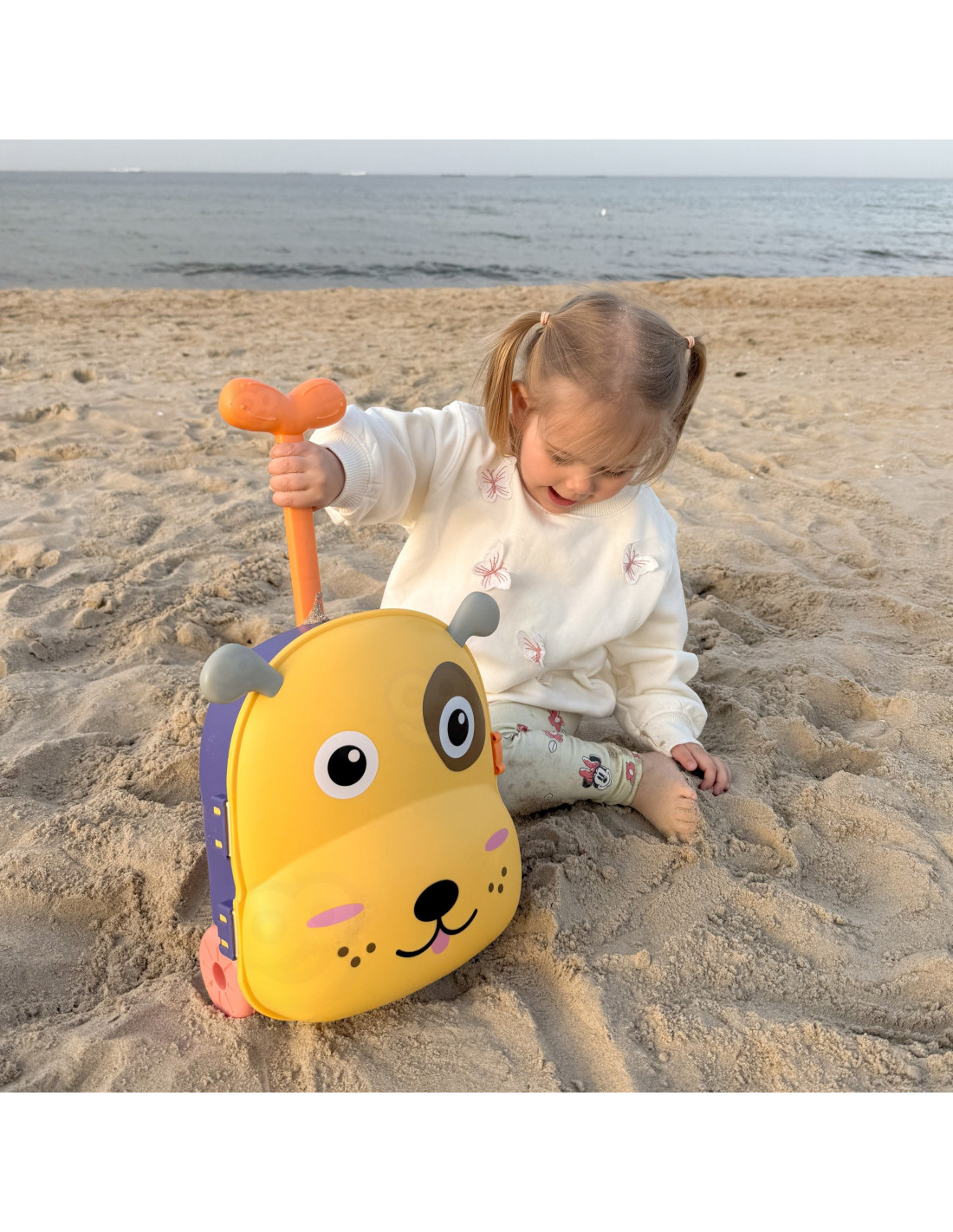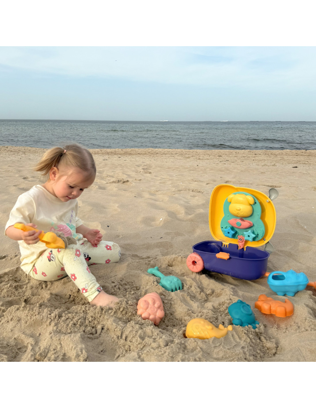 The WOOPIE sand and water play set will meet all your travel, sandbox, and beach needs ! This 3-in-1 set comes packed in a suitcase, which includes sand accessories and a water toy. Simply lay the suitcase on its back, fill the bottom with water, and use the cup to pour water over your head and watch the water drip. This type of play develops your child's senses and allows them to focus on the game . The accessories allow for complete sand play, even with two people! This toy meets all your outdoor play needs!