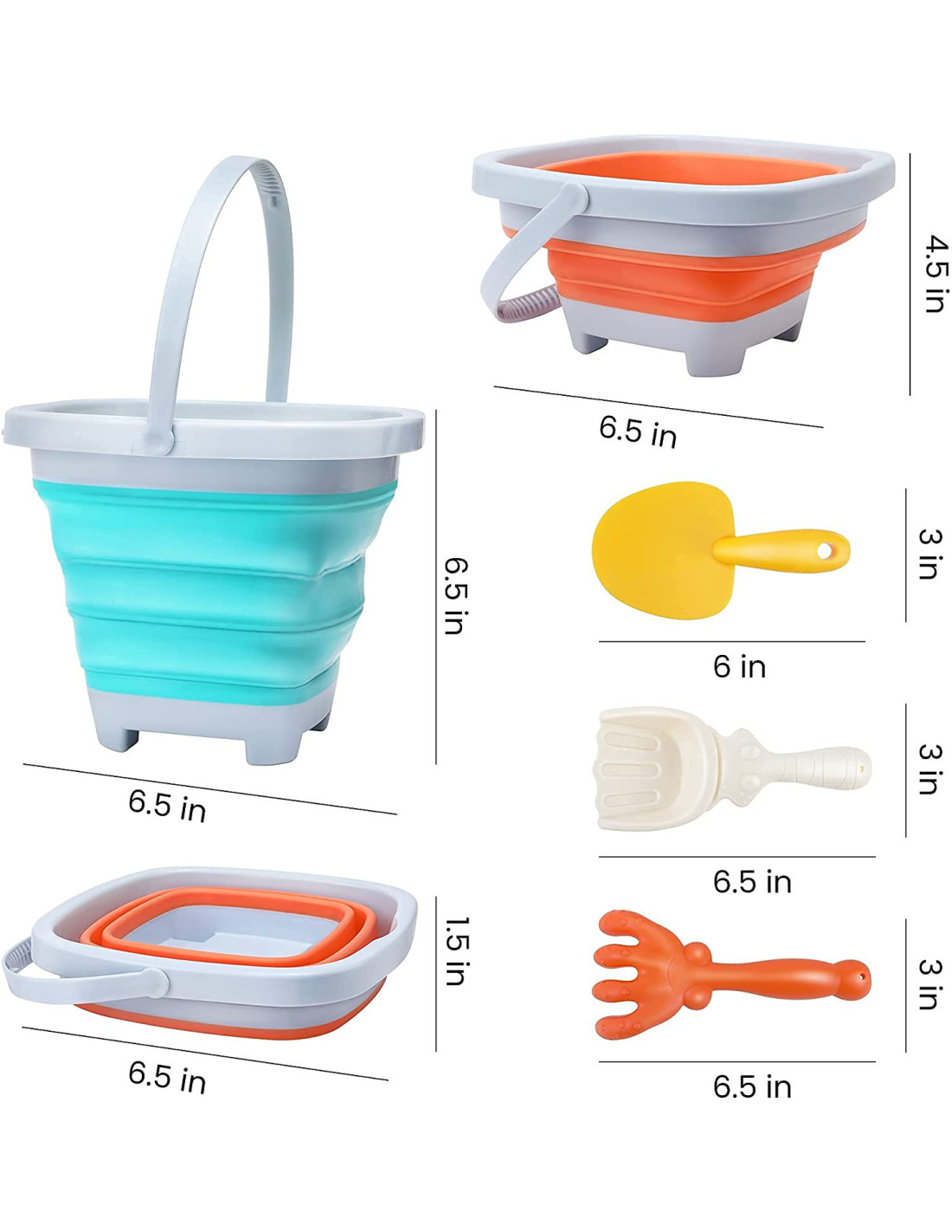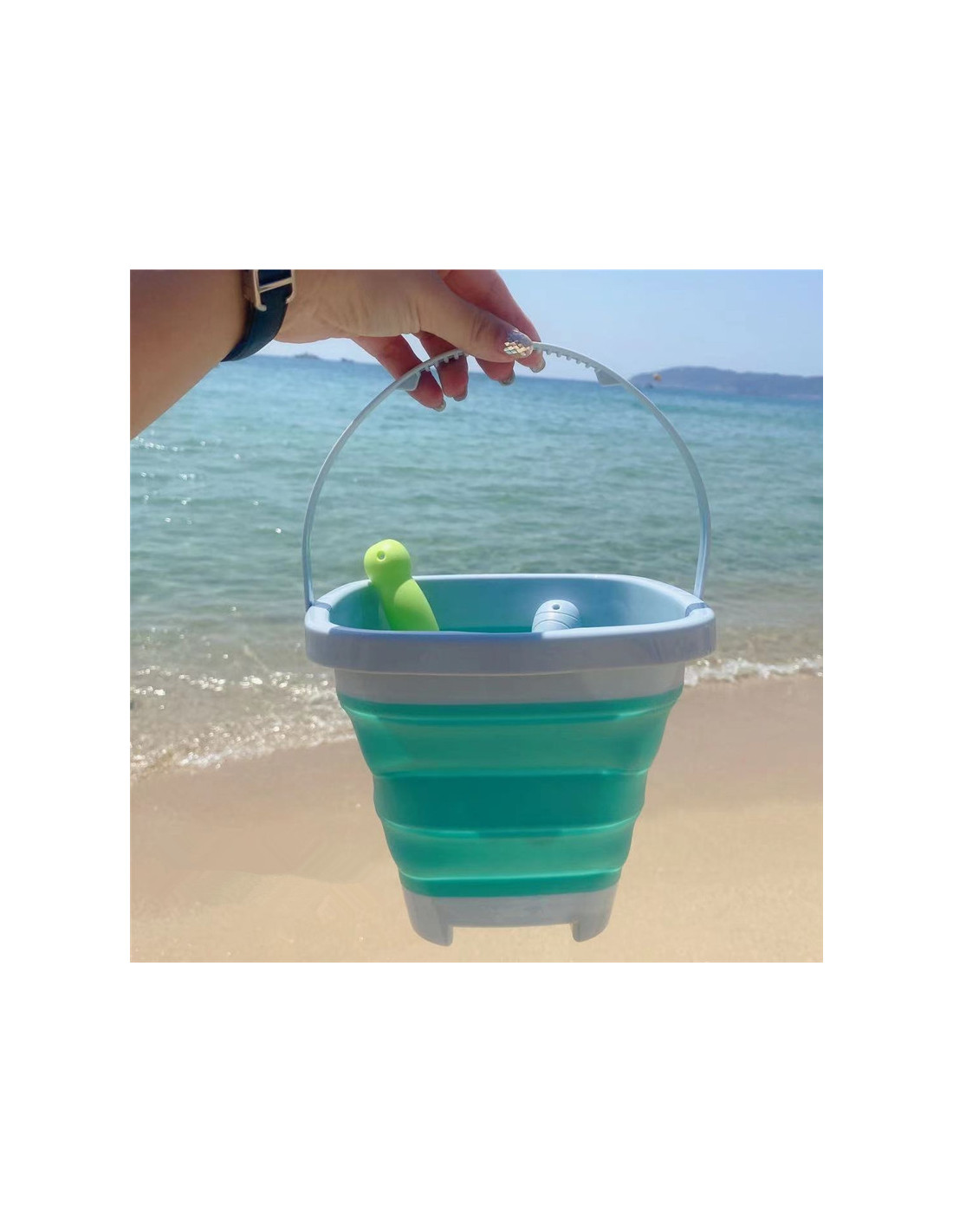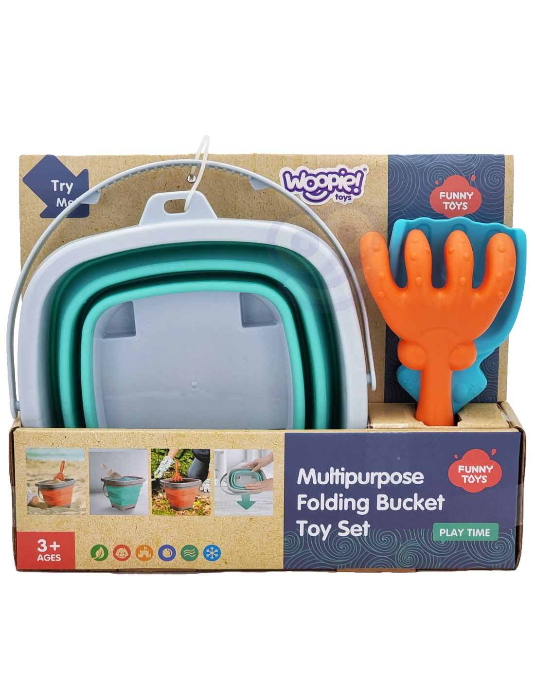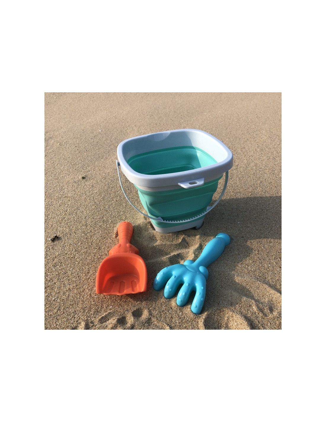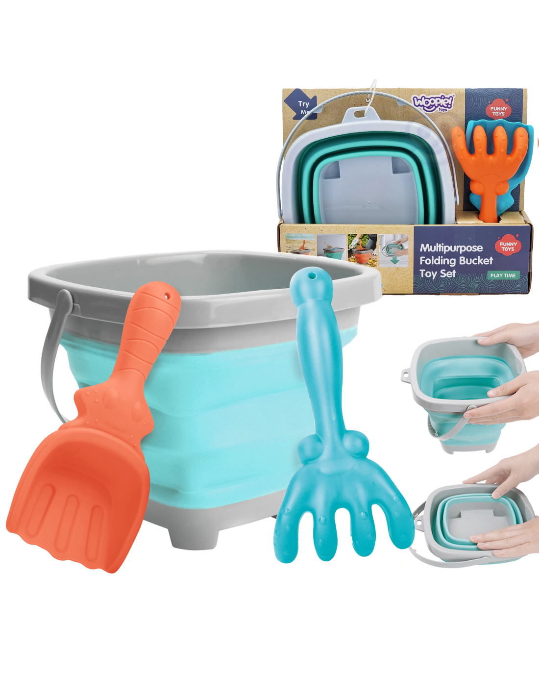 A silicone bucket with rake and shovel from WOOPIE . This fantastic bucket is perfect for the sandbox, beach , or garden , allowing children to enjoy time outdoors . Its foldable design means it takes up minimal space , is easy to transport, and is convenient to store . The set fits easily into a child's backpack, stroller, or beach bag .