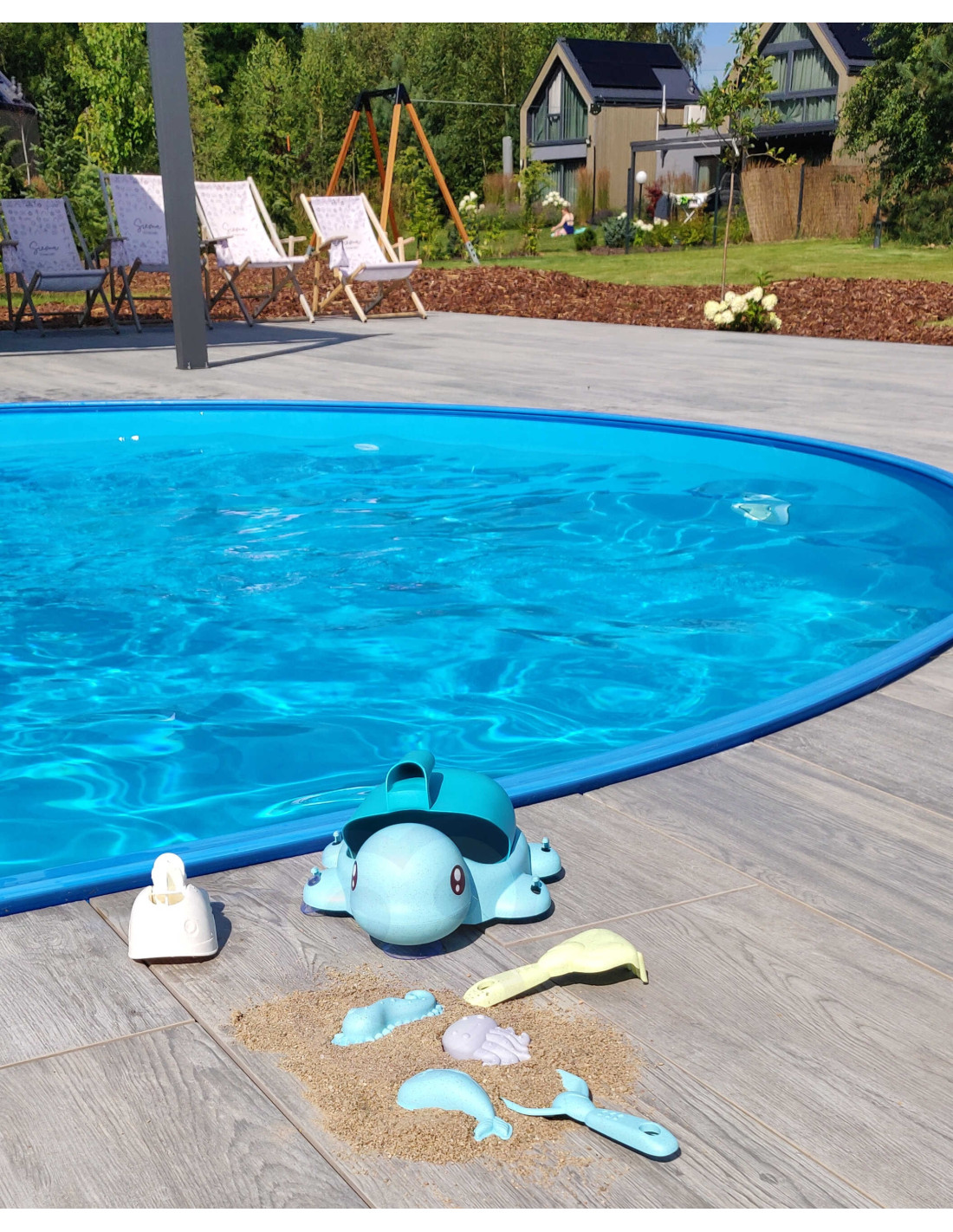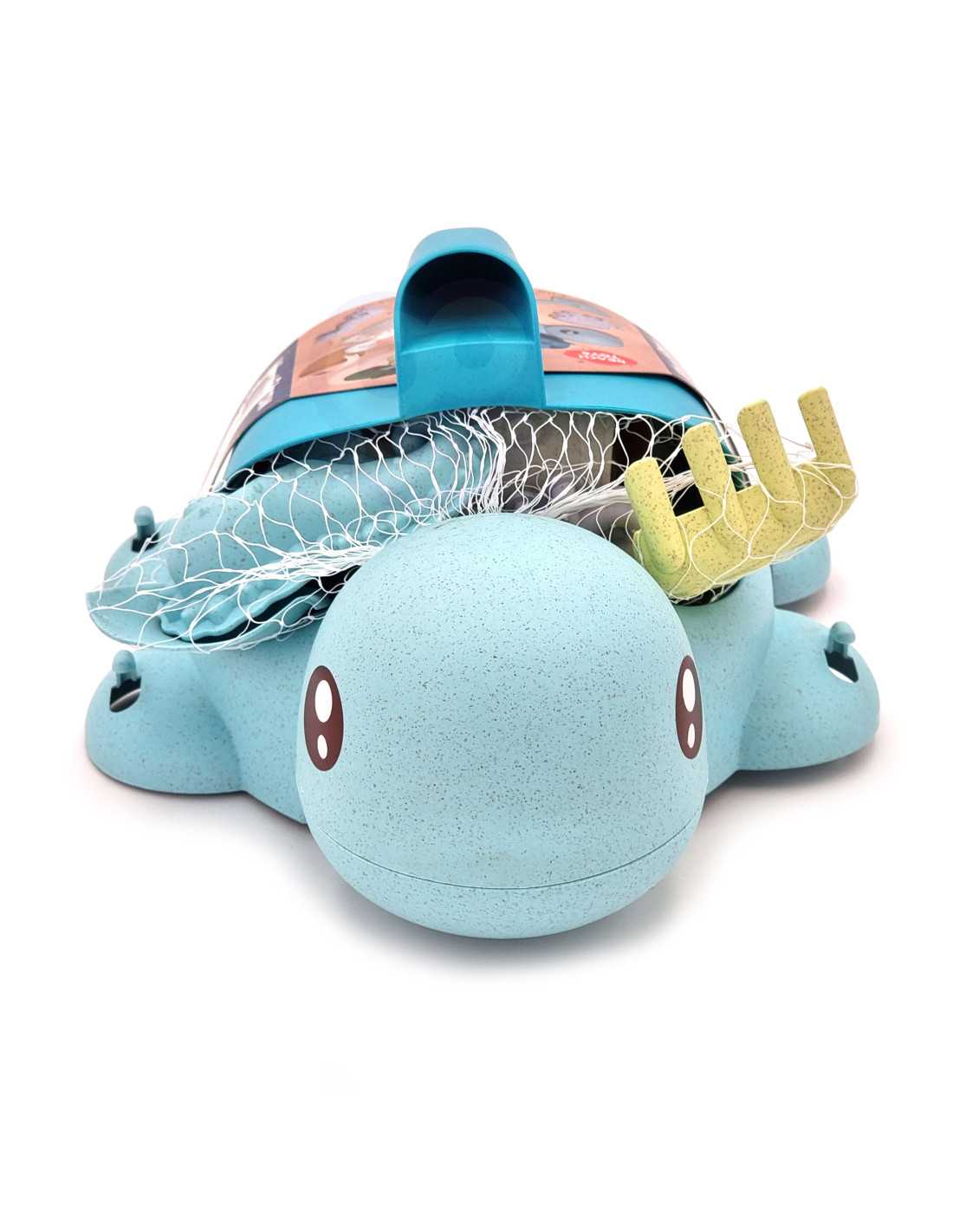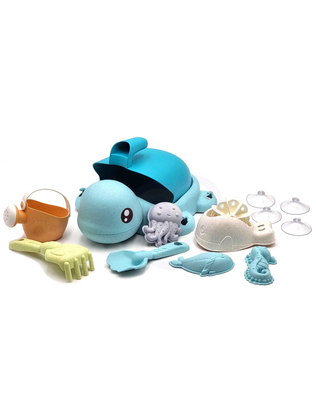 Turtle Sand and Bath Set from the WOOPIE brand from the WOOPIE GREEN series is a great addition to the sandbox, garden, or even the bathtub. The set includes 8 pieces : a turtle + rubber suction cups, a spoon, a watering can, 3 molds, a shovel and rake, and a spinning wheel. The bucket has a convenient carrying handle . The set features a trendy pastel design and is made of organic and biodegradable (self-degradable) material. It is also compostable . This product is safe for children – disinfected at 120 degrees Celsius. Guaranteed fun in the sandbox , on the beach , in the garden , and even in the bathtub ! This product is environmentally friendly!