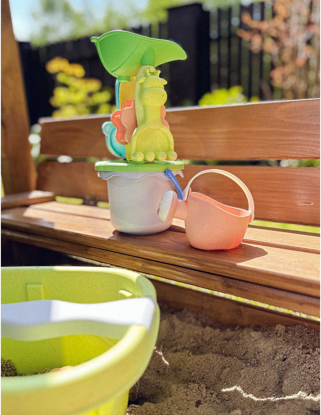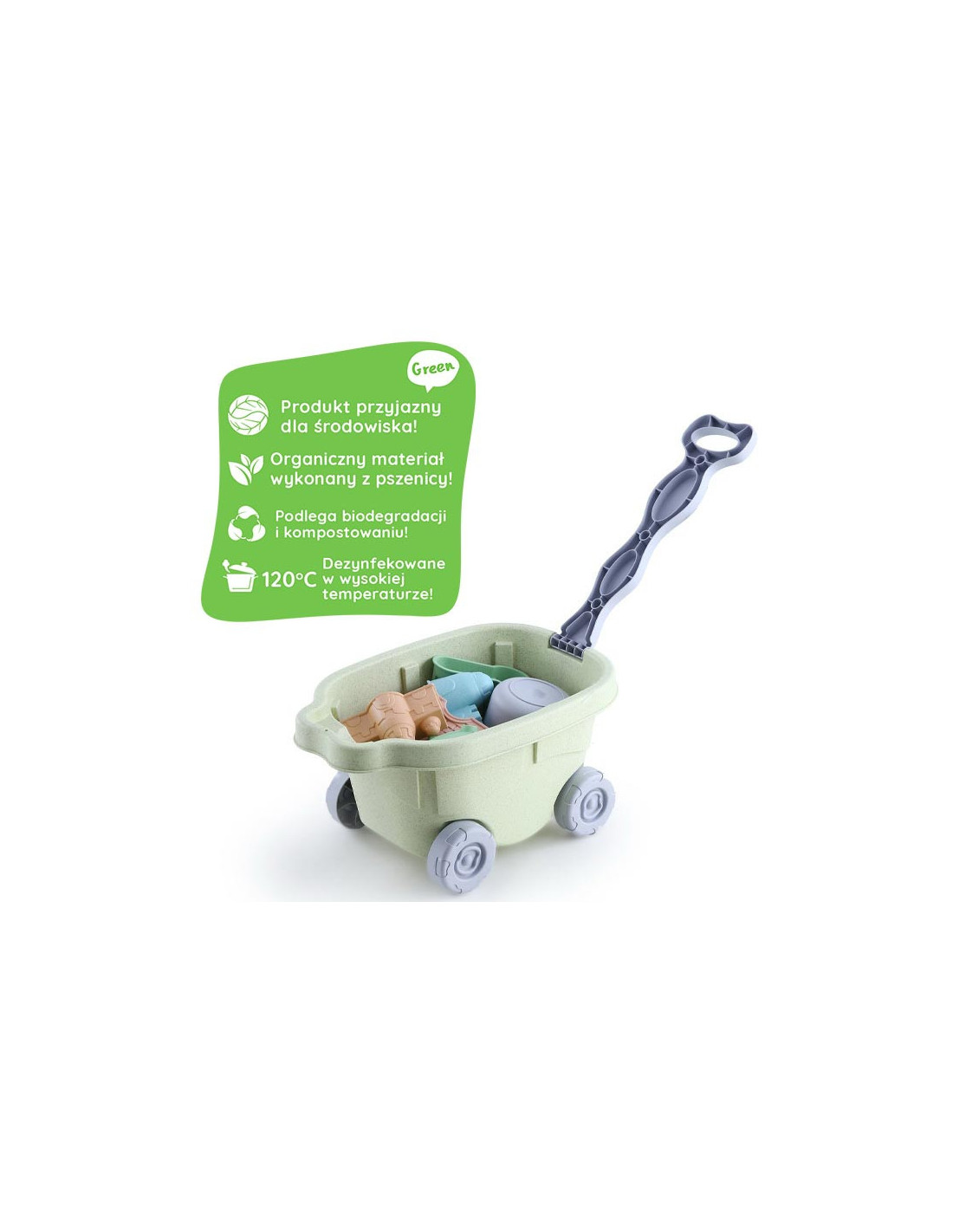 The WOOPIE Sand Cart Set from the GREEN series is a great addition to a sandbox or even a garden. The set includes 12 pieces : a bucket, a watering can, a spinning wheel with strainer, 7 molds, a shovel, and a rake. Both the bucket and the watering can have a convenient carrying handle . The set boasts a trendy pastel design and is made of organic and biodegradable (self-degradable) material. It is also compostable . This product is safe for children – disinfected at 120 degrees Celsius. Guaranteed fun in the sandbox , on the beach , and even in the garden ! This product is environmentally friendly!
