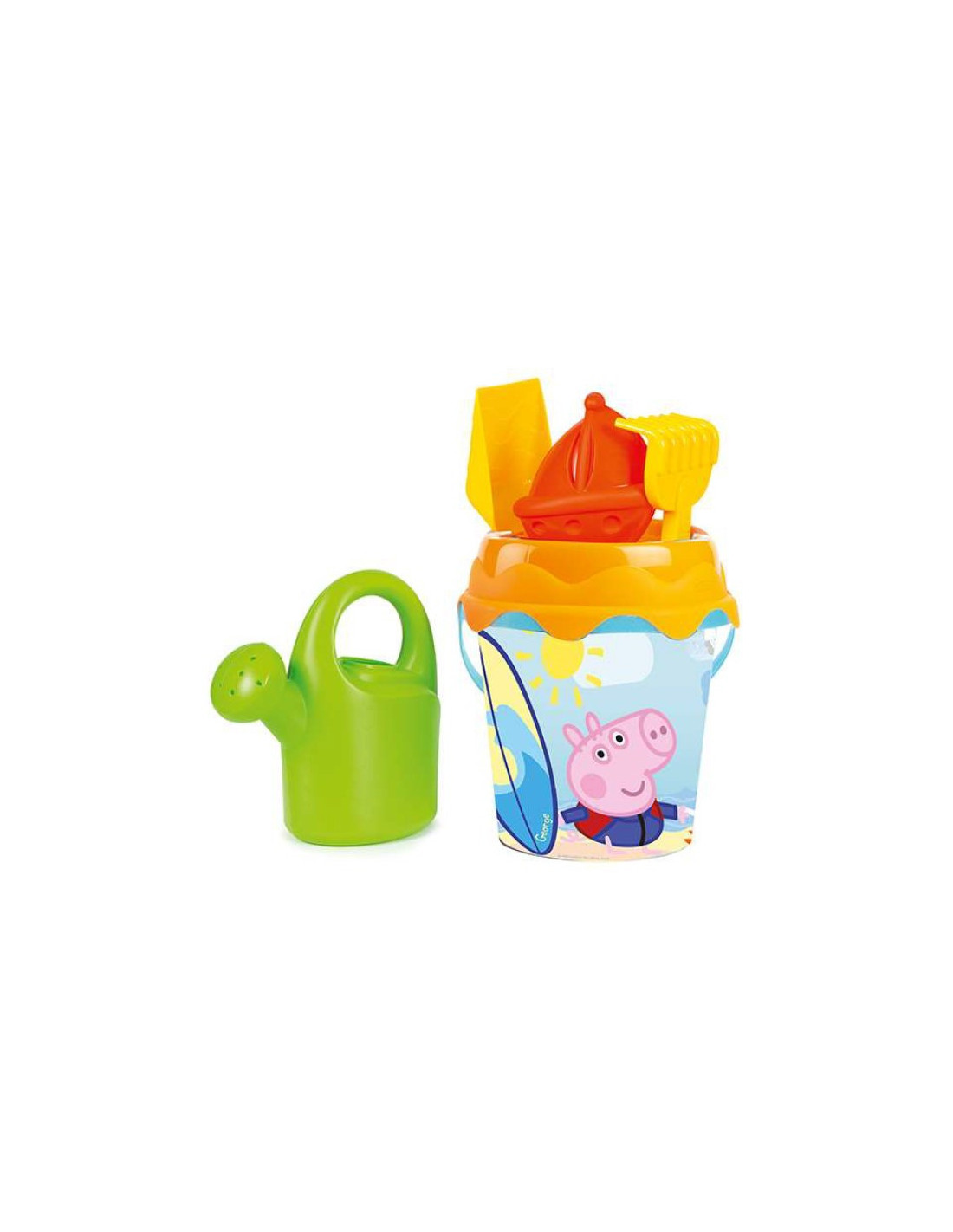 This Peppa Pig sand set from Smoby is a great addition to any sandbox. The set includes a bucket decorated with George's image, a strainer that also serves as a lid, a shovel , a watering can , a rake , and a red boat . The bucket lid has special holes for inserting the rake and shovel .