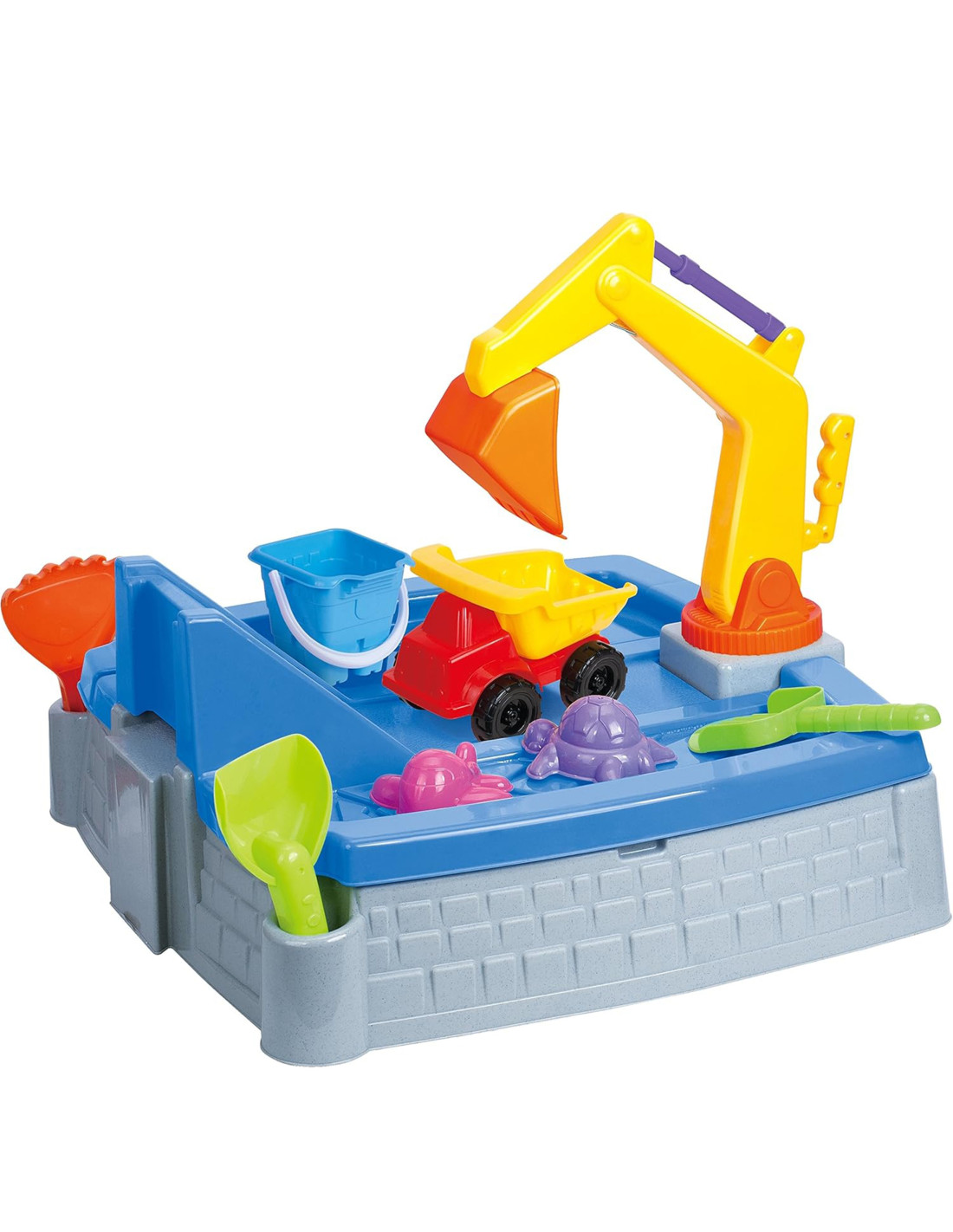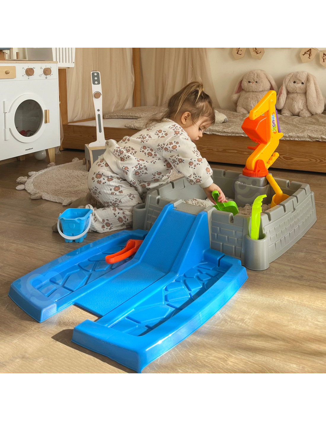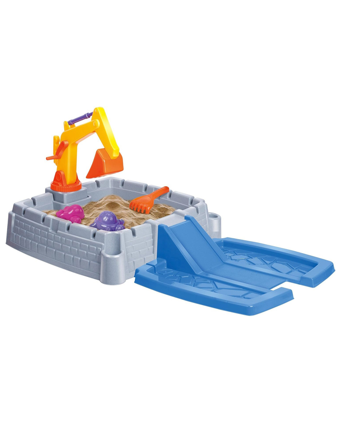 Your garden, patio, or even your living room can become a magical place full of creative play and unforgettable moments. This castle-shaped sandbox is the perfect place to play, encouraging children to create sand kingdoms and fortresses. The set includes all the necessary accessories, and the movable excavator arm adds a new dimension to play.