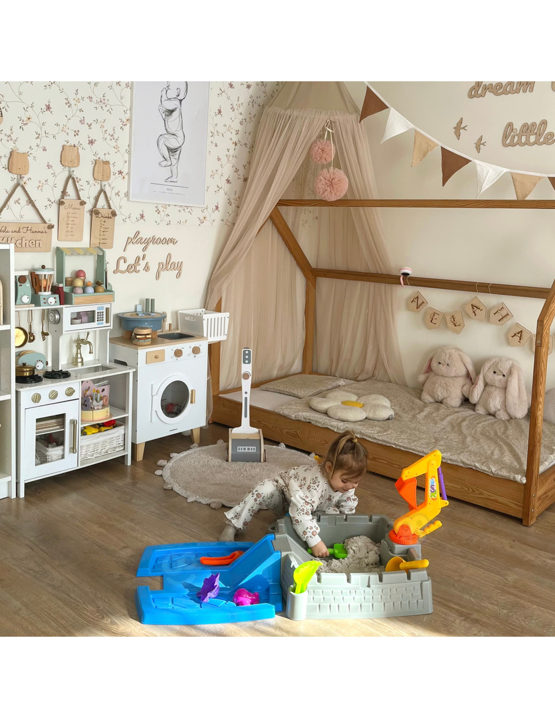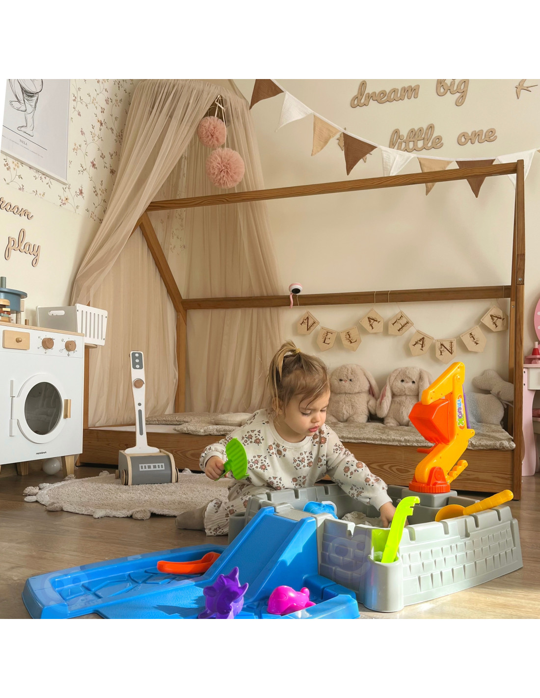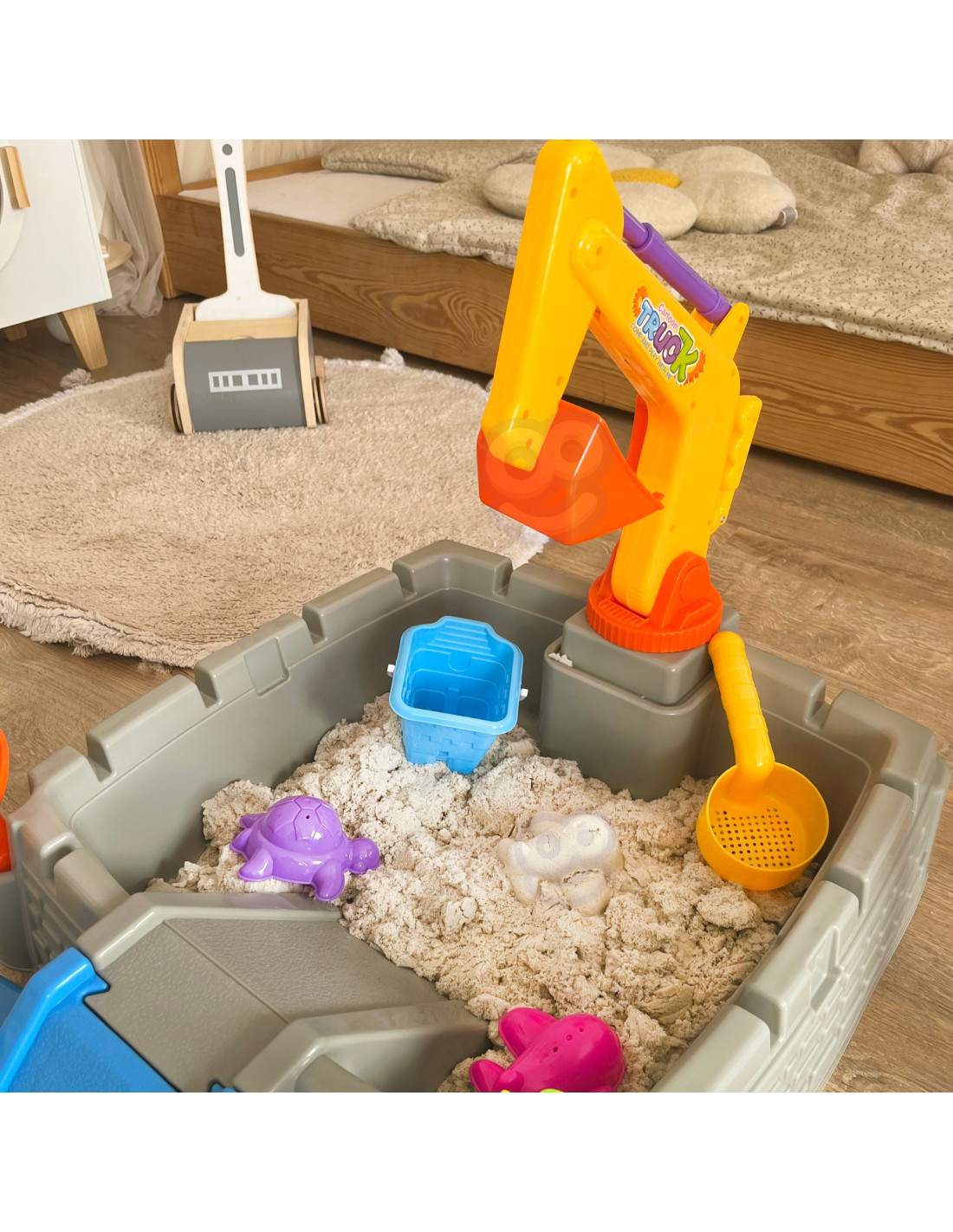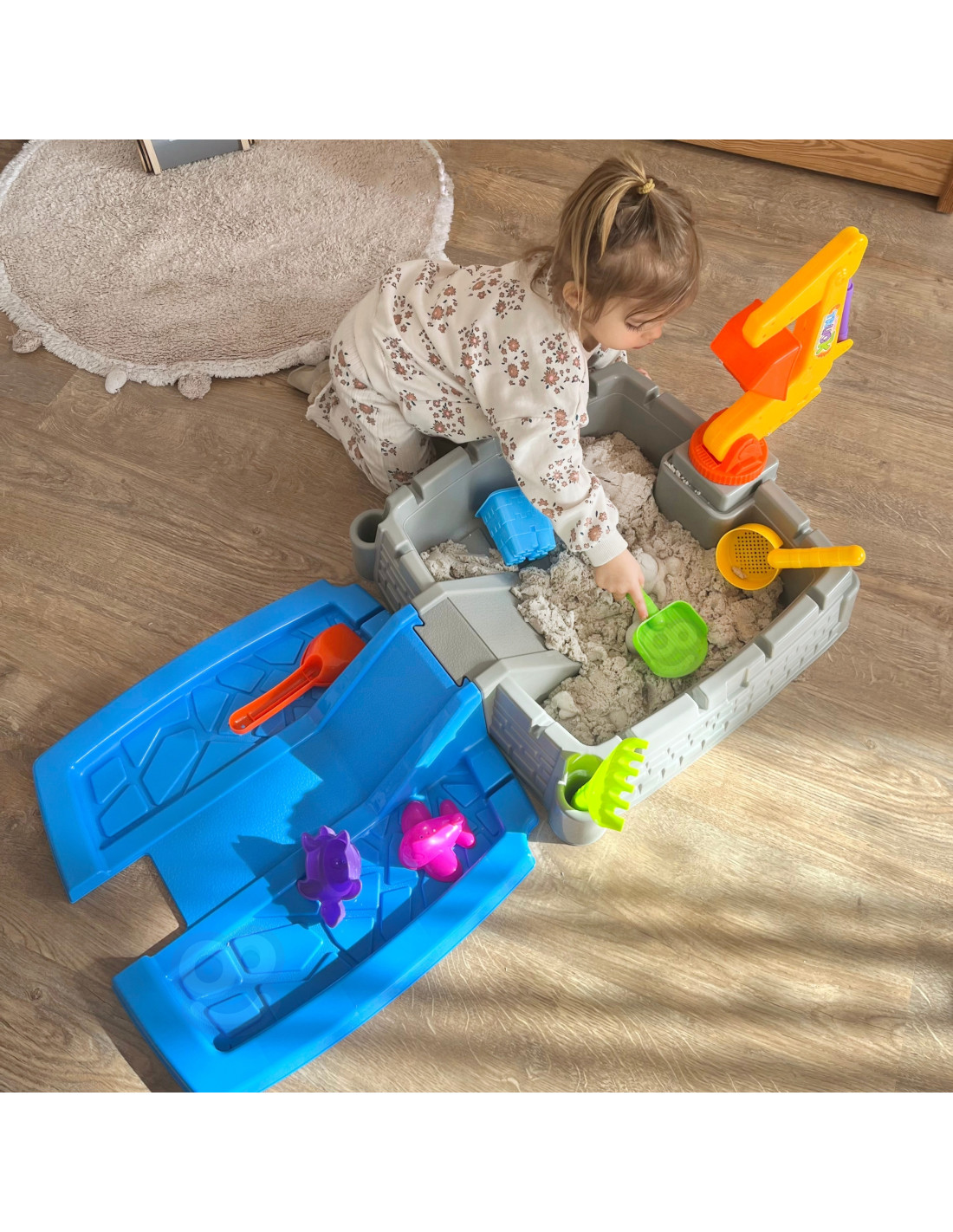 Your garden, patio, or even your living room can become a magical place full of creative play and unforgettable moments. This castle-shaped sandbox is the perfect place to play, encouraging children to create sand kingdoms and fortresses. The set includes all the necessary accessories, and the movable excavator arm adds a new dimension to play.