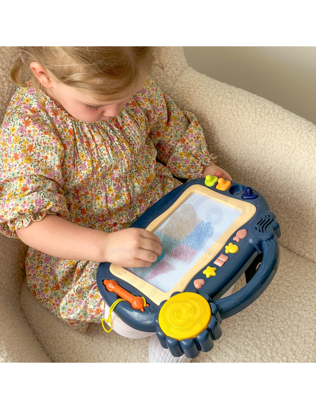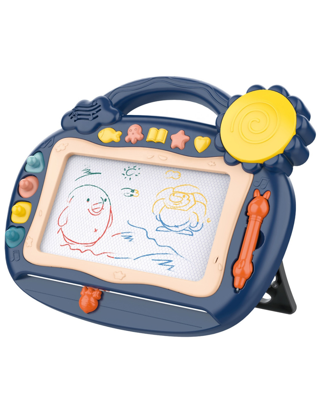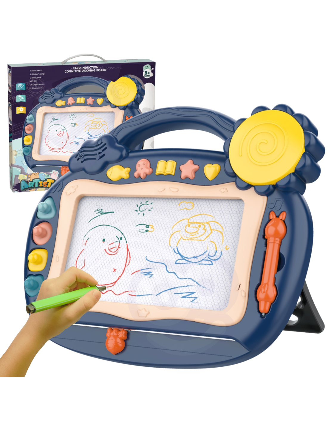 The Magnetic Writing Board offers hours of creative play! The board encourages writing and drawing . Drawing will help your child calm down and relax . The writing board allows you to create an endless number of pictures – simply slide the special slider, and the drawing will disappear, allowing you to draw again! The set also includes a convenient pen and four stamps to enhance your creations. Additionally, there are five multi-function buttons with over 400 sound options, including sound effects , children's dance songs, electronic sounds , the English alphabet , and a drum . The board has a convenient handle , so your child can take it anywhere, and the legs can be extended , making it easier for them to write at the table. The writing board will develop your child's manual dexterity , imagination , and creativity , and will give them the opportunity to develop their artistic side !