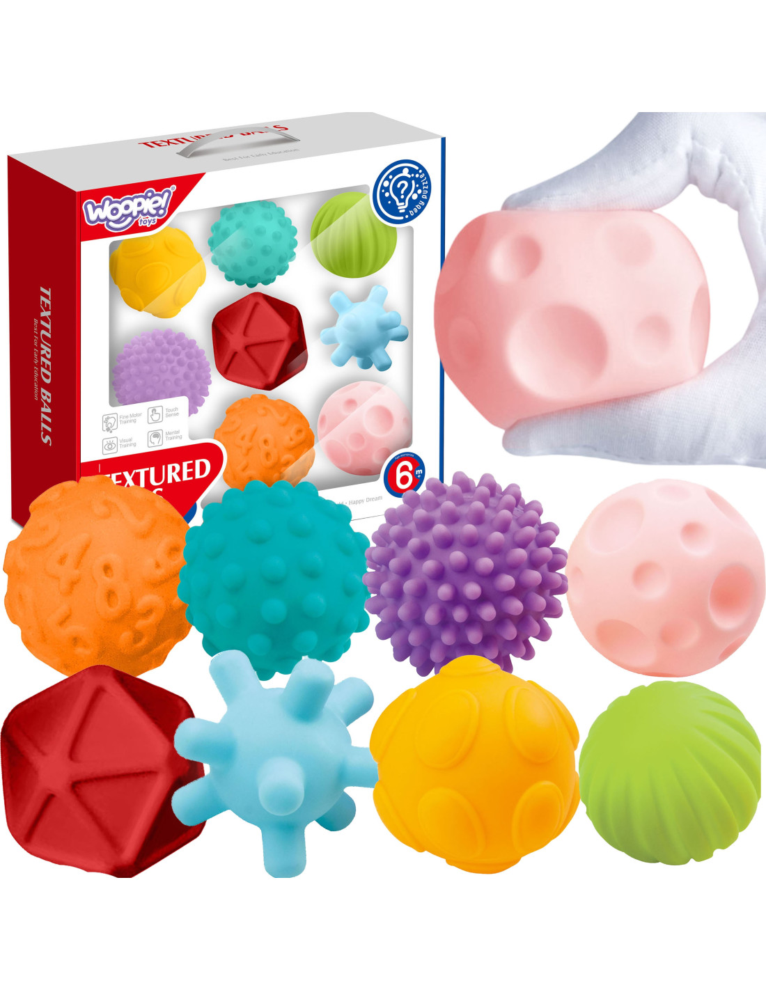 WOOPIE Sensory Blocks will captivate every toddler. With their engaging shapes, colors, and the ability to make sounds when squeezed, they perfectly stimulate the development of a child's visual-auditory coordination, fine motor skills , and sense of touch. The blocks feature convex shapes with various textures/patterns and shapes . They are soft and pleasant to the touch. Thanks to their structure, they also work perfectly as a teether . This product, with its beautiful, subdued colors, is suitable for children from 6 months of age.