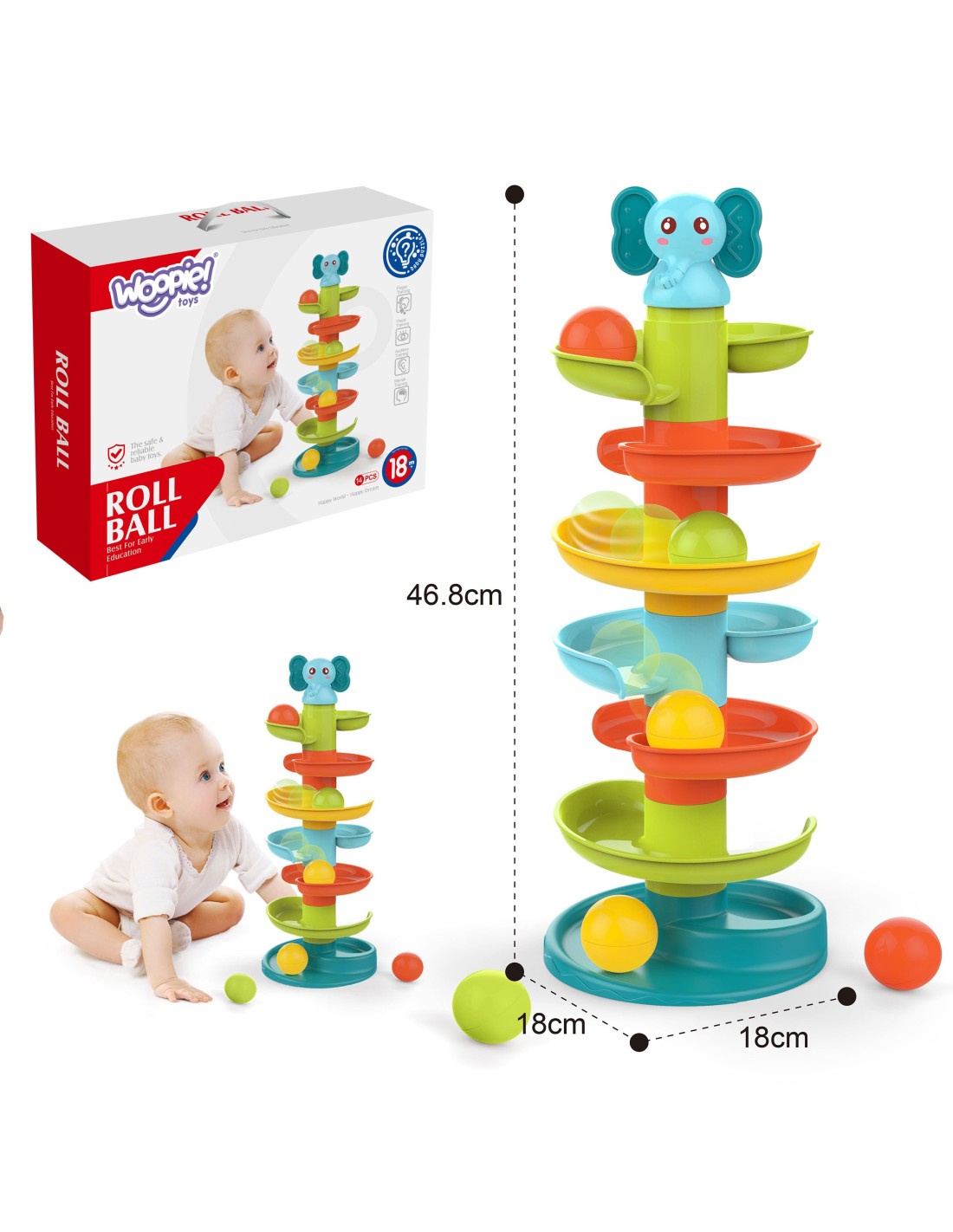 The WOOPIE Ball Track is a spiral tower that provides endless fun. This colorful set consists of eight colorful pieces that toddlers can easily stack . Balls released individually from the top tier roll to the bottom of the track. The track features three lightweight, easy- to-grasp balls in different colors that make sounds when moved. The size is perfect for little hands and helps develop hand-eye coordination .