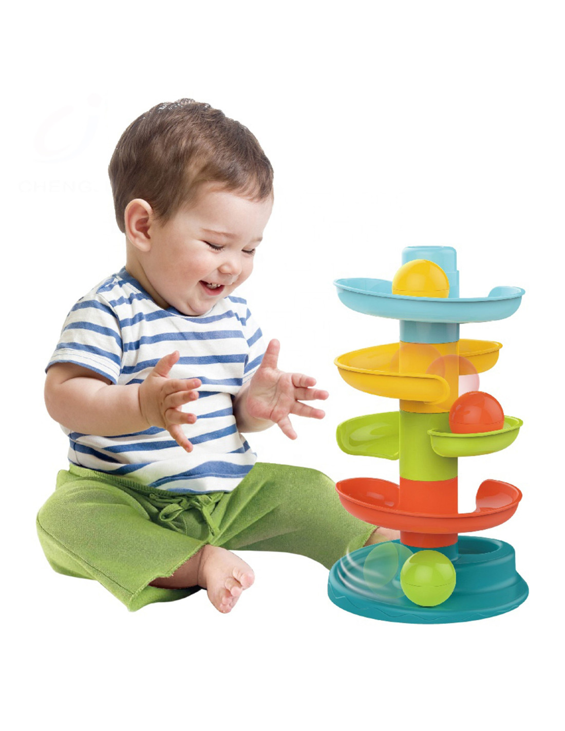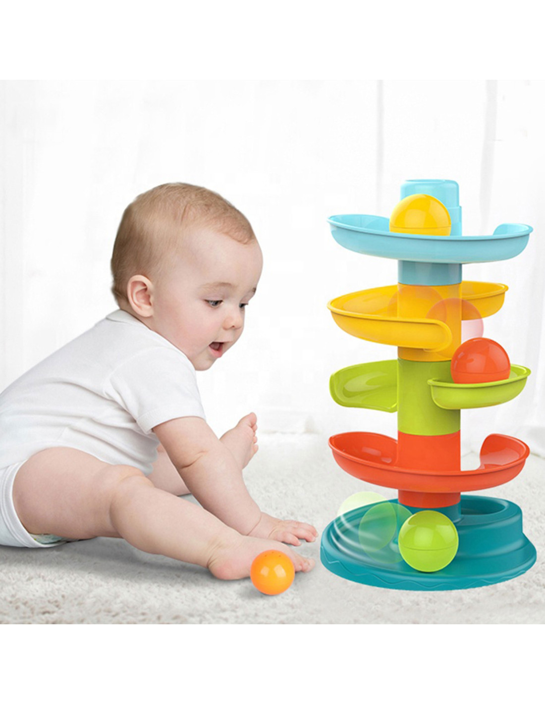 The WOOPIE Ball Track is a spiral tower that provides endless fun. This set consists of 5 colorful pieces that toddlers can easily stack . The balls will roll from the top of the slide all the way to the bottom. The ball track features 3 lightweight, easy -to-grasp balls in different colors that make sounds when moved. The size is perfect for little hands and helps develop hand-eye coordination .