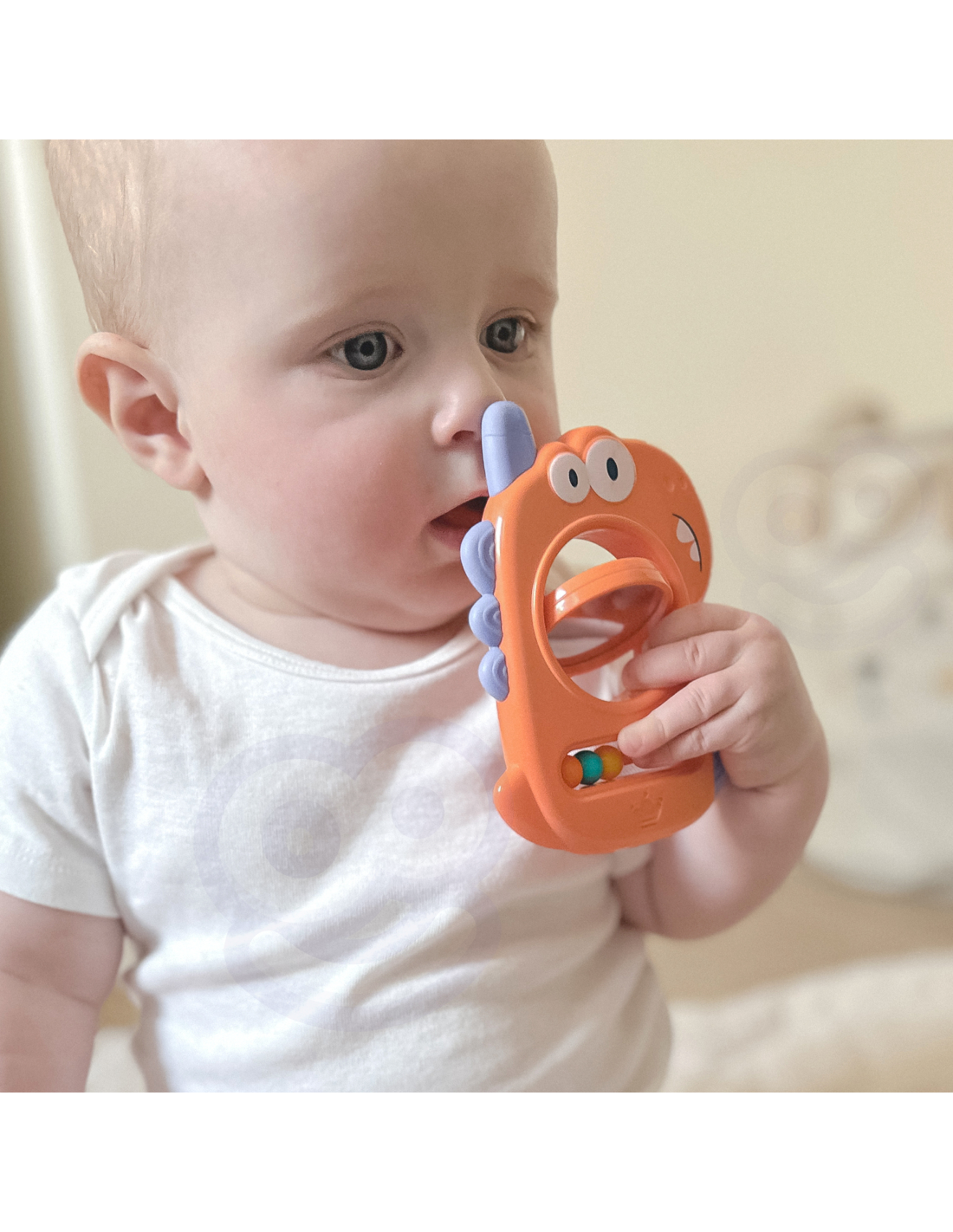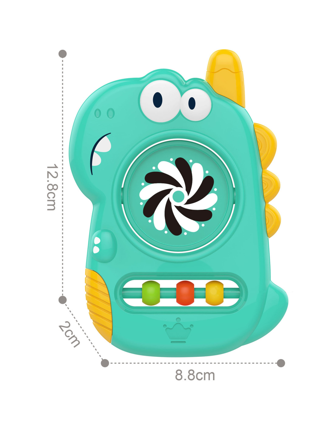 This colorful dinosaur- shaped teether from WOOPIE is the perfect toy for the youngest, designed with infants in mind. Its shape is perfect for baby's hands . It works well as a teether thanks to its soft silicone elements. The colorful beads and mirror will captivate every toddler.