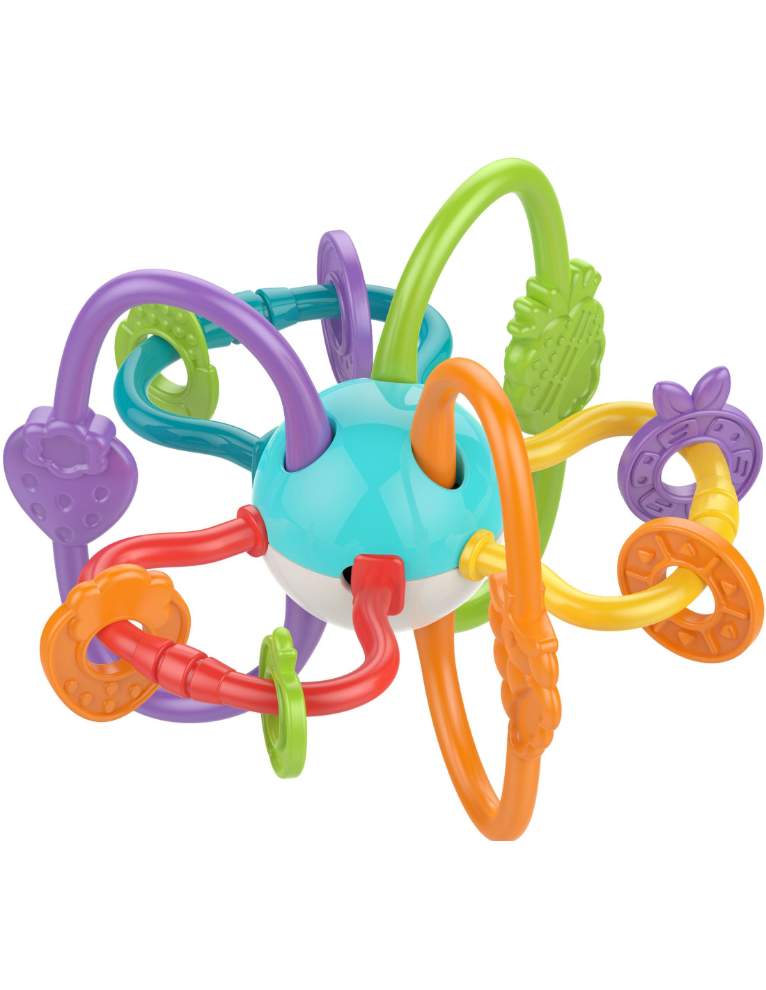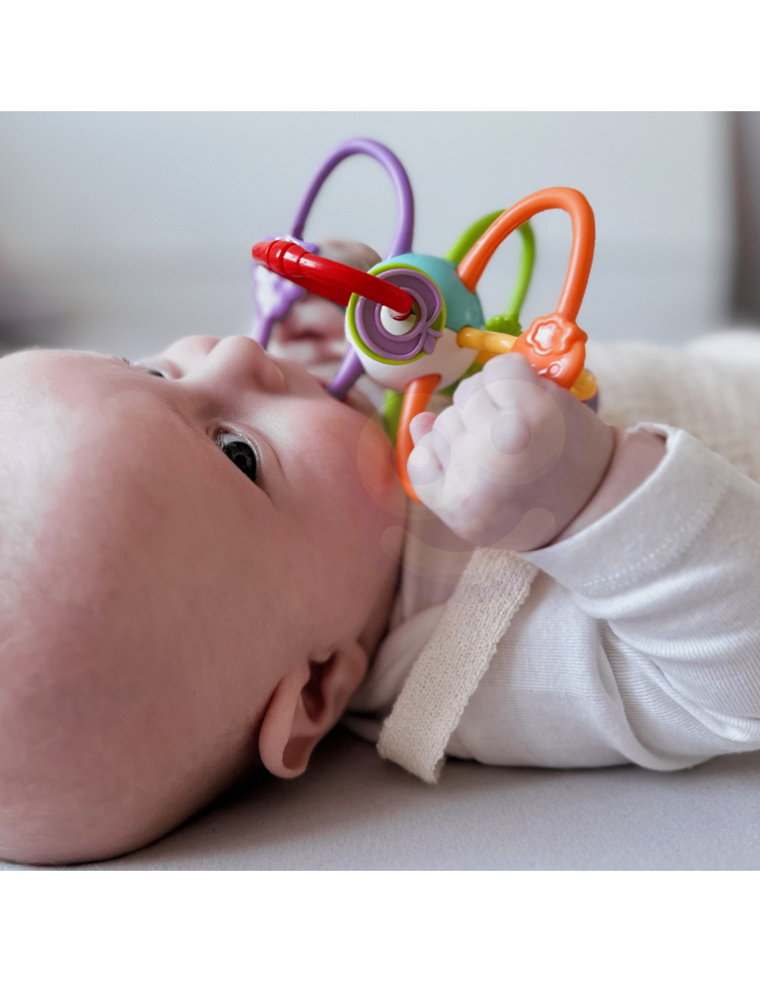 This sensory toy from the Woopie brand is perfect for a little teething baby. It consists of soft, colorful tubes that attract baby's attention. The lightweight design makes it easy for little ones to hold. It's designed to be child- safe , with no sharp edges, and features soft elements that can be used as a teether . Playing with it stimulates the development of tactile, visual, and auditory senses . It includes a rattle that can attract attention. The colorful elements can be moved around on the flexible swirls. The toy can be stored in the refrigerator to provide better relief for sore teething gums.