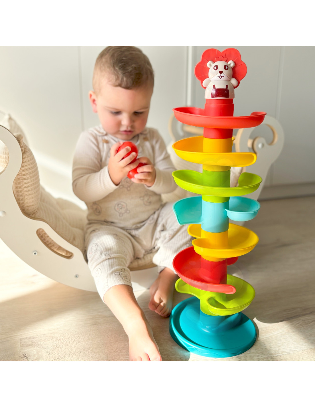 The WOOPIE Ball Track is a spiral tower that promises endless fun. This colorful set consists of 10 colorful pieces that toddlers can easily stack . Release the balls one at a time from the top level and watch them roll and swing one after another. The ball track features 6 lightweight, easy- to-grasp balls in different colors that make sounds when moved. The size is perfect for little hands and helps develop hand-eye coordination .