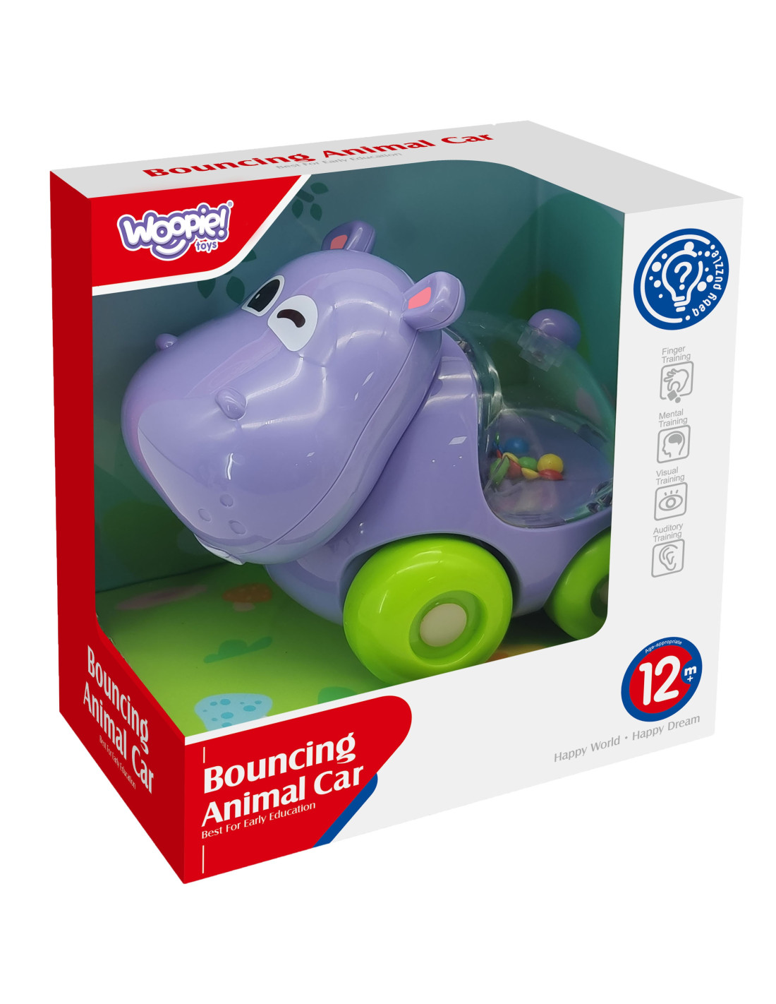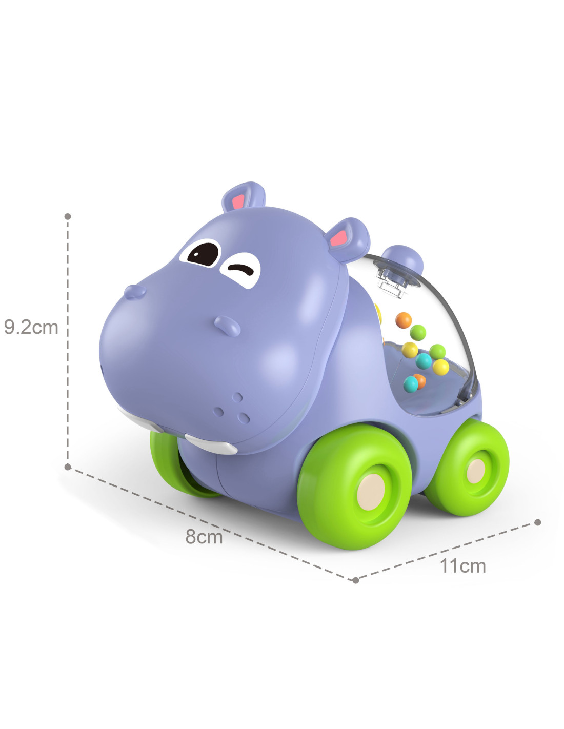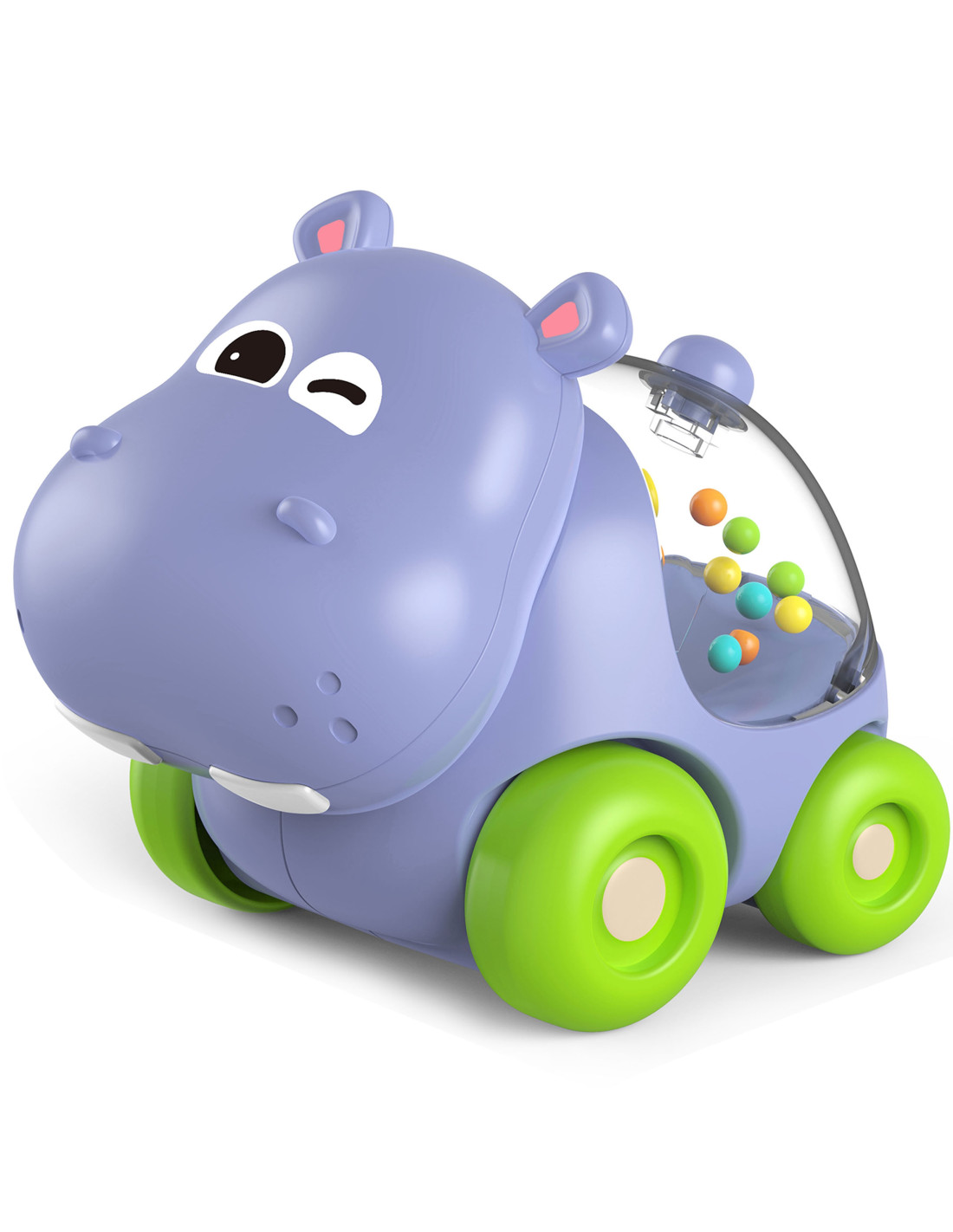 A rattle car in the shape of an adorable hippo from the WOOPIE brand! This unique toy is a great way to stimulate your baby's activity while developing their senses. As your little one moves the rattle, colorful balls in the animal's belly begin to rustle and spin , providing both auditory and visual stimulation . Your baby can easily push the toy, encouraging crawling and walking.