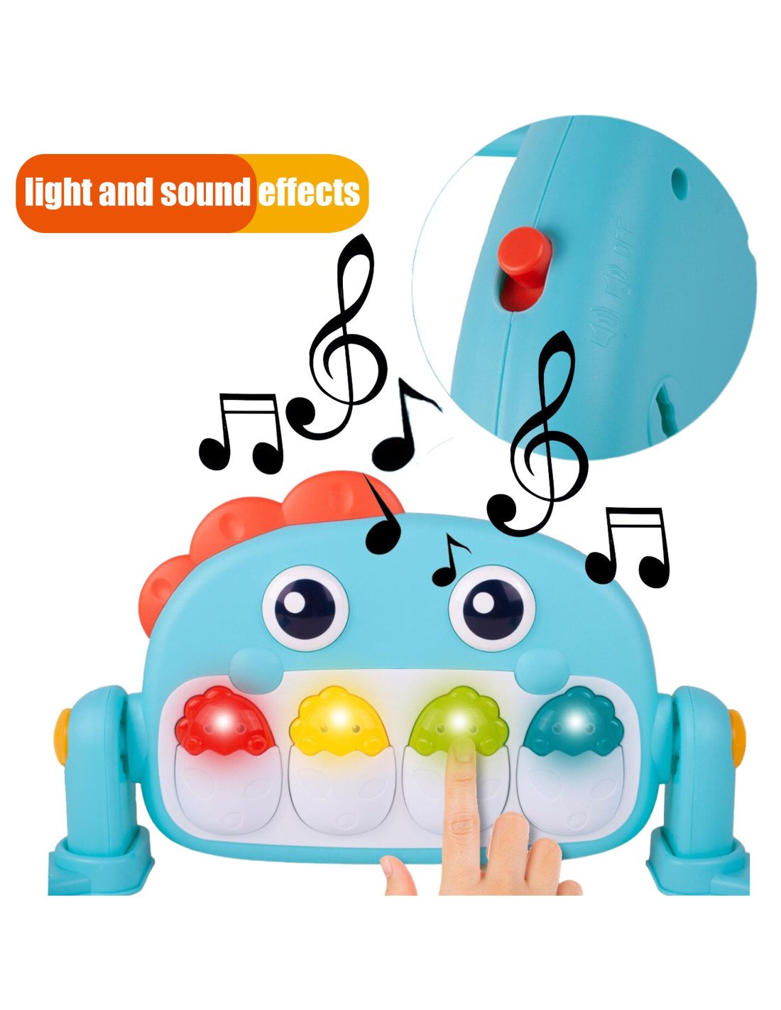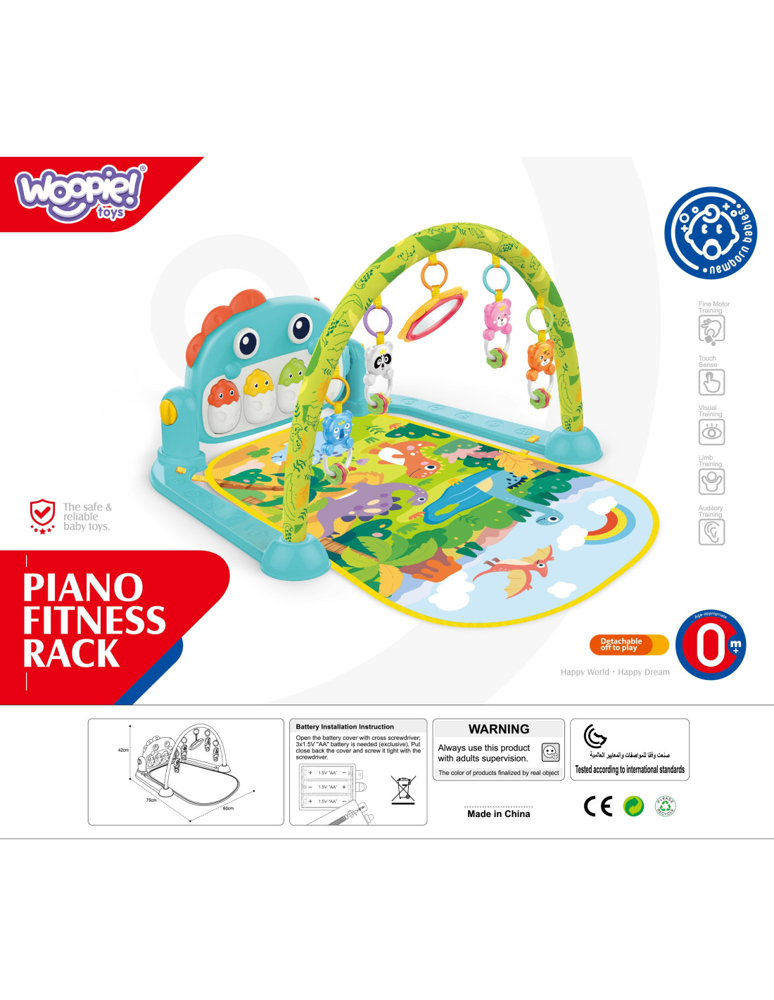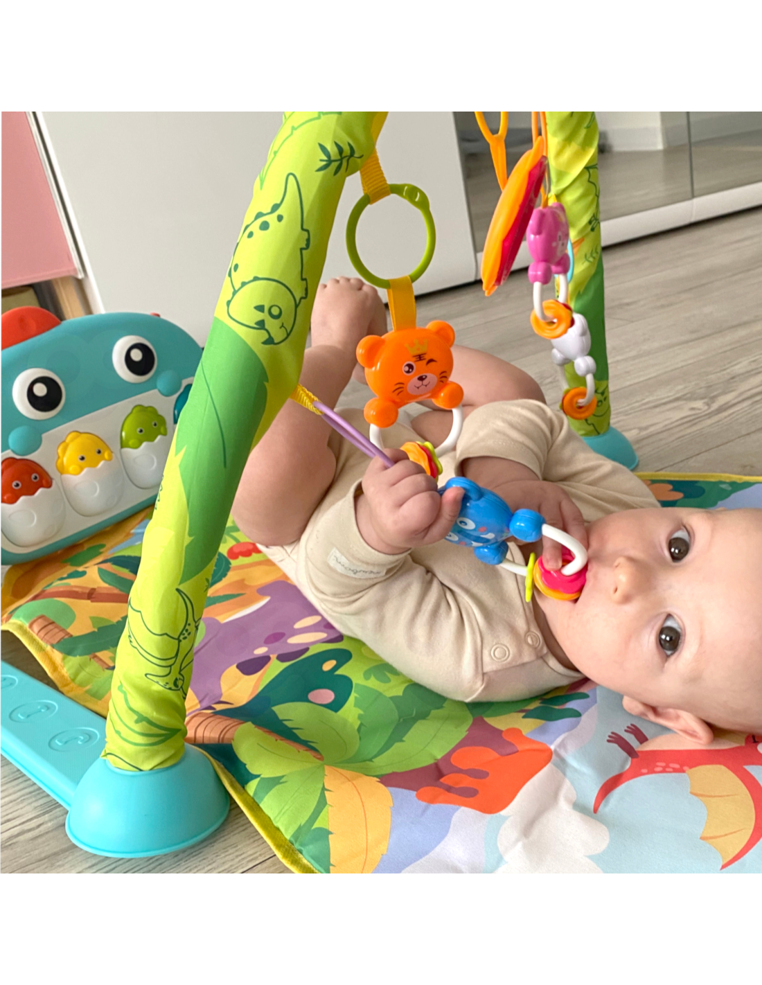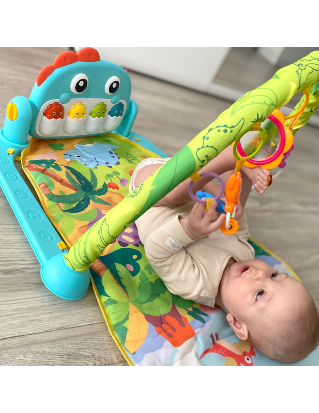 The Woopie Dino Play Mat with Arch is a toy designed for babies from birth . Featuring a toy arch with colorful animal-shaped pendants and a mirror, as well as sliding wheels , it positively impacts the development of all of your baby's senses . Our play mat is a great place to relax, play, and explore the world. A panel with musical dinosaur eggs and pleasant melodies adds to the fun.