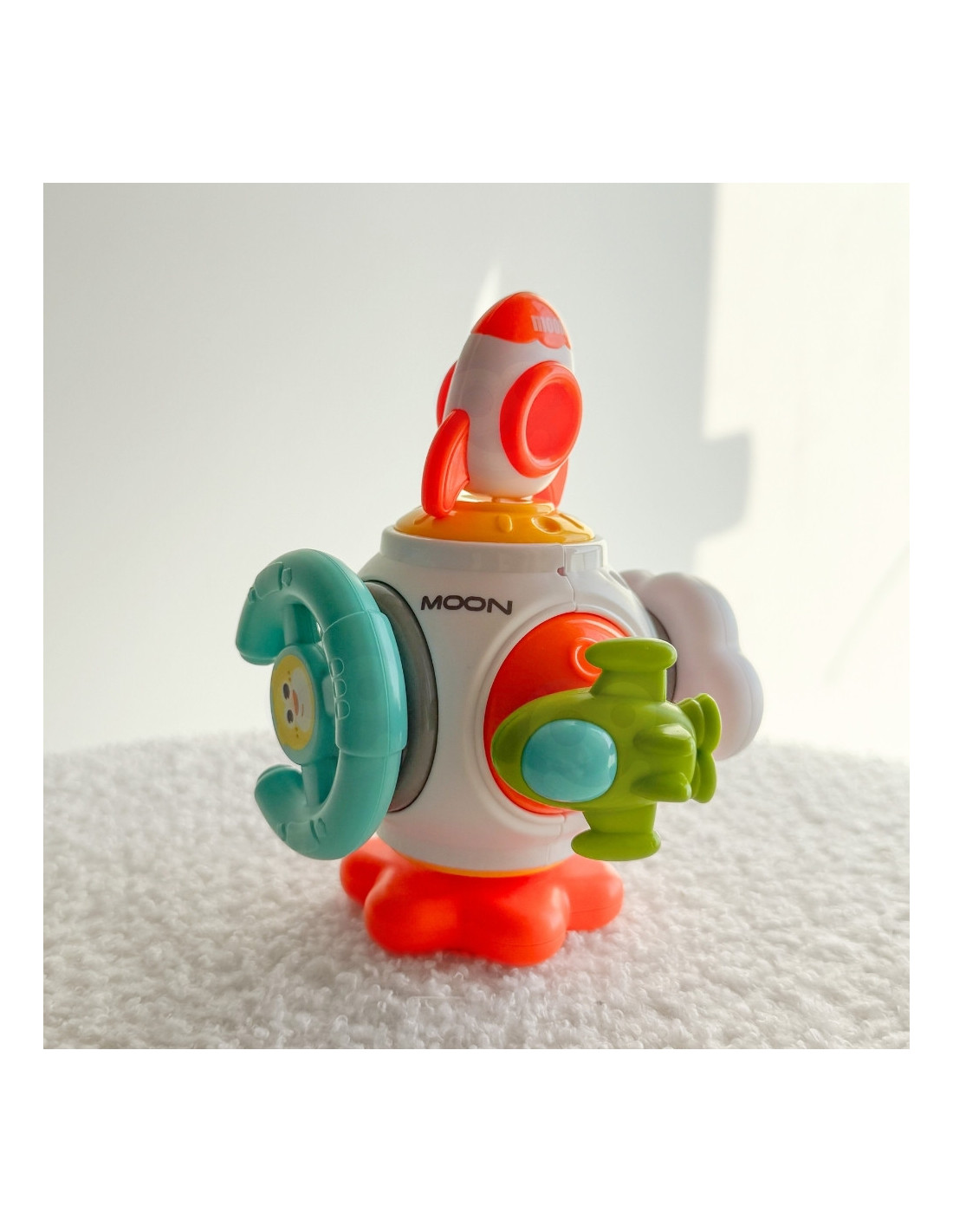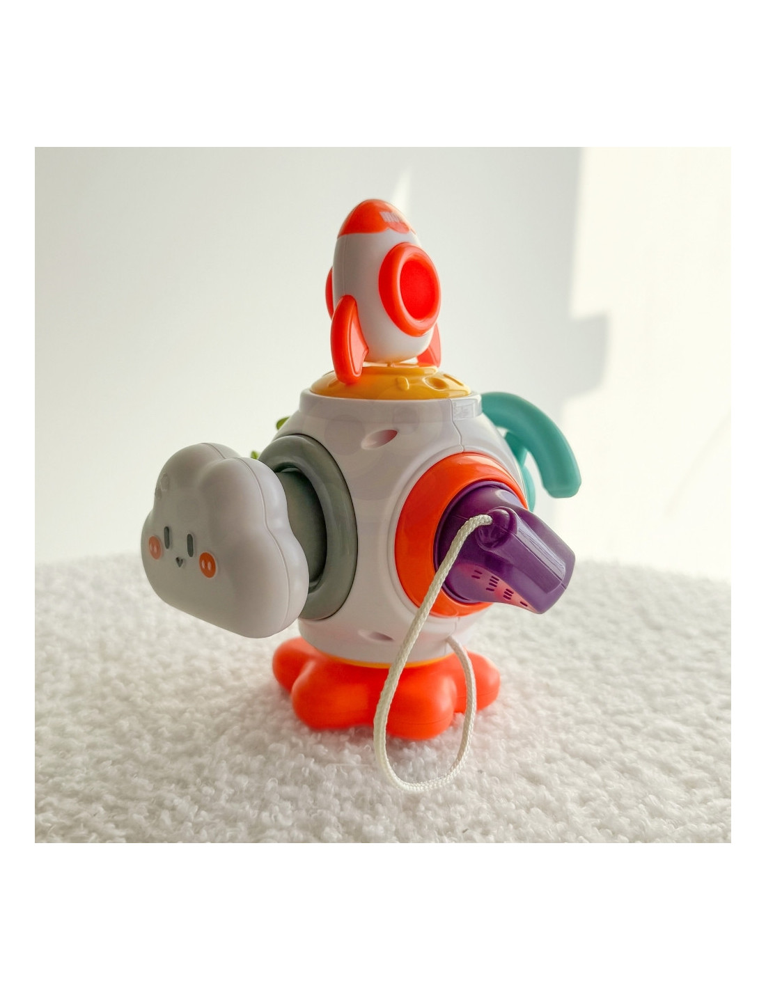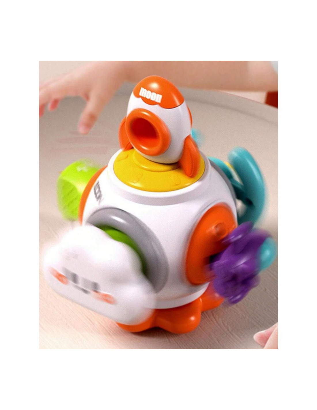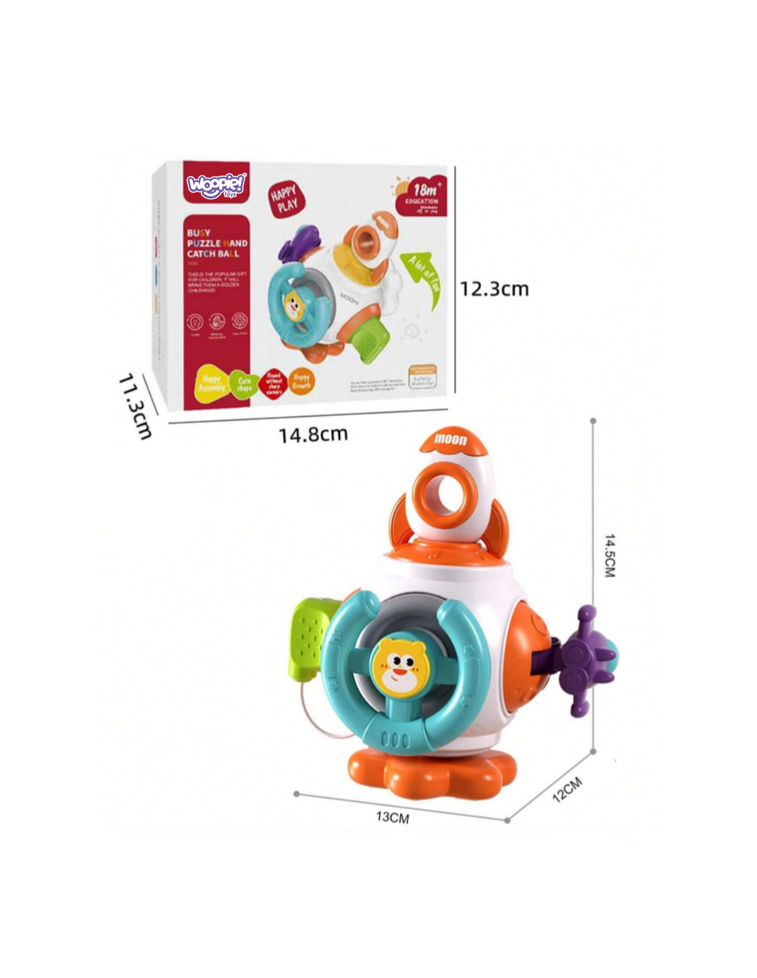 The Montessori Space Rocket Ball from WOOPIE is a colorful, educational sensory cube for children aged 18 months and up . It contains six activity panels that stimulate the child's senses and develop fine motor skills. Elements such as a steering wheel, cloud button, analog plug, spinner toys, rocket toys, and spaceship toys provide a variety of experiences. The toy is safe, made of high-quality materials, and designed with child development and safety in mind.