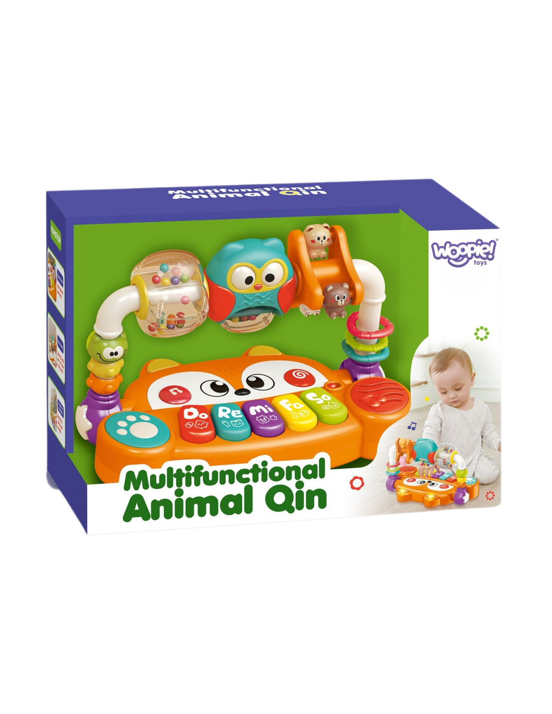 Looking for a toy that will not only keep your little one occupied for a long time but also support their development from the first months of life? This interactive educational piano from the Woopie brand combines music, light, color, and movement, making it the perfect companion for everyday play, learning, and exploration! Its clever design distinguishes it – it's designed in the shape of a cheerful fox with large eyes and a charming face that captures baby's attention. Colorful keys with musical notes support early musical learning, while LED light effects synchronized with sound make play a true sensory experience! Additional elements such as a rotating owl with rattles, rotating animal figures , and colorful rings provide a variety of stimuli and inspire physical activity. The toy allows you to independently switch modes, giving your child a sense of control and motivating them to continue exploring. It's the perfect gift for a baby, supporting sensory, musical, and cognitive development in a safe and friendly way. This toy is made of non-toxic, durable materials , and all edges are rounded and smooth—perfect for little hands. Let your little one discover a world of sounds, rhythm, and color from a young age—all in one magical educational toy!