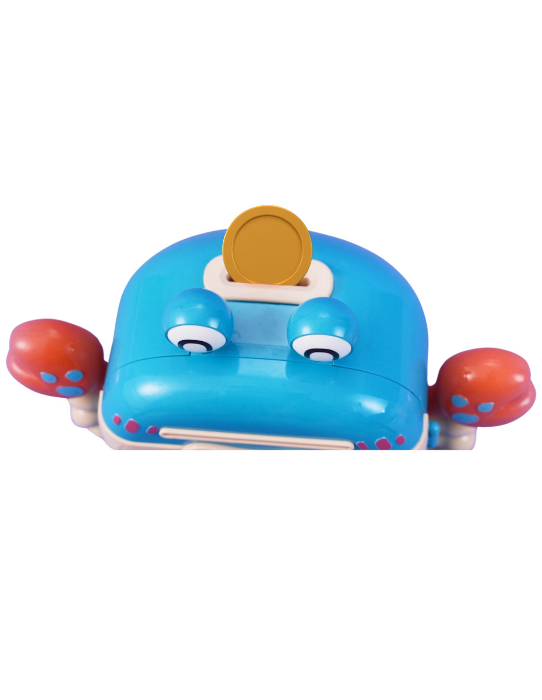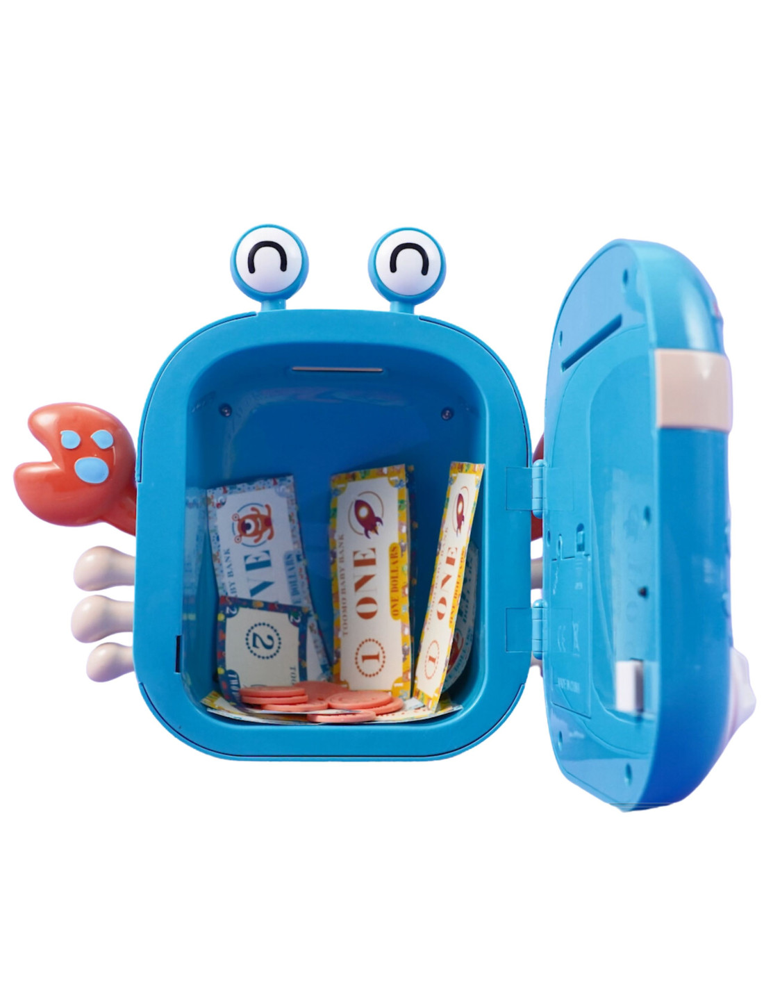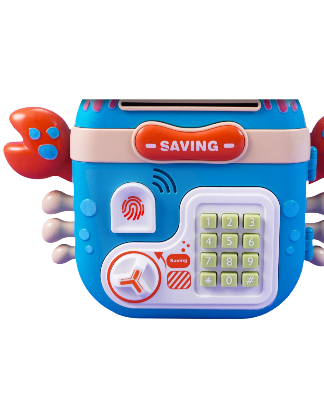 The WOOPIE Electronic Code Piggy Bank is a multifunctional product your child will surely love! The crab is designed to store coins, banknotes, and other smaller toys. The piggy bank features special slots for banknotes and coins, a fingerprint reader , a keypad for entering the code , and a knob for opening . Furthermore, the Electronic Crab makes sounds! If necessary, the toy can be easily reset and a new code set.