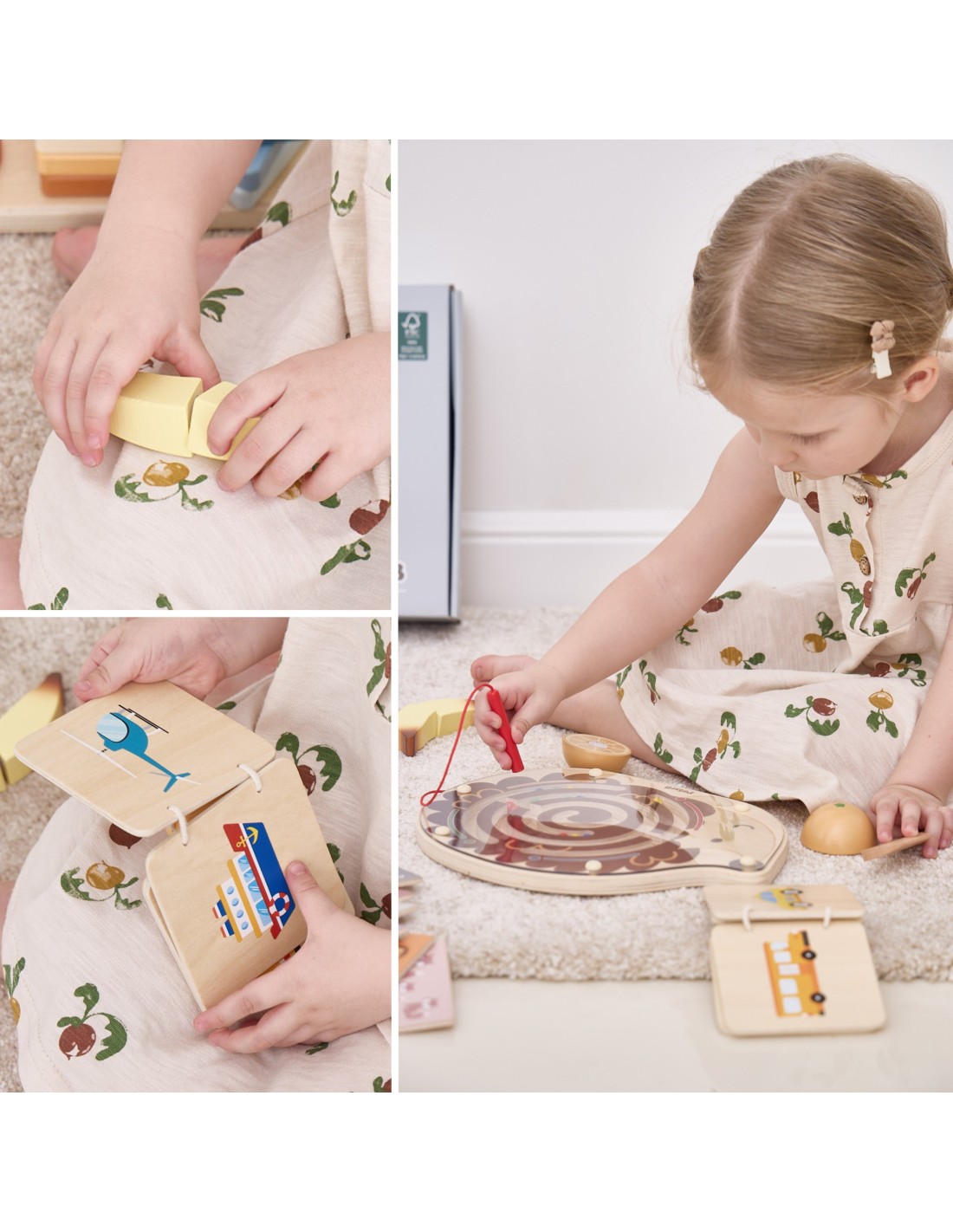 - wooden book (vehicles) – the book teaches children about different means of transport, such as a bicycle, a balloon, an airplane or a school bus