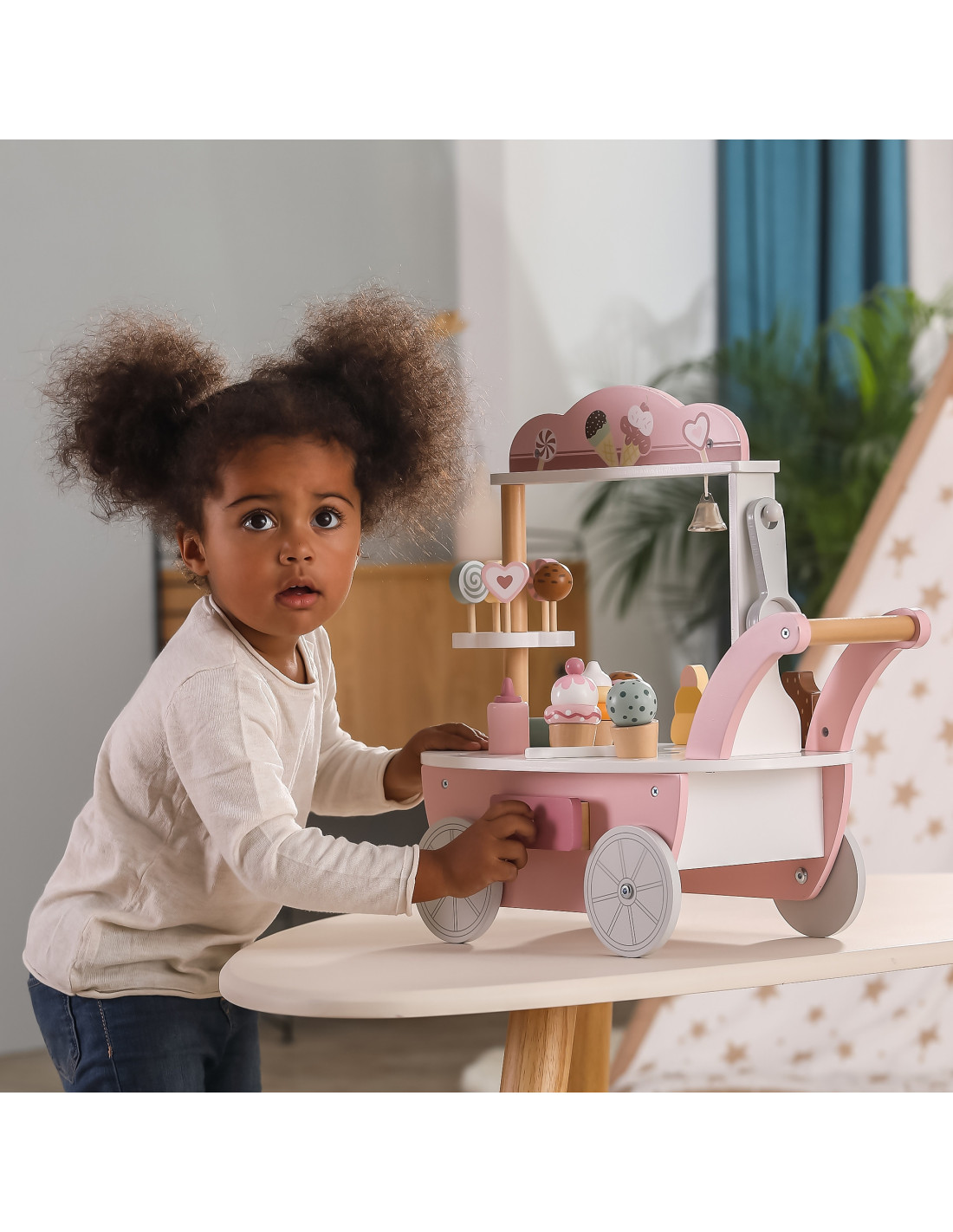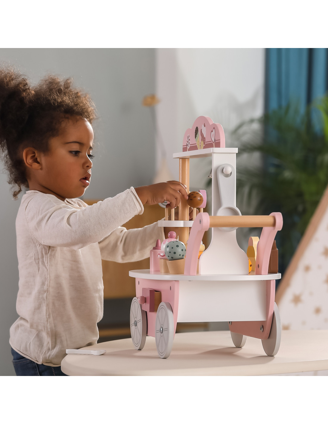 The 3-in-1 Shop, Confectionery, and Ice Cream Parlor from the PolarB series is a perfect gift for little confectioners. The set is perfect for a child who wants to take on the role of a salesperson or confectioner. This toy will make your child feel like a professional sweets seller . The toy includes many smaller accessories such as lollipops, ice cream, wafers, and toppings. The cart features a shelf that can be opened and stored. The entire set is painted with non-toxic paints in soft colors that attract children's attention.