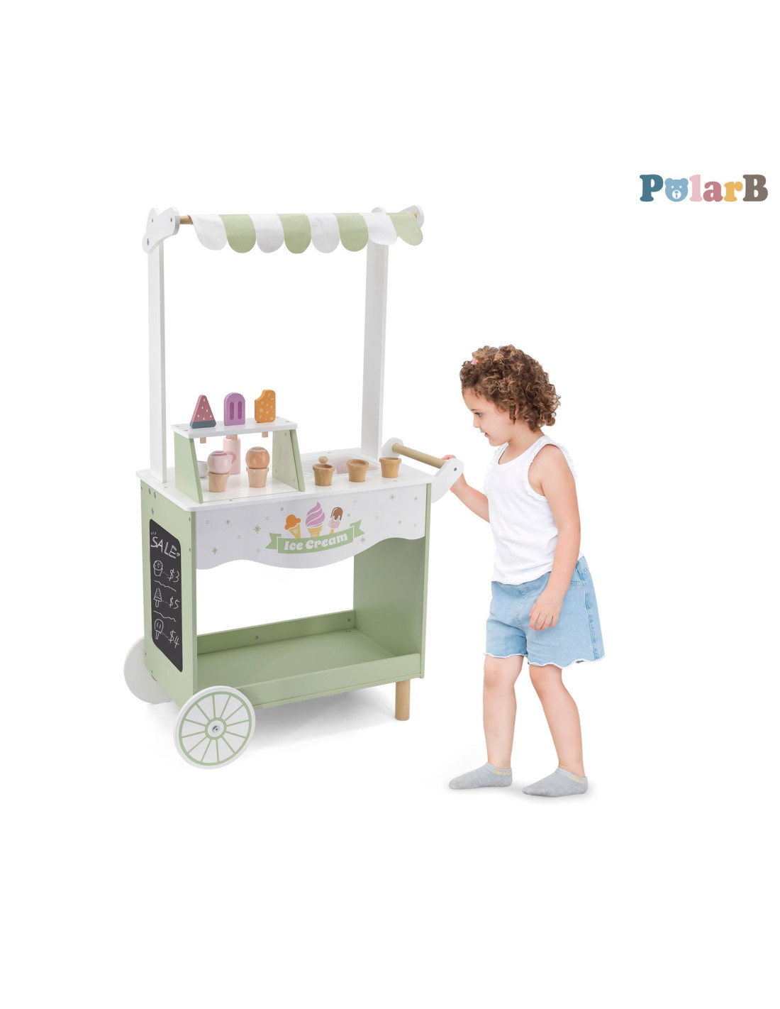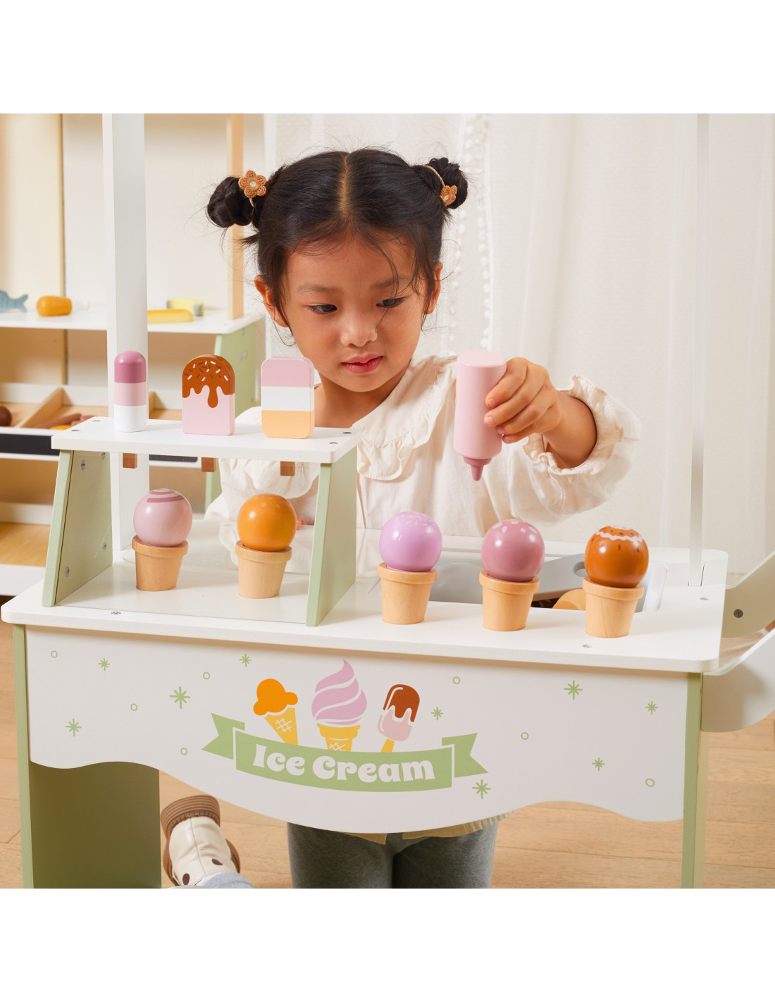The Large Wooden Ice Cream Stand from Viga comes equipped with beautifully crafted ice cream, cones, popsicles , and even a magnetic scoop for even more realistic ice cream vendor play. Scoops of ice cream can be scooped freely using the magnetic scoop. The side features a chalkboard for writing menus. The bottom of the cart features a storage shelf. The included wheels make it easy to move from place to place. This set allows children to develop their imagination, social skills, and language skills through play.