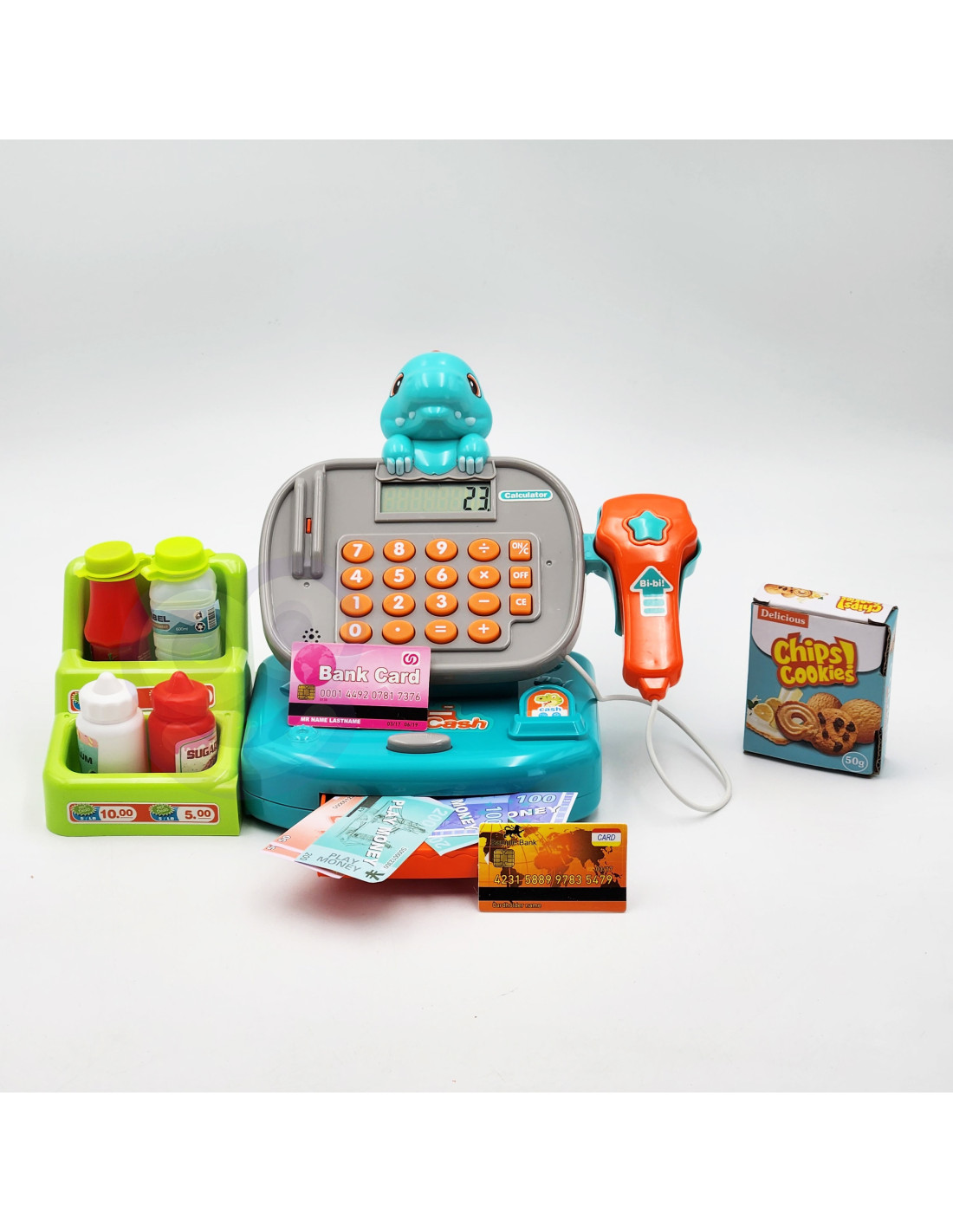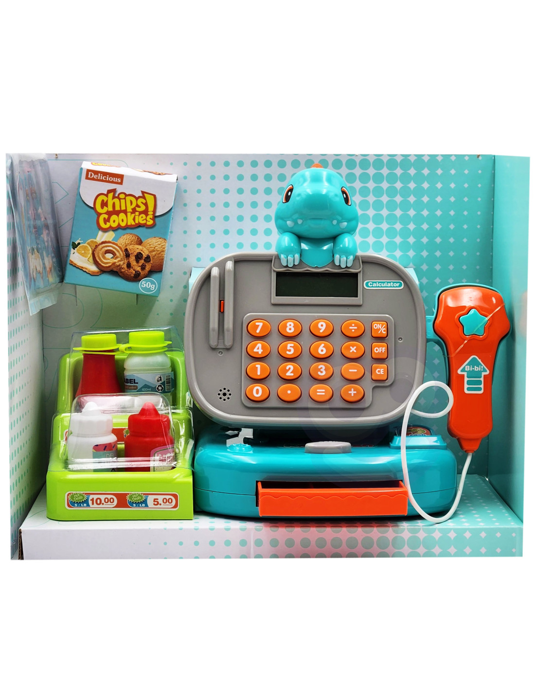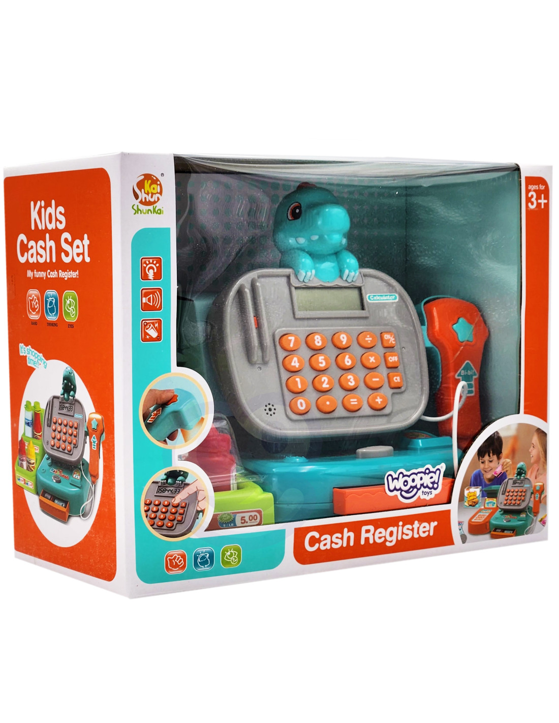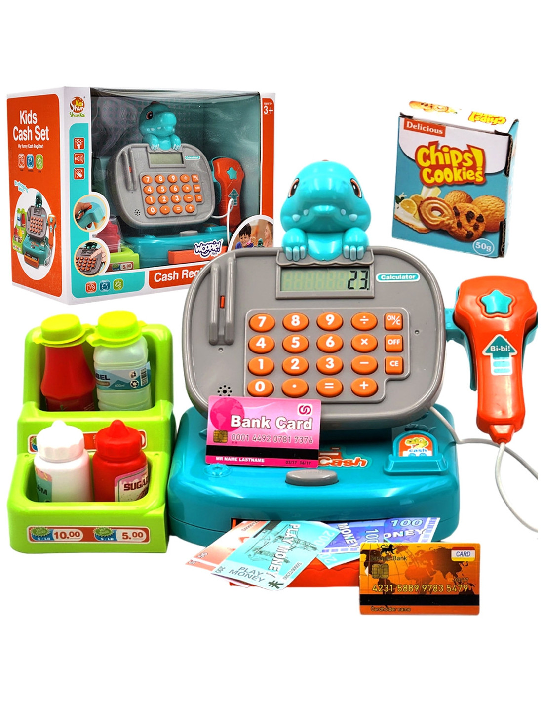 The Dino Cash Register with Shelf from WOOPIE is the perfect play device. Children can select the products they want to buy and then place them on the register. They can scan cookies and other items using the scanner. Customers can then pay with cash or a credit card.