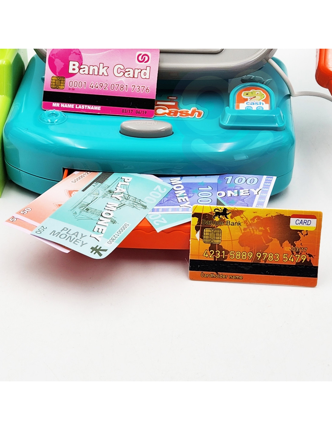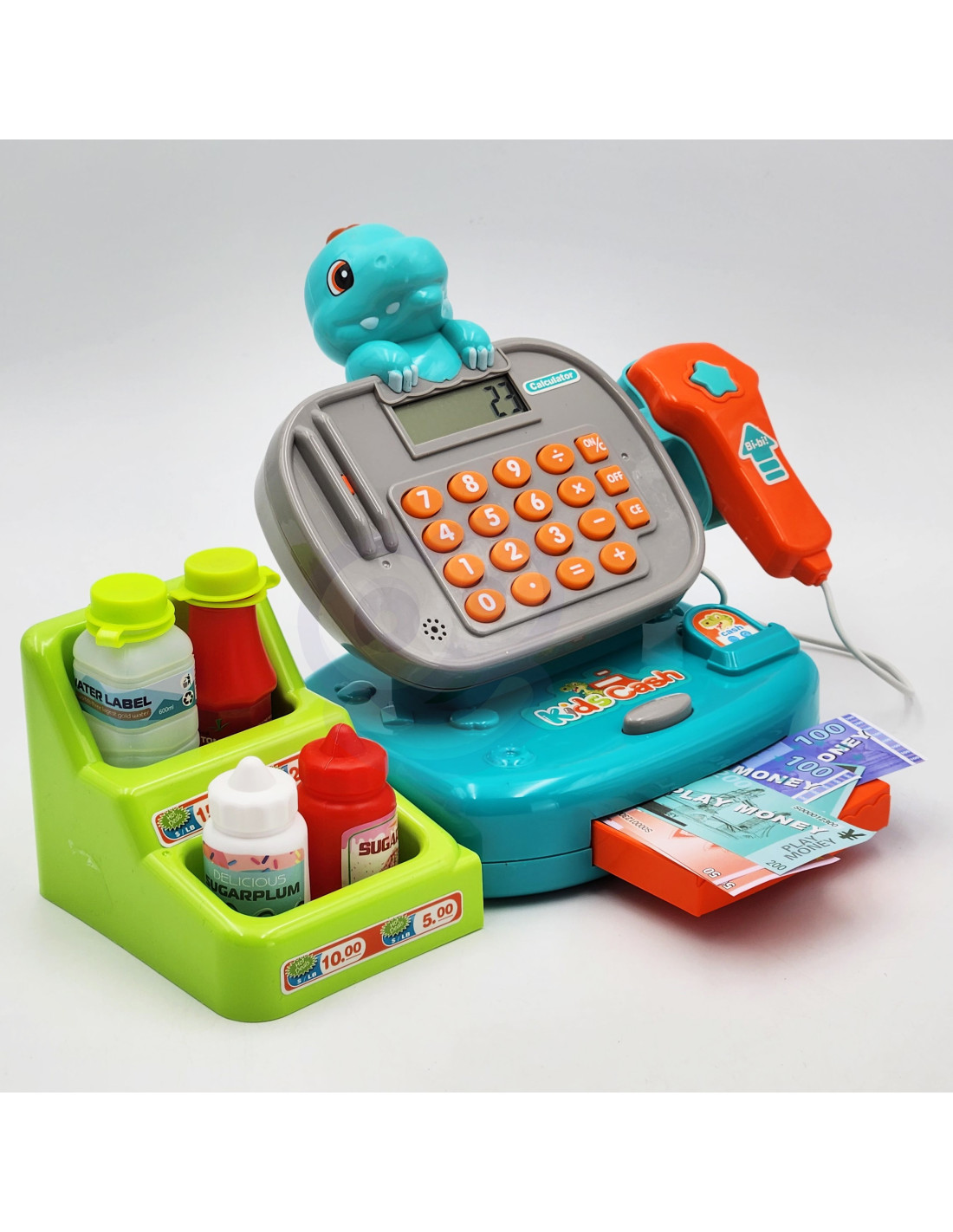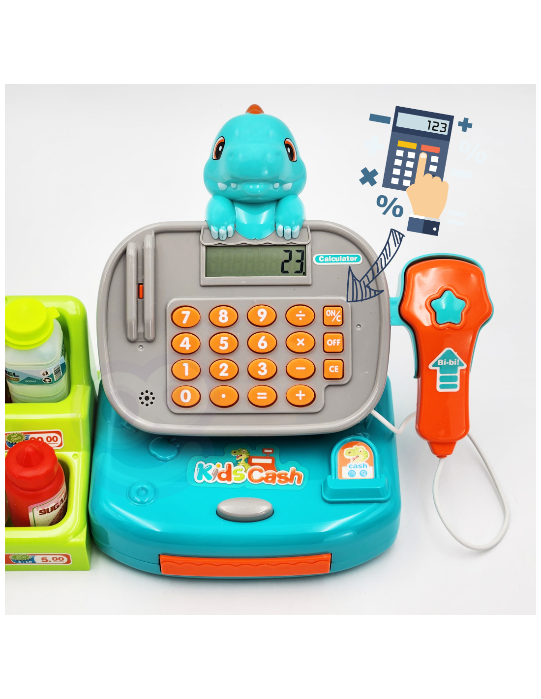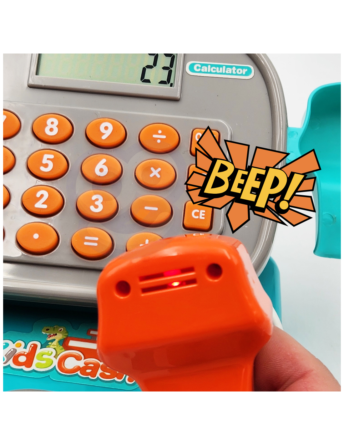 The Dino Cash Register with Shelf from WOOPIE is the perfect play device. Children can select the products they want to buy and then place them on the register. They can scan cookies and other items using the scanner. Customers can then pay with cash or a credit card.