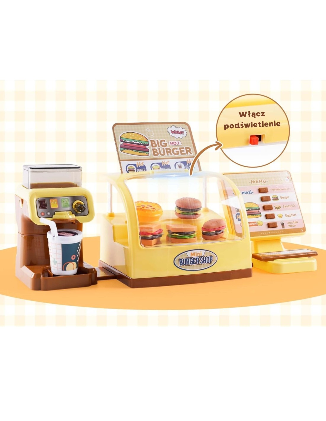 Woopie's Interactive Burger Shop – Cash Register Restaurant and Fast Food Kitchen is a unique toy that transports children to a world full of flavor, fun, and imagination. It allows every child to feel like a real chef or salesperson at a popular burger joint. The set combines kitchen, shop, and restaurant elements, offering endless role-playing possibilities. The set is designed to faithfully replicate a real food court. It includes a mini display case with LED lighting for displaying burgers, a beverage dispenser with a water dispensing function , and a touch-screen cash register with a menu , allowing children to take orders and give change. Numerous accessories complete the set – burgers, sandwiches, drinks, coins, a payment card, and trays and boxes imitating real fast food sets. Colorful, aesthetic graphics and child-friendly shapes encourage creative play. Toddlers learn communication, logical thinking, and planning, while also developing manual dexterity and imagination.