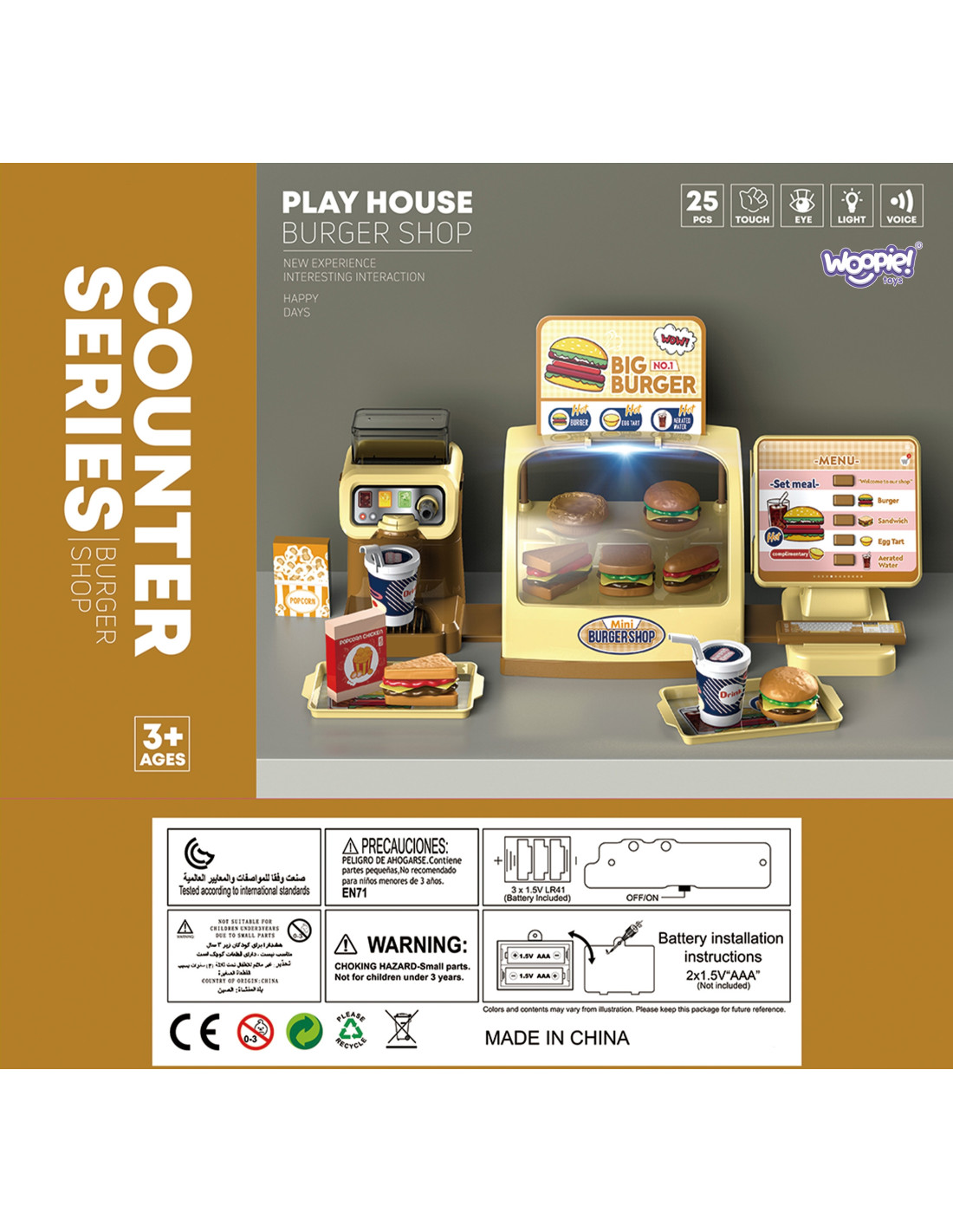 The Mini Burger Shop "BIG BURGER" from WOOPIE is a fantastic play set. Customers can serve their favorite dishes straight from the illuminated counter! It features a screen with buttons that, when pressed, trigger sound effects! You can pour water into the dispenser and into specially designed cups with straws. This set develops manual skills, imagination, creativity, and independent thinking.
