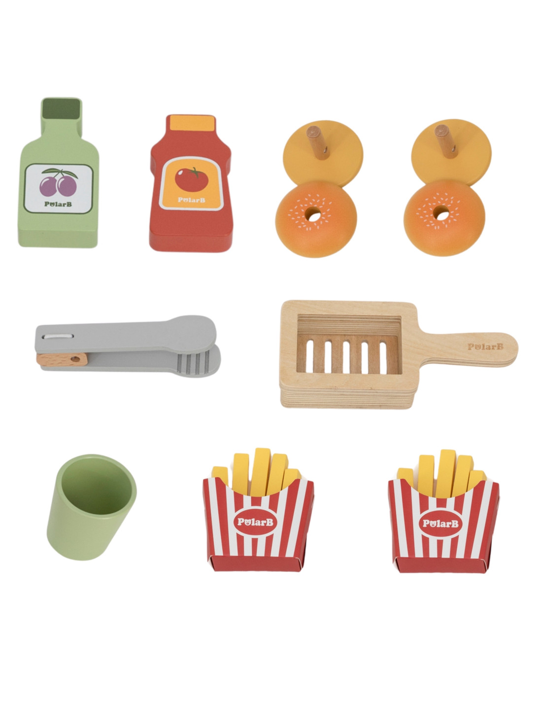 - - 46 accessories including buns, cutlets, vegetables, fries, ketchup, olive oil, tongs and play money