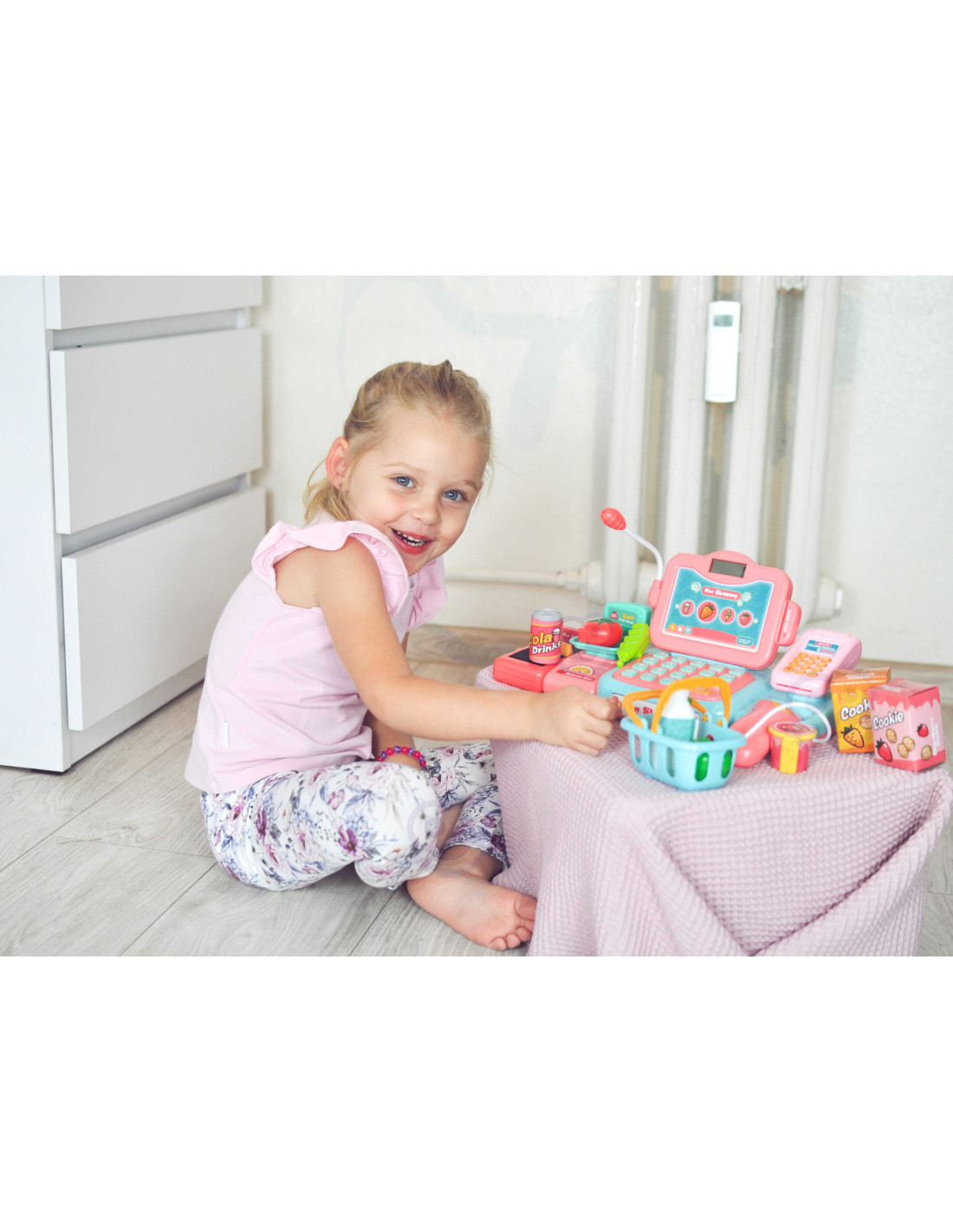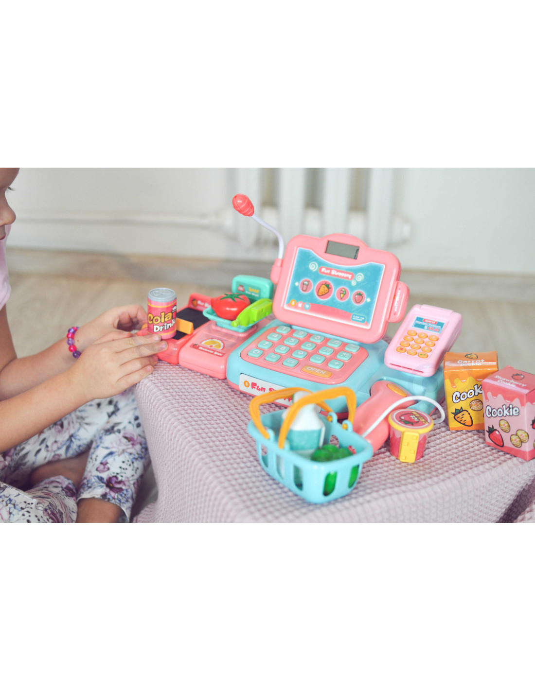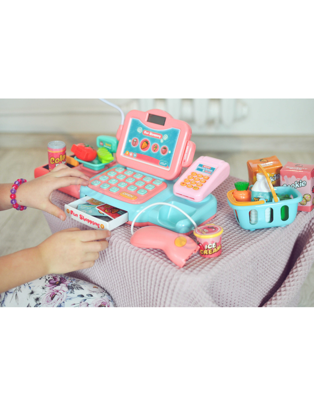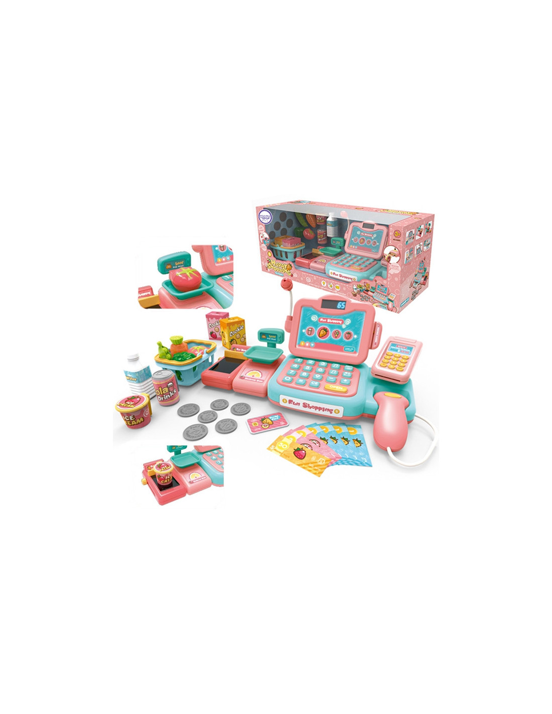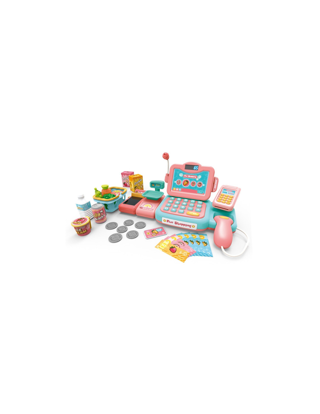 The Woopie Grocery Cash Register with many accessories is perfect for children aged 3 and over . This toy develops children's imagination and encourages creative thinking . Children can weigh fruits and vegetables and then use the keyboard to load them onto the register. Using the scanner, children can scan a package of cookies or a bottle of water. They can then pay in two ways: traditionally with cash or with a payment card . All of this is included in the set and will provide children with hours of fun.