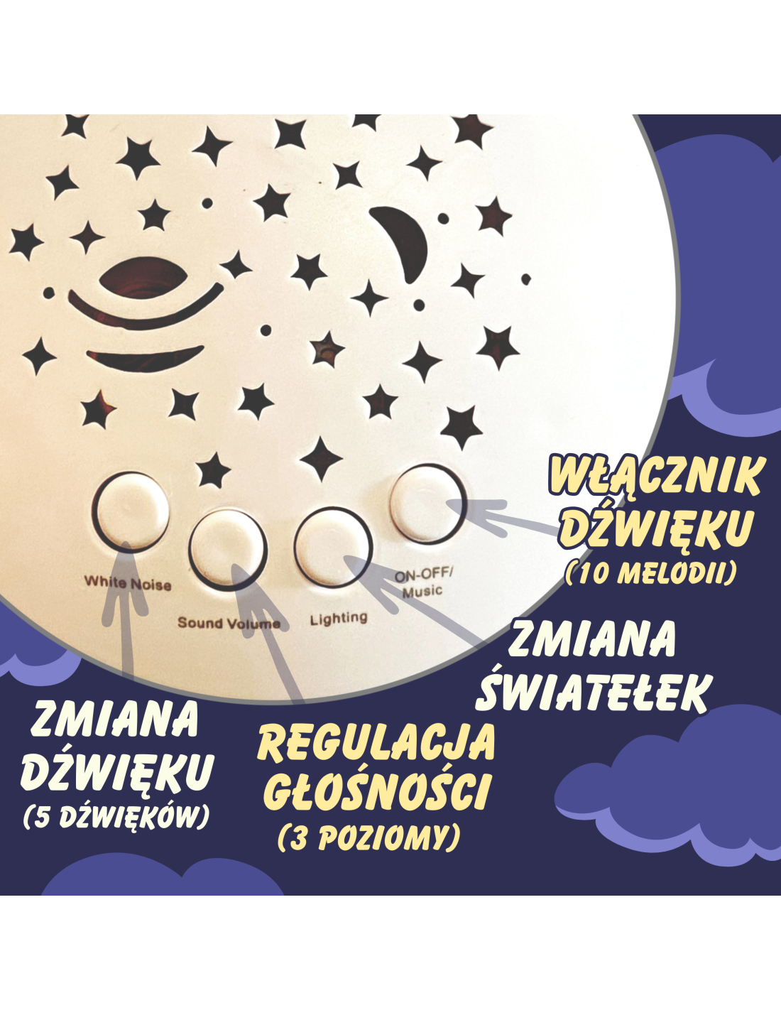 - - light and sound effects - melodies/lullabies to help you fall asleep + a color-changing projector ,