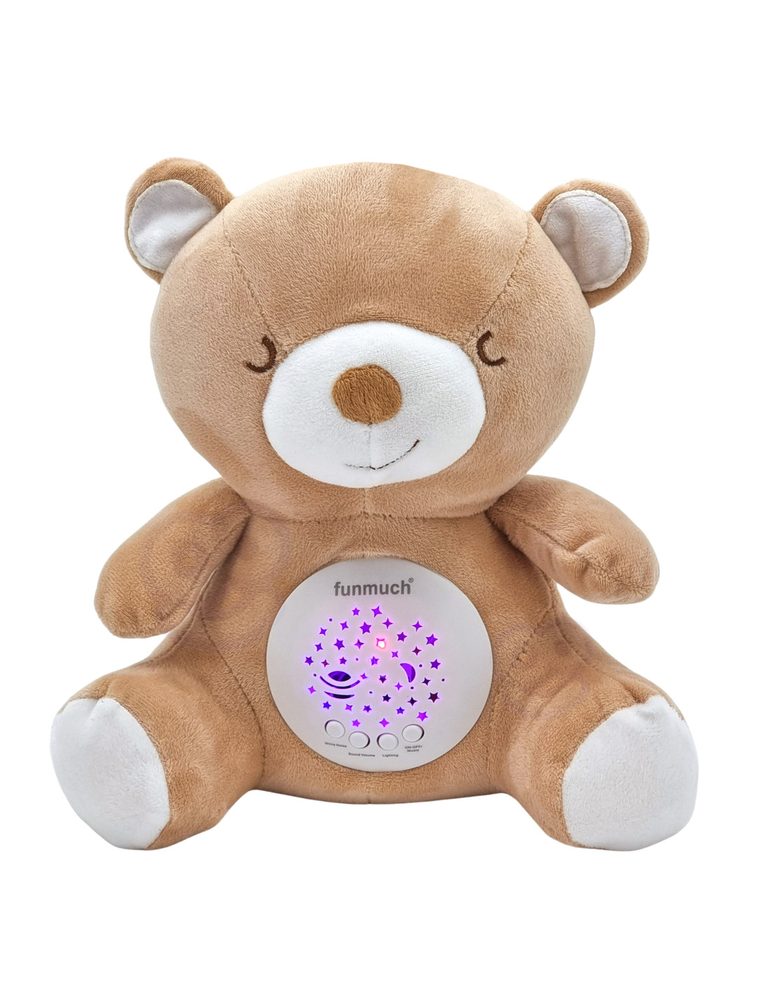 The Woopie Teddy Bear Sleeper will be a charming sleep companion for your little one. It's perfect for babies and older children who don't like to fall asleep on their own. The bear will be the perfect companion for good dreams and a savior from the monsters in the closet. This cuddly toy has four functions . When you turn it on, you'll hear melodies, and the belly will shimmer with different colors. Press the "White Nose" button to hear various noises and a heartbeat . The toy also has up to 10 different lullabies and the ability to set 3 volume levels to adjust the sound to the baby's preferences and make sure that he or she does not wake up while sleeping. The toy is suitable for infants, so it's filled with soft cotton. Furthermore, the plush toy can be safely and easily cleaned by removing the mechanism and then easily reassembling it. This means that even older children can use the toy as a cuddly toy without the mechanism. Every child will fall in love with the teddy bear !
