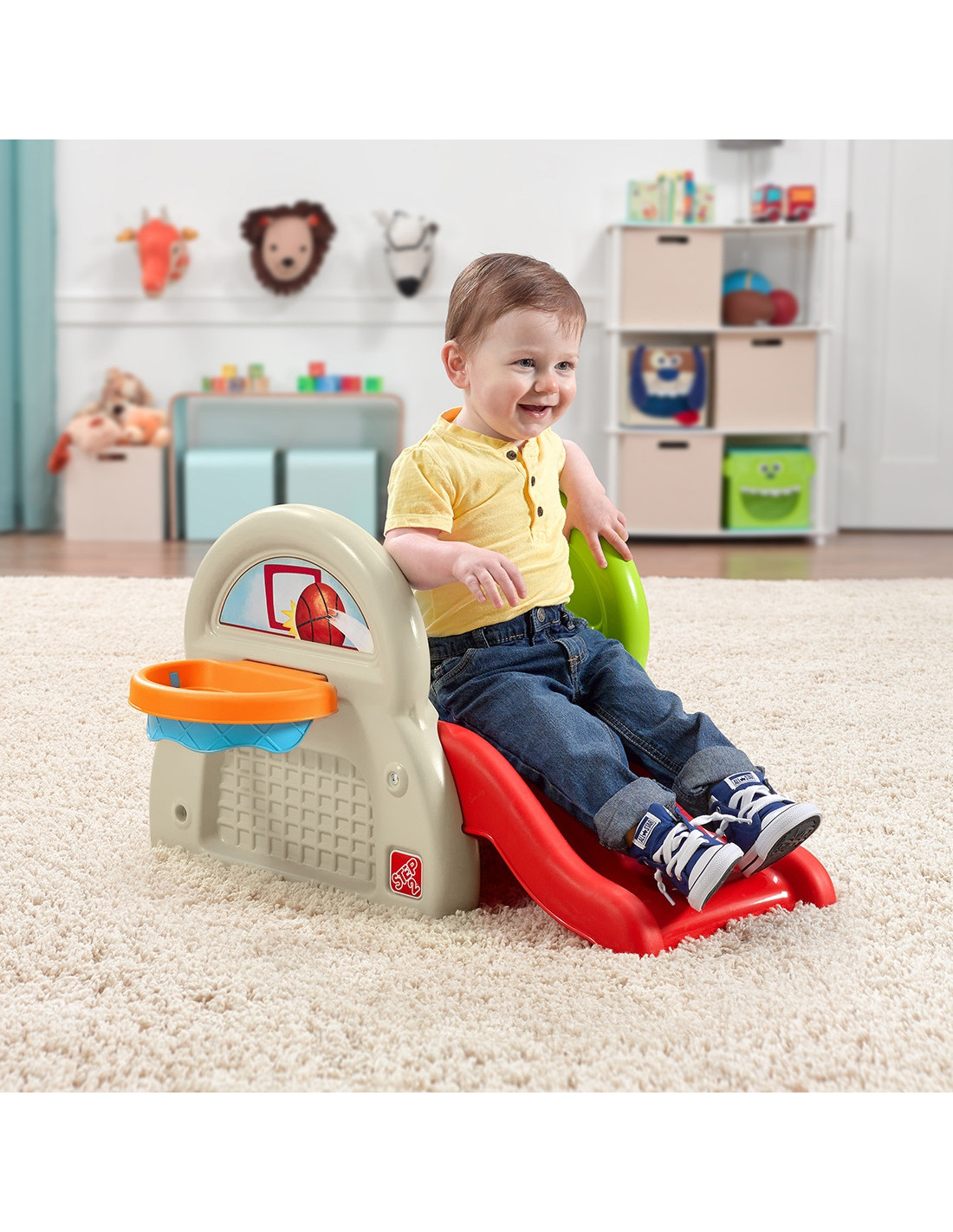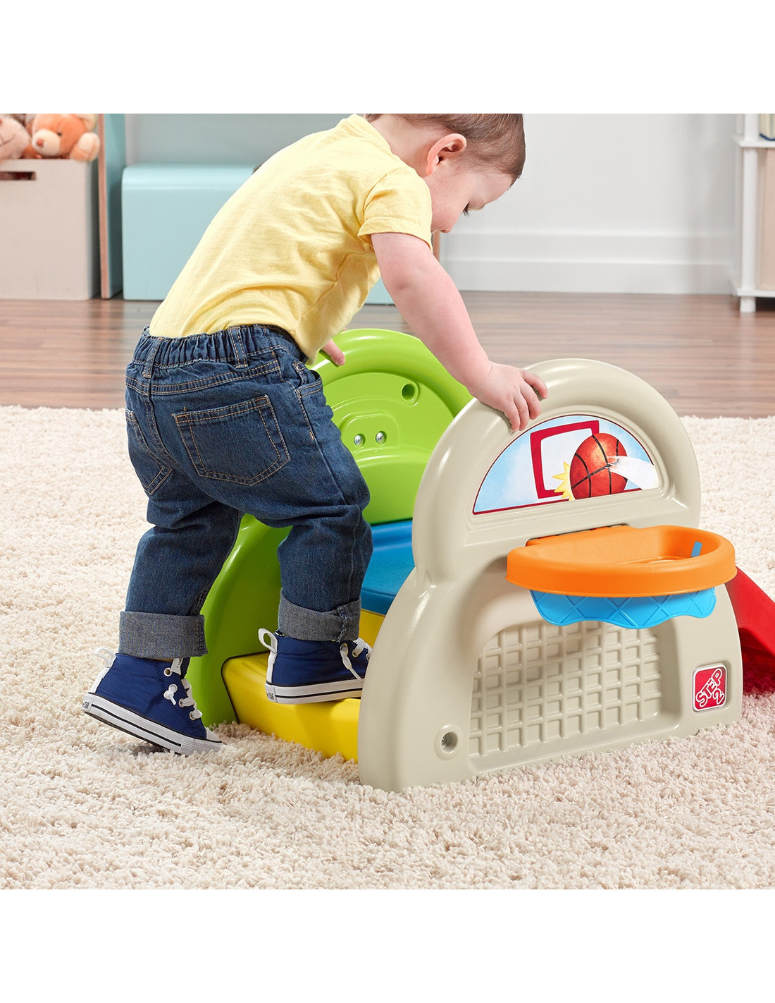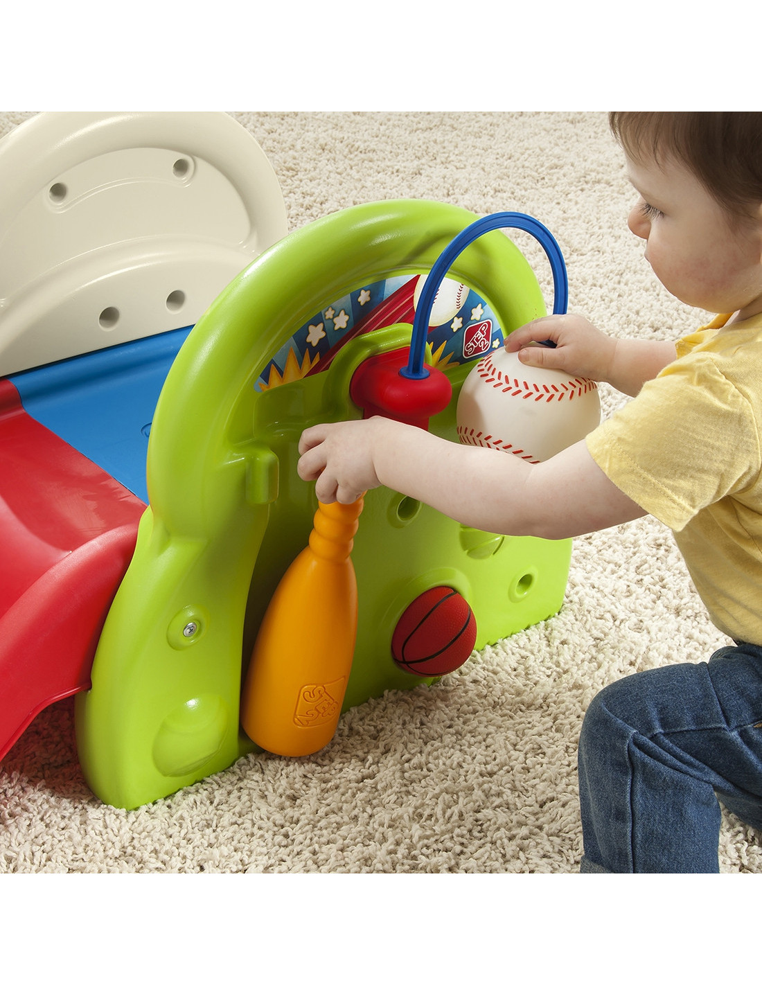 This STEP2 playground offers many ways to play. This engaging activity center for toddlers is primarily sports- themed. Kids can practice balance and motor skills by climbing the extra- wide step and sliding down the slide on the other side. There's also a ball and a basketball hoop for little ones to dunk into the goal. You can also use the included bat to hit the tethered baseball ! With this sports toy, designed especially for little ones, your little bug will be jumping home, sliding into the home plate, and making amazing dunks while having fun. When playtime is over, use the built-in storage compartment to store the basketball and press the bat onto the activity center's exterior wall to keep everything close for the next day of play.